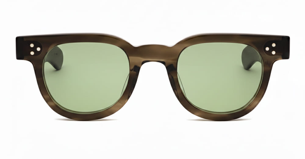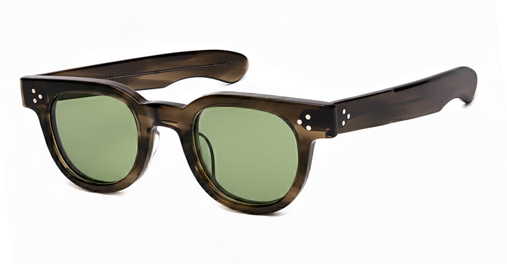 Julius Tart FDR 48X24 - OLIVE GREEN SASA / GREEN LENS (JTPL-105SP-2B-GN-30) are vintage-inspired round sunglasses made in Japan. They feature olive green acetate frame, three-dots pins on front and temples, spatula acetate temples, and green lens with 100% UV protection.