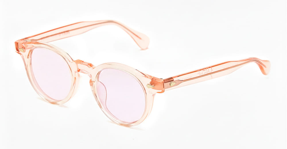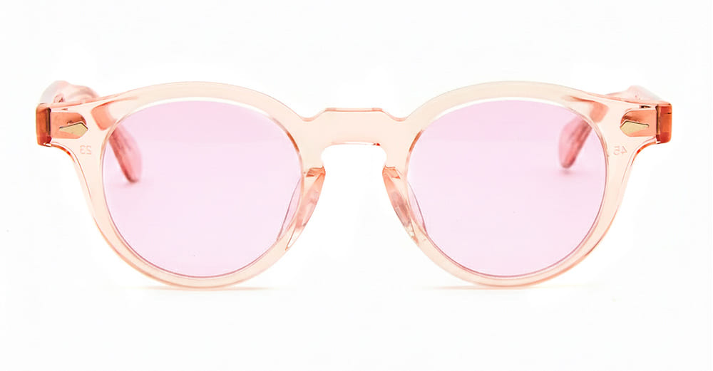 Julius Tart HAROLD 43/23 - FRESH PINK / PINK LENS (JTPL-021H-4B-FP-06) are vintage-inspired panto sunglasses made in Japan. They feature transparent pink acetate structure with distinctive keyhole bridge, horizontal diamond-shaped front pins on front and temples, pink lens with 100% UV protection.