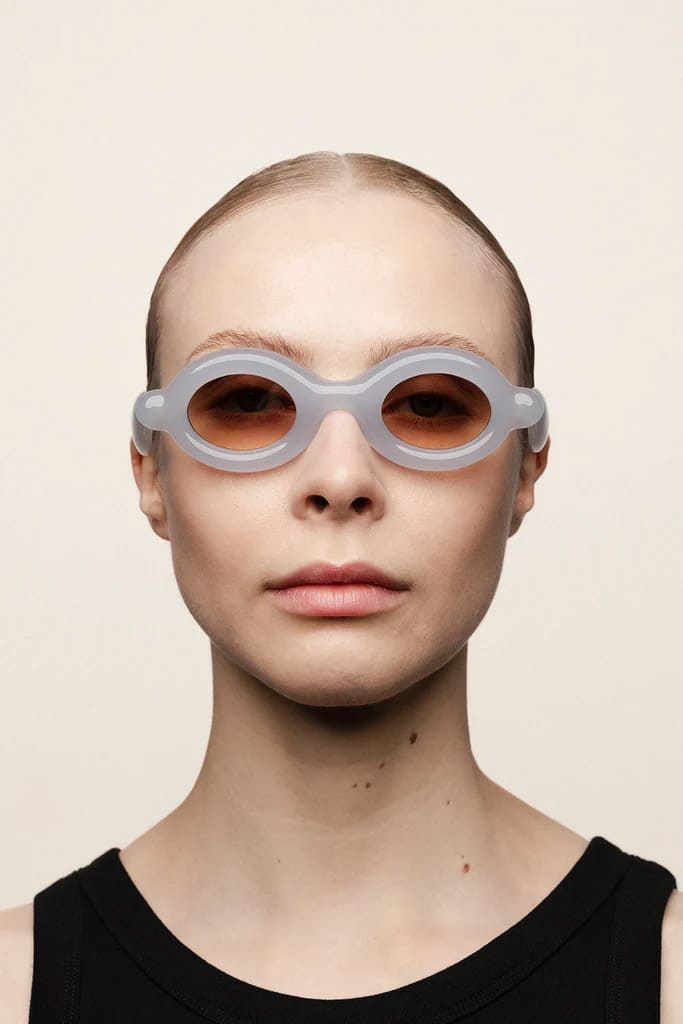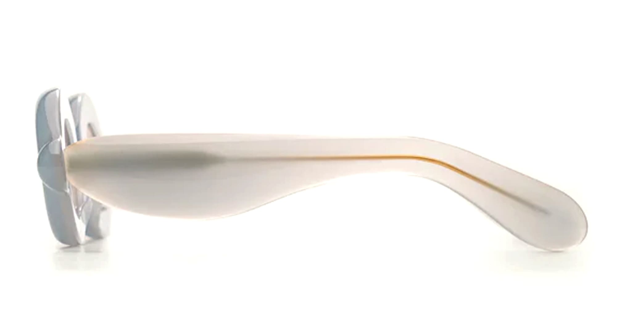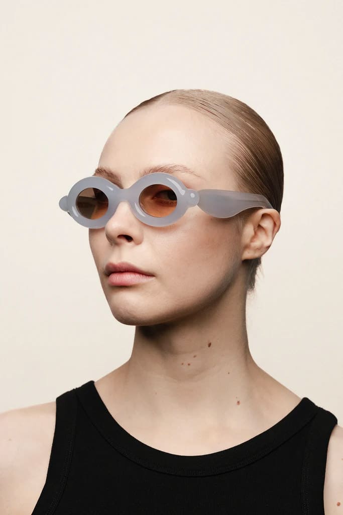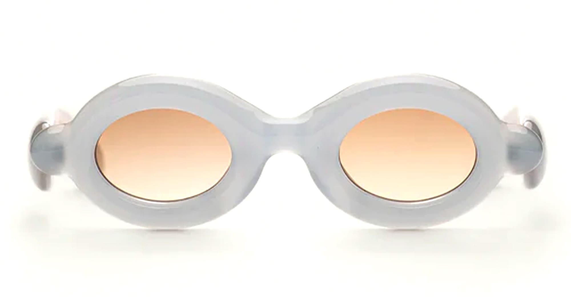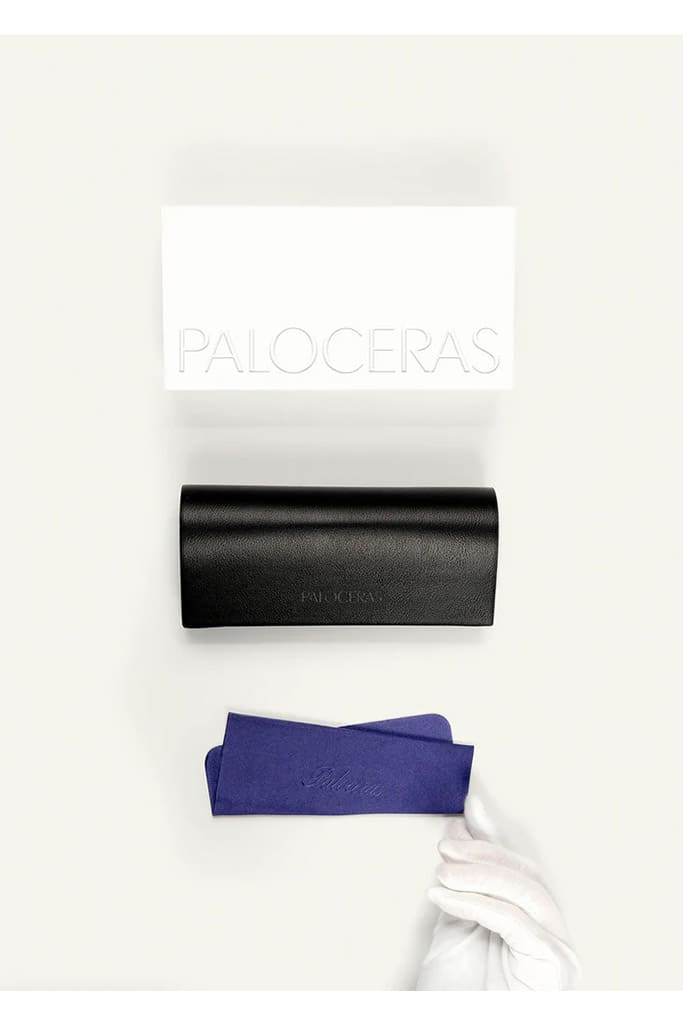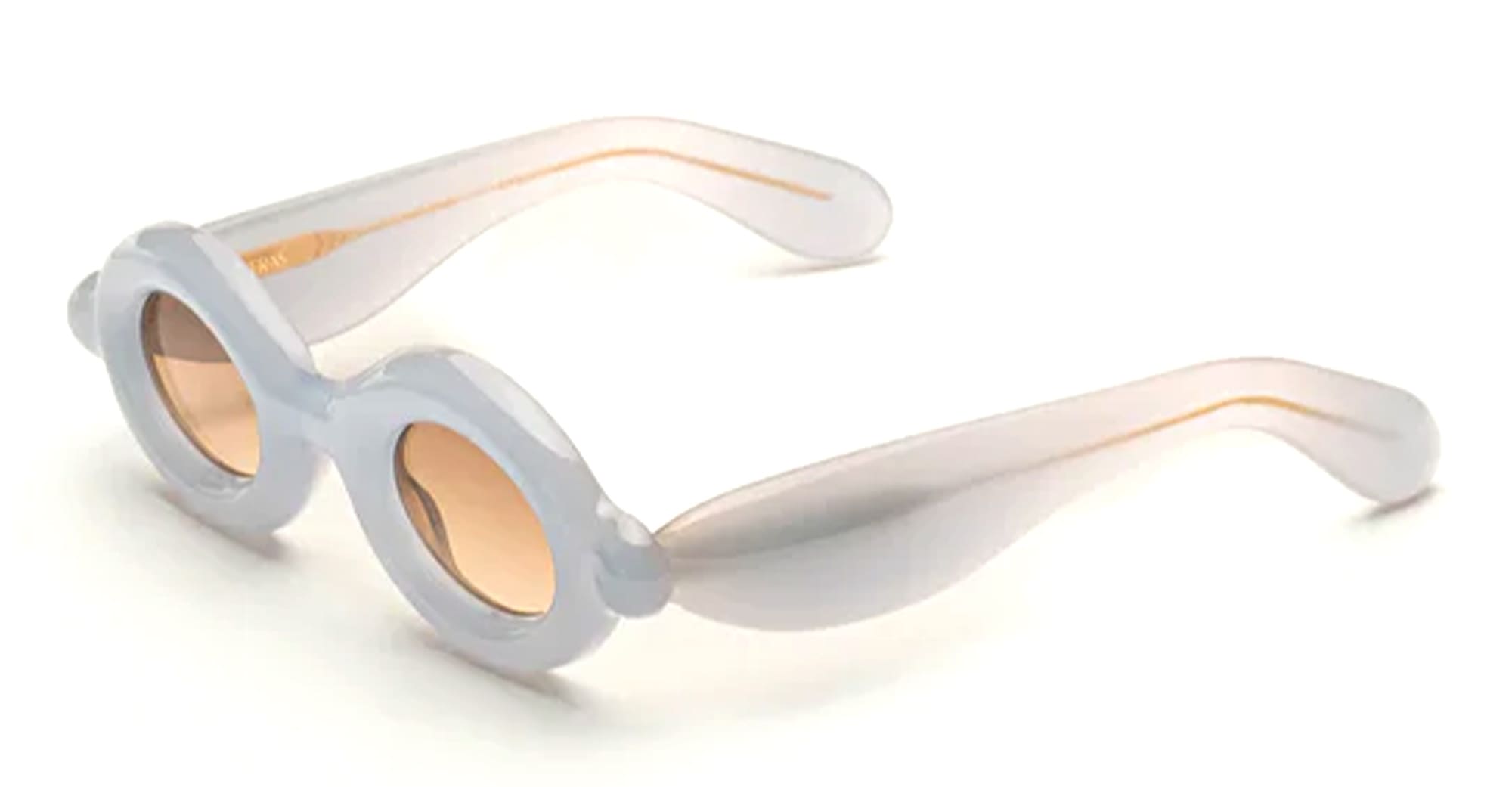 Paloceras PEBBLE - MILKY BLUE RX (MB-RX) are oval sunglasses with exaggerated, inflated volumes. They feature 8mm light blue cured Mazzucchelli acetate frame with DualLayer™ laminated construction, custom Visottica gold-plated wirecore and 5-joint hinge system, gold-tone engraving logo, and CR39 2 base orange lens with backside anti-reflective treatement and 100% UV protection.