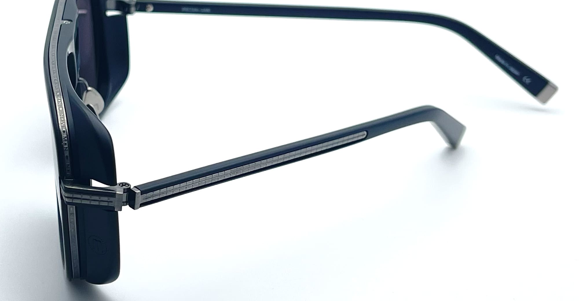 Matsuda M3023 V2 - ANTIQUE SILVER / MATTE BLACK (M3023-V2.SG.AS-MBK.55) sono occhiali da sole da navigatore prodotti in Giappone, versione per il 10° anniversario del classico M3023. Presentano una montatura in acetato giapponese nero opaco con titanio di alta qualità, decorazione con incisione firmata Matsuda e lenti grigie sfumate semi-piatte con protezione UV al 100%.