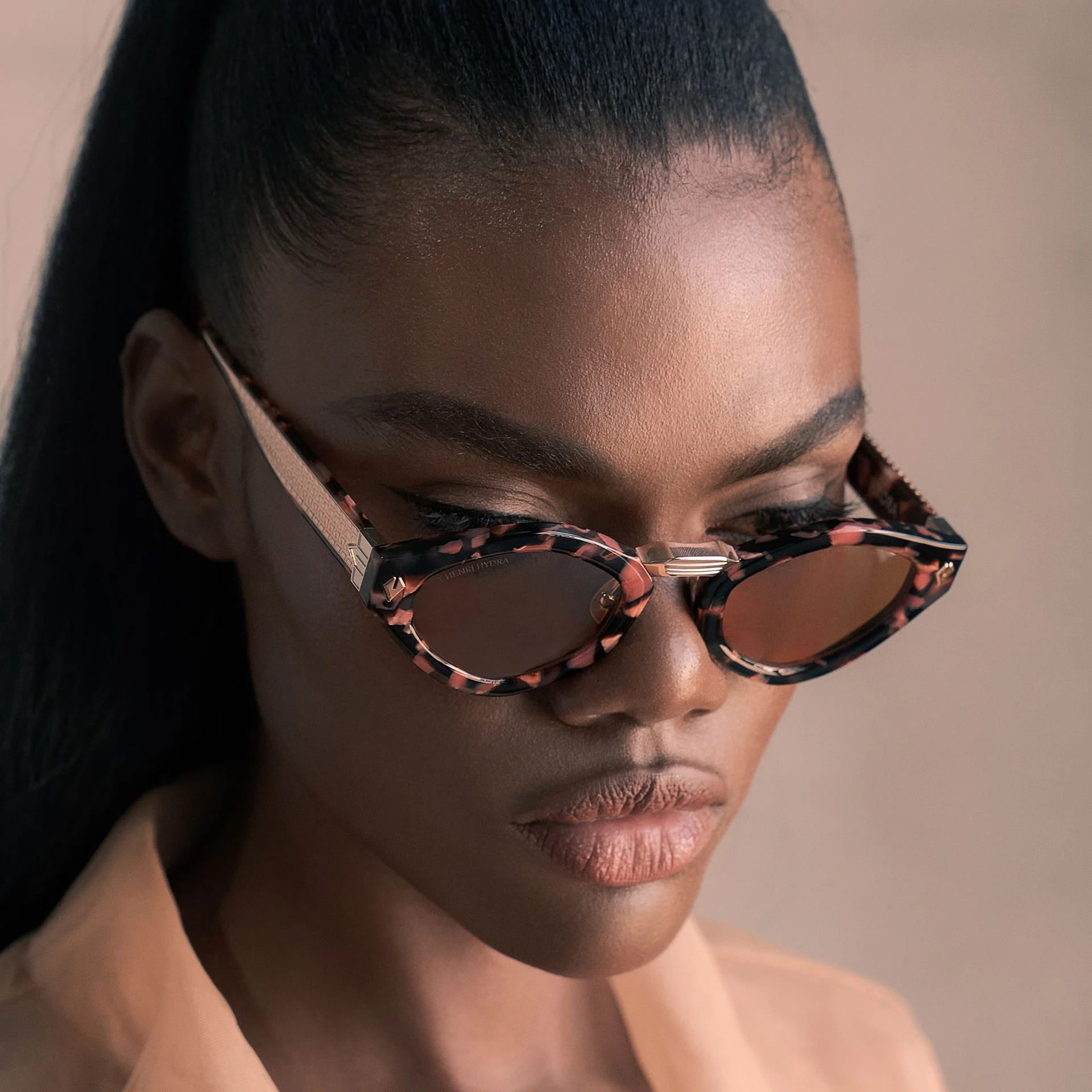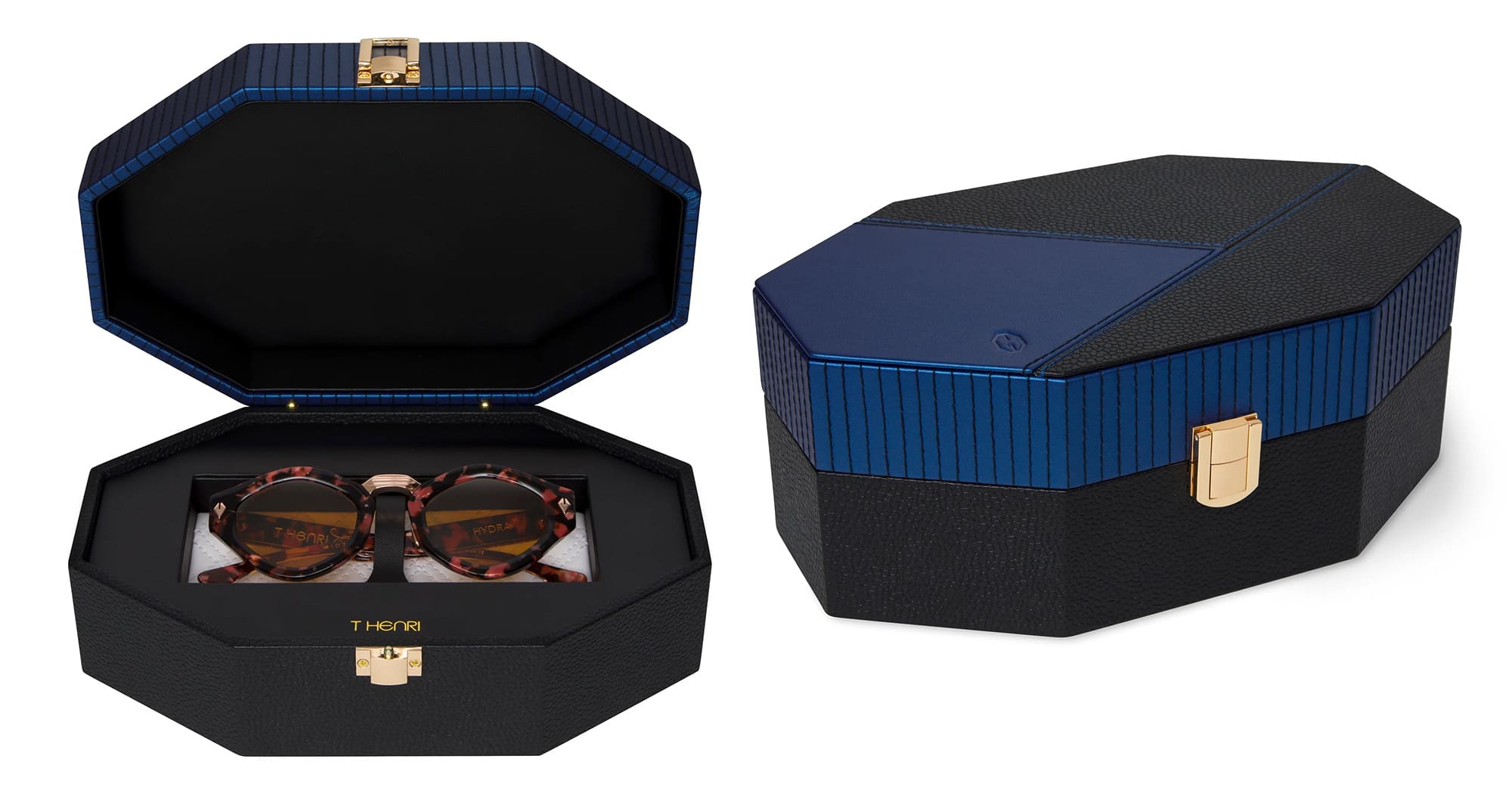 T HENRI HYDRA - MIZNER (HCS004) are exclusive diamond-shaped feminine sunglasses, part of a 1x time only super limited collection by T Henri. They feature 7mm tortoise Japanese cellulose block acetate frame, titanium front pins, 5mm cellulose acetate laminated and carved temples with exposed wirecore and two-tones 18K gold-plated details, titanium monoblock nose piece, custom non-slip grip on temples, orange Zeiss CR39 lens with anti-reflective backside and hard-coating treatments and 100% UV protection.
