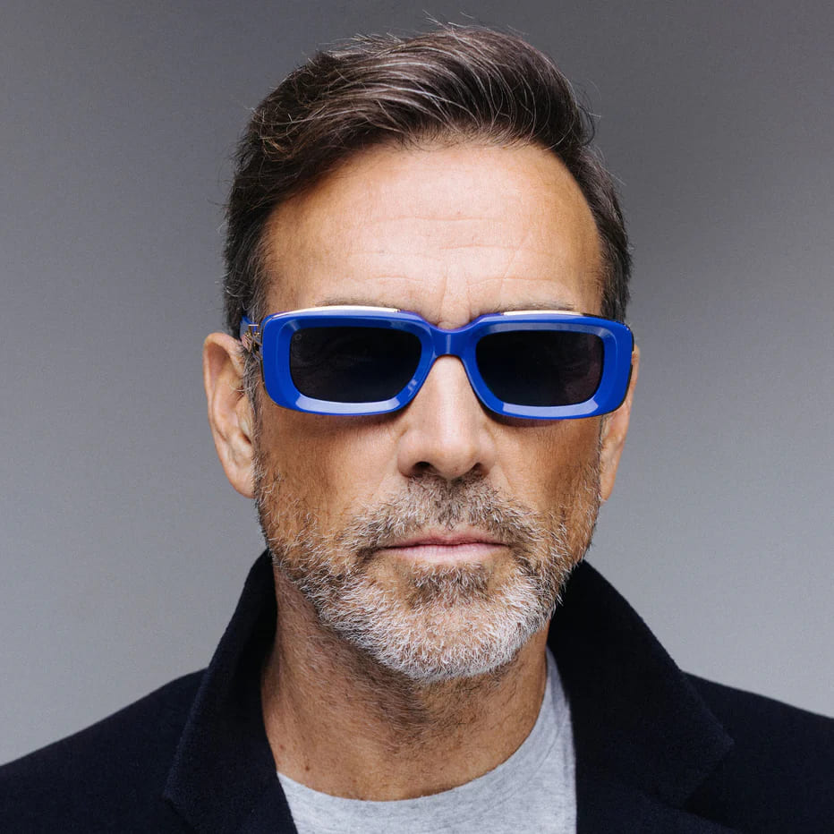 T HENRI YURUS - TRAVERSE (UCC) are exclusive rectangular sunglasses made in Japan, inspired by the Yurus supercar. They feature 10mm matte black plant-based Japanese acetate frame, iconic 18k gold plated titanium elements, double laminated acetate temples with custom non-slip grip, monoblock decor connections with tri-tone details, and grey 6 base CR39 lens with 100% UV protection.