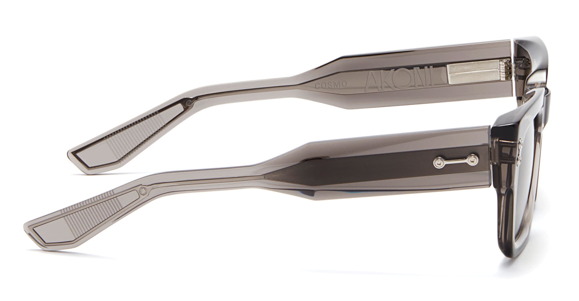 Akoni COSMO - GRIGIO SCURO CRISTALLO / NERO color palladio (AKS-114C-52) sono occhiali da sole squadrati prodotti in Giappone, un'interpretazione della classica forma Wellington. Presentano una montatura in acetato giapponese con cristalli grigi, rivetti personalizzati sul frontale e sul lato, aste scolpite in acetato laminato con nucleo in titanio a vista e lenti color oliva scuro con protezione UV al 100%.