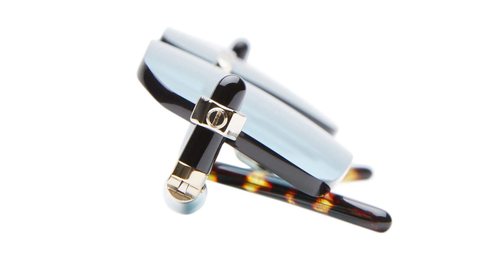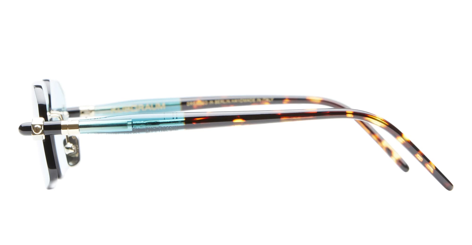 Kuboraum MASK P64 LG GH - LIGHT GOLD (KRSP64LGGH00004E) are rectangular rimless sunglasses with a retro lens shape. They feature light gold metal structure, iconic bi-color Kuboraum acetate round temples, custom hinge, and light blue lens with 100% UV protection.