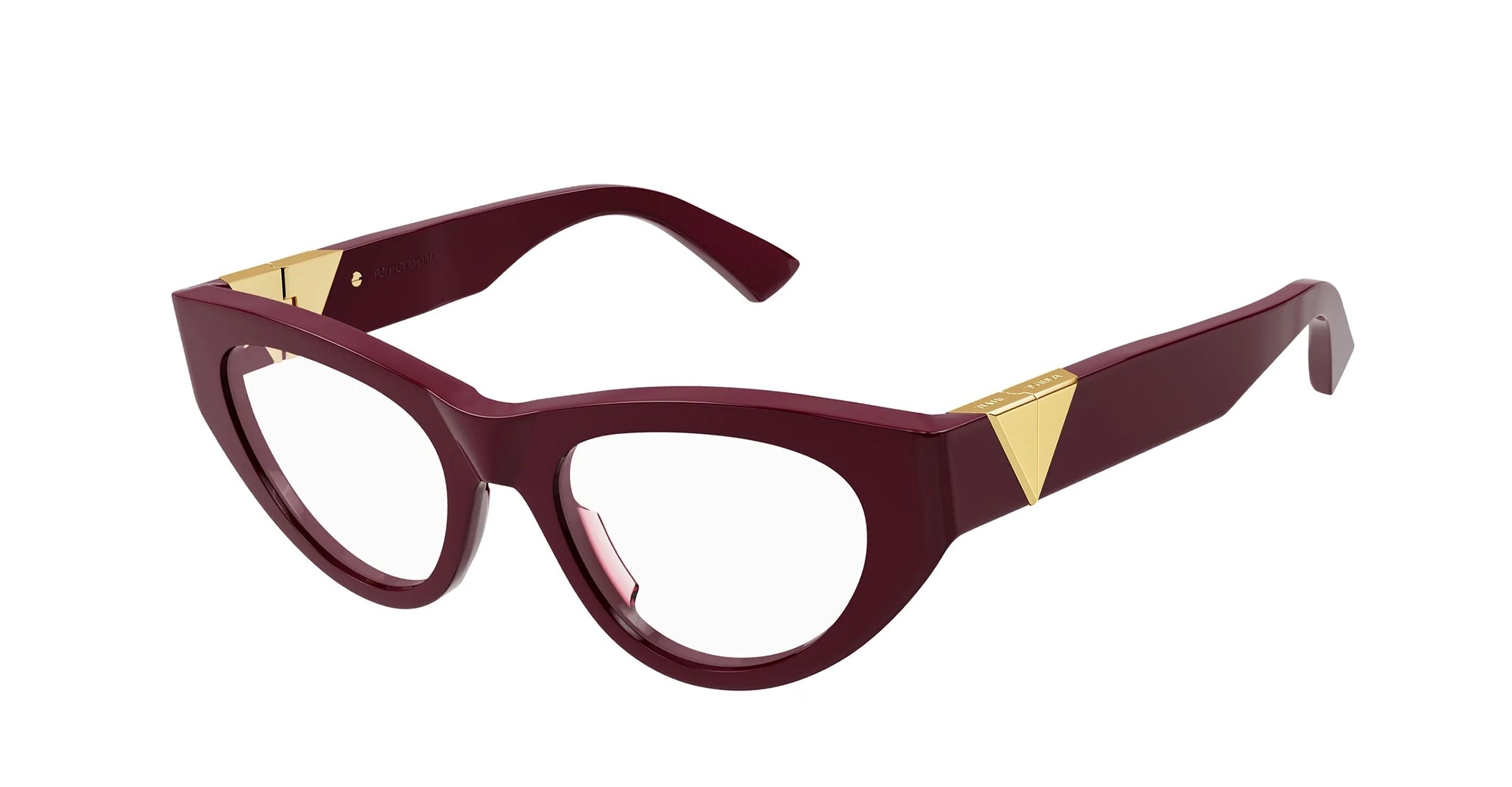 Occhiali da vista in acetato pieno dal design cat-eye tondo, arricchito da un sistema di cerniere a triangolo in metallo.