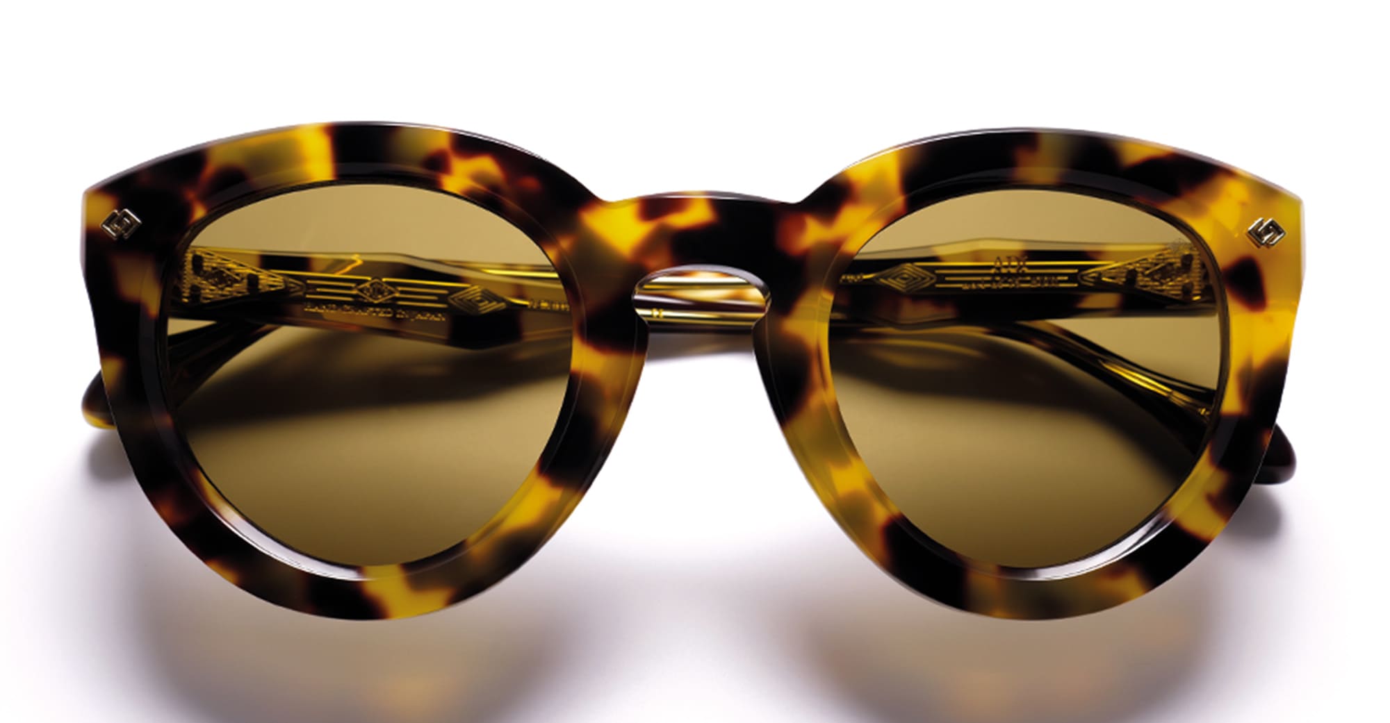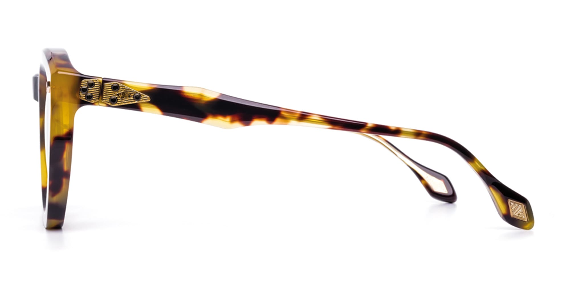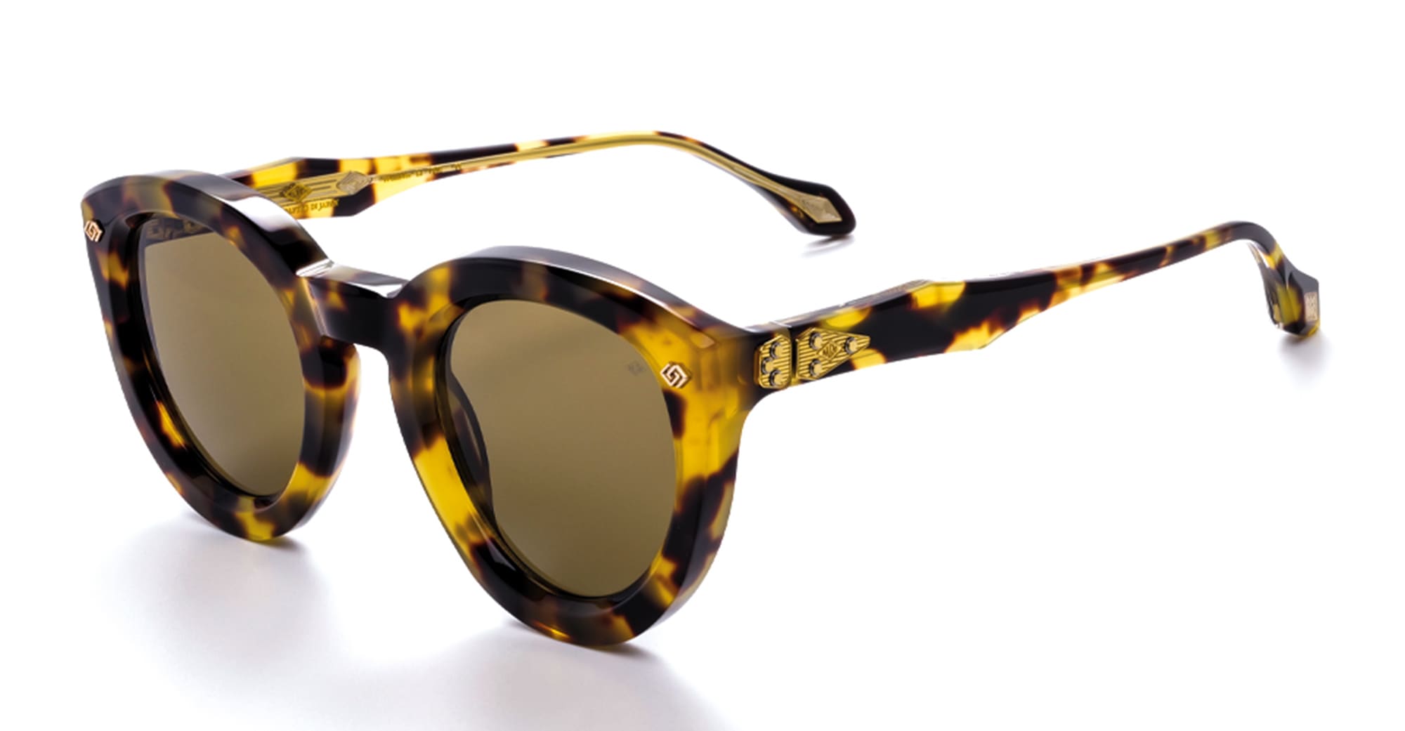 Daizo ADI - LEOPARD / 18K GOLD PLATED (A-CR001e-L1-VB01) are feminine round panto sunglasses, part of the Daizo custom-batch eyewear collection and handcrafted in Japan. They feature havana Italian acetate frame with beveled edging for three-dimensional depth, unique 180 degree hinge system with outer matching plates and detailed with custom two tone rivets, Signature laminated wire core and embedded DAIZO diamond logo at temple tips, and vintage brown lens with 100% UV protection. This frame is ergonomically designed to give ultimate wearing comfort.