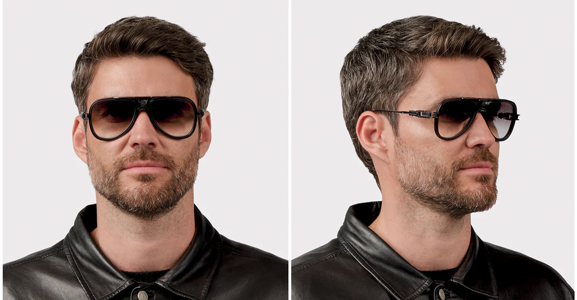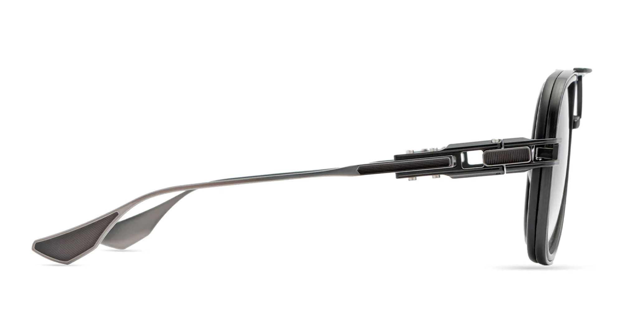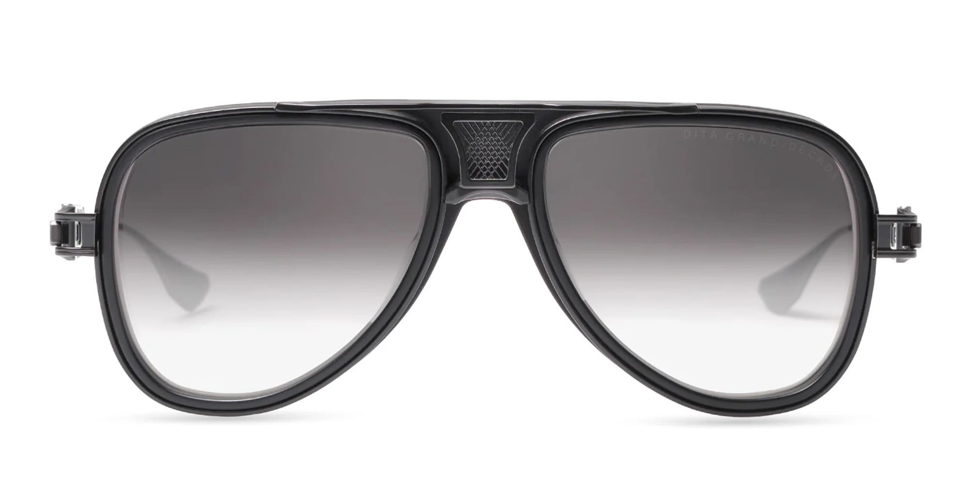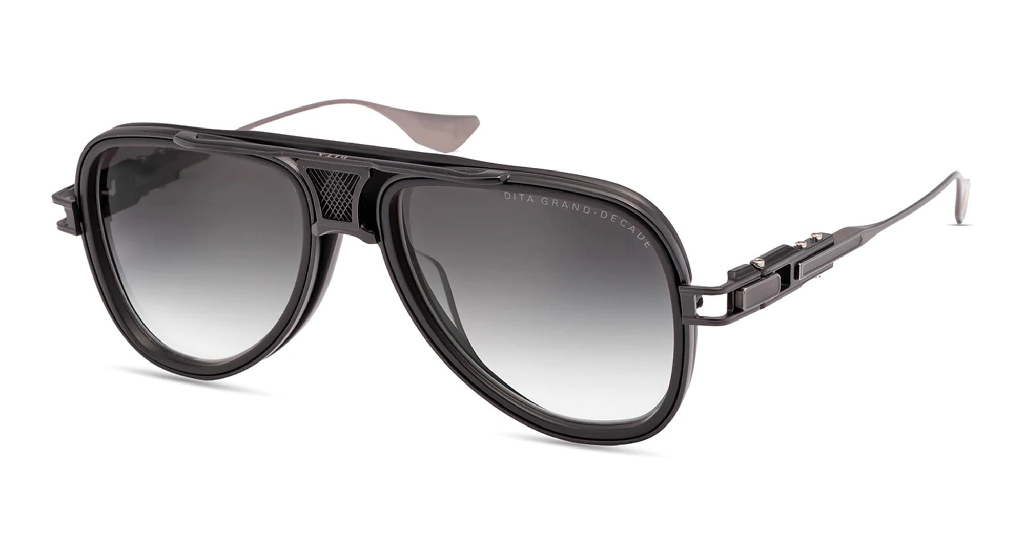 DITA GRAND-DECADE - NERO OPACO / FERRO NERO (DTS460-A-02) sono occhiali da sole aviator, evoluzione lussuosa del modello Decade-Two, per il 30° anniversario di Dita. Montatura in acetato e titanio giapponese di alta qualità di colore nero, con dettagli laser e linee stampate, ponte a corona fluttuante con dettaglio in rete metallica e logo Dita al laser, aste in titanio scolpite, piastra a cerniera in titanio in 3 pezzi con dettagli a linee stampate e intarsio in smalto, lenti CR39 4 base grigio sfumato con protezione UV al 100%.