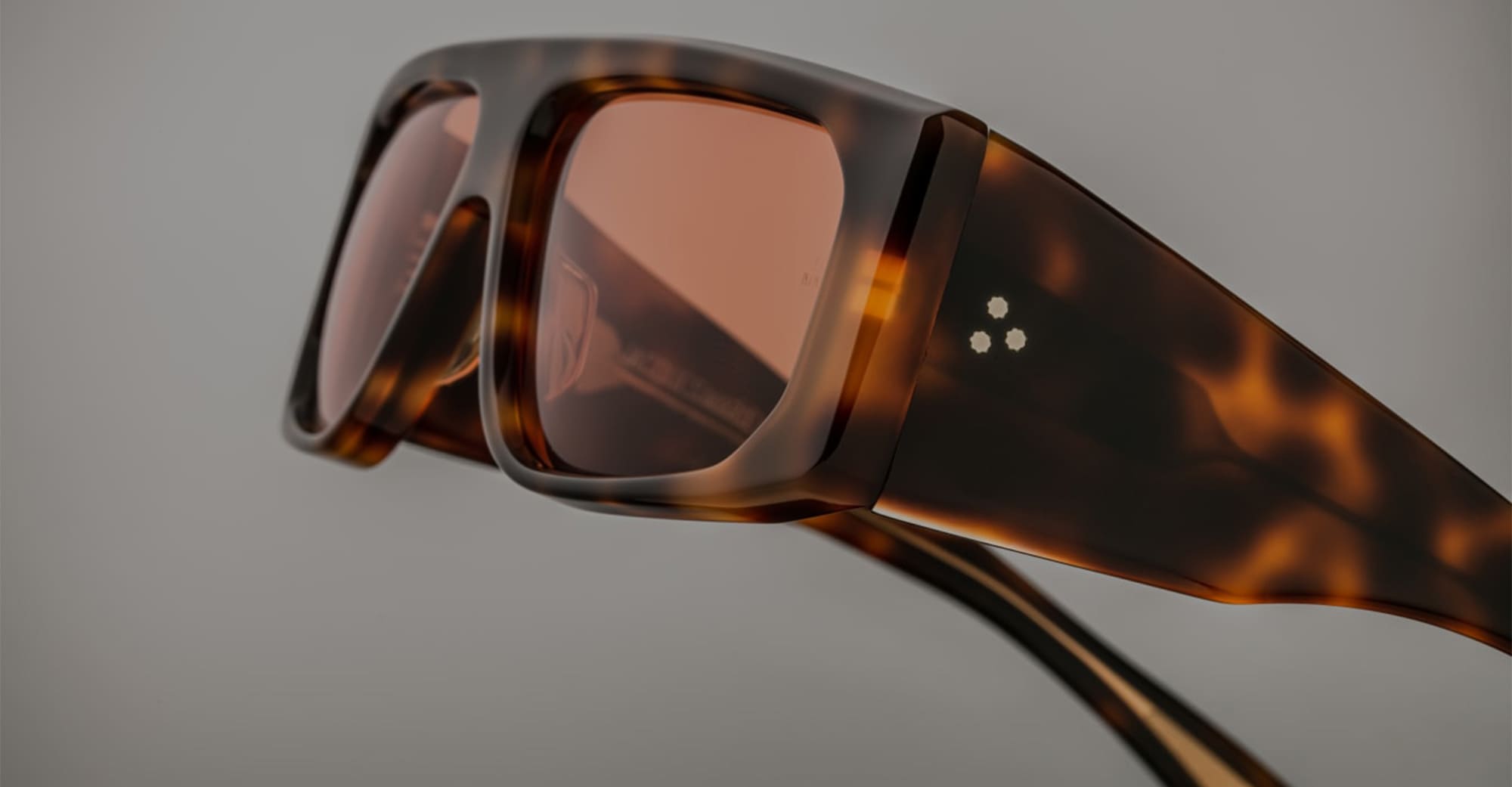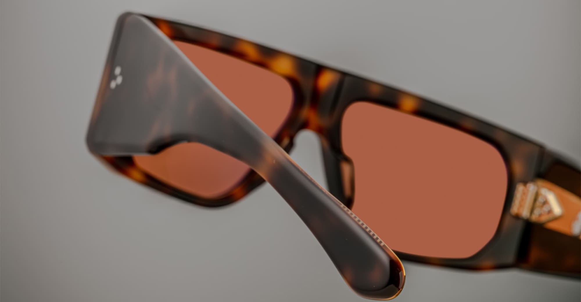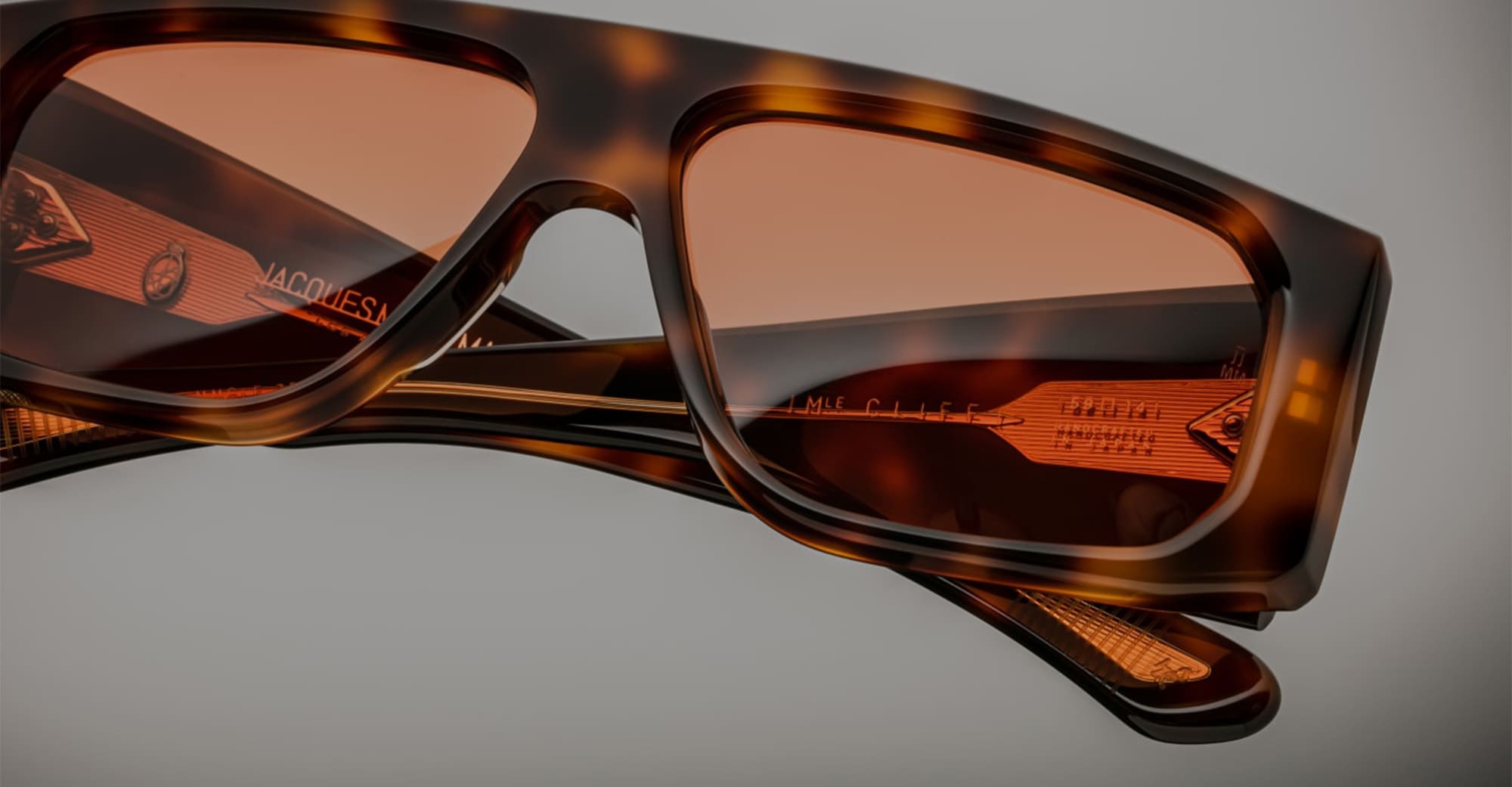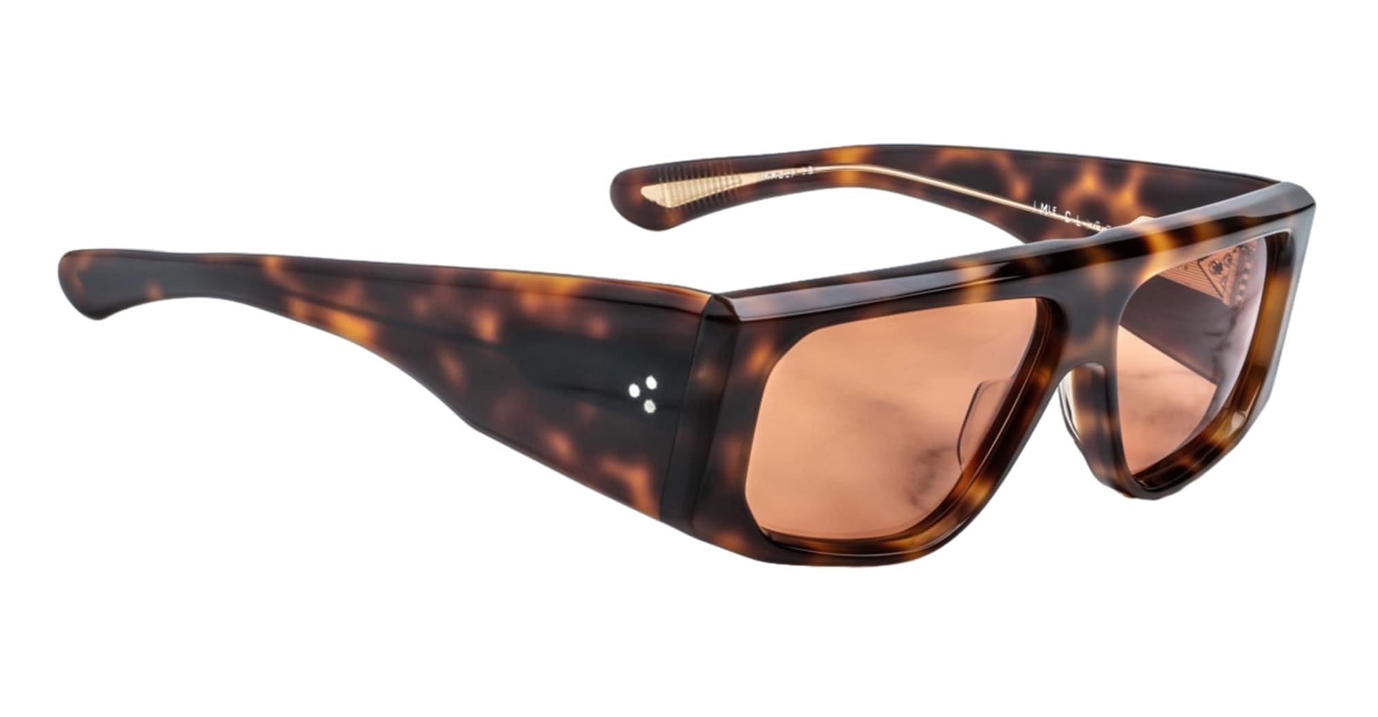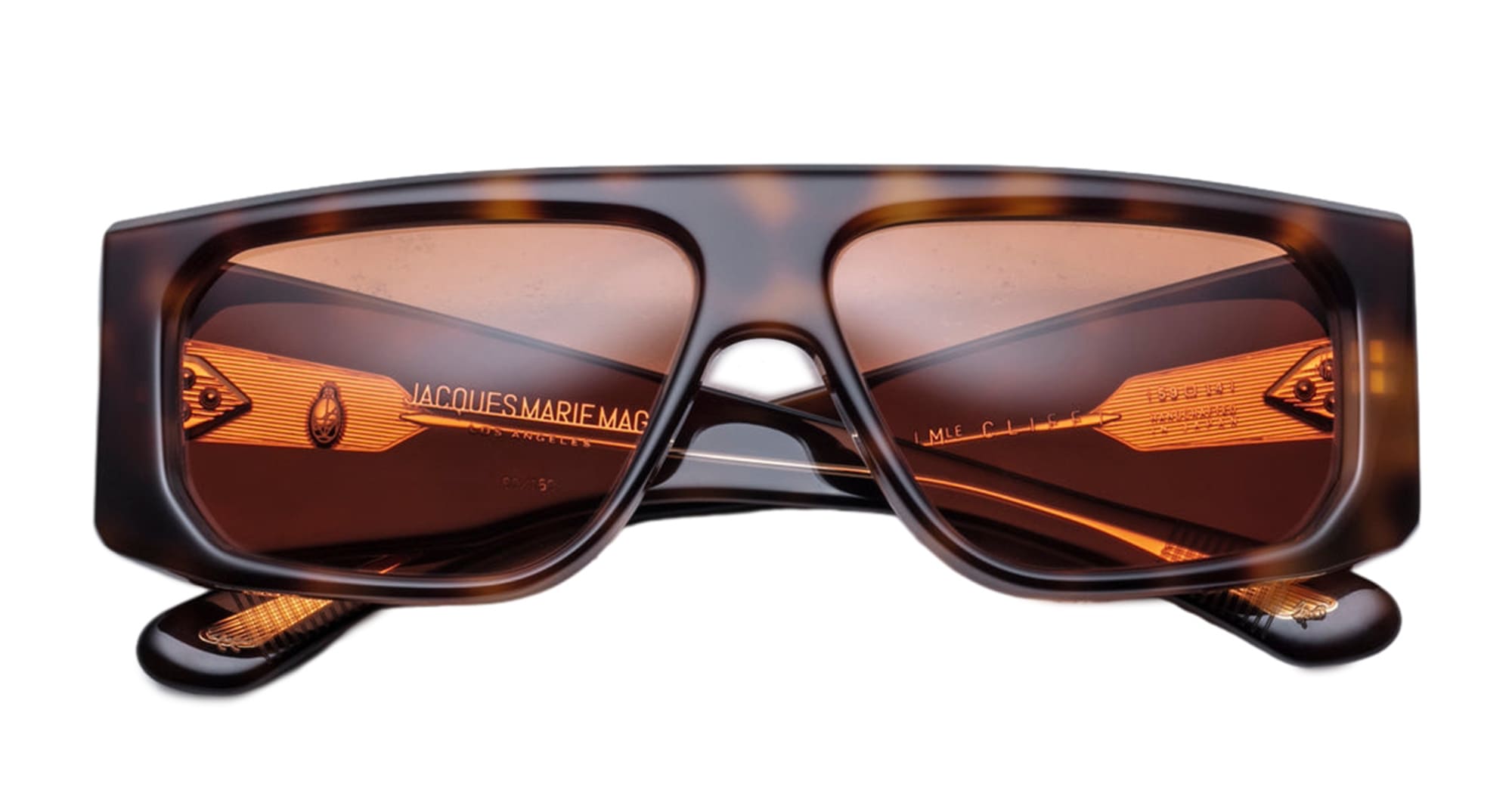Jacques Marie Mage CLIFF - HAVANA 7 (JMMCLF-7B) sono audaci occhiali da sole rettangolari avvolgenti di ispirazione anni '60 prodotti in Giappone. Montatura in acetato di cellulosa polimerizzato marrone avana da 8 mm, aste in acetato laminato doppio, anima interna in filo d'oro chiaro, cerniera a 9 barilotti fissata a tensione e lenti CR39 a base rame 6 con protezione UV al 100%.