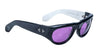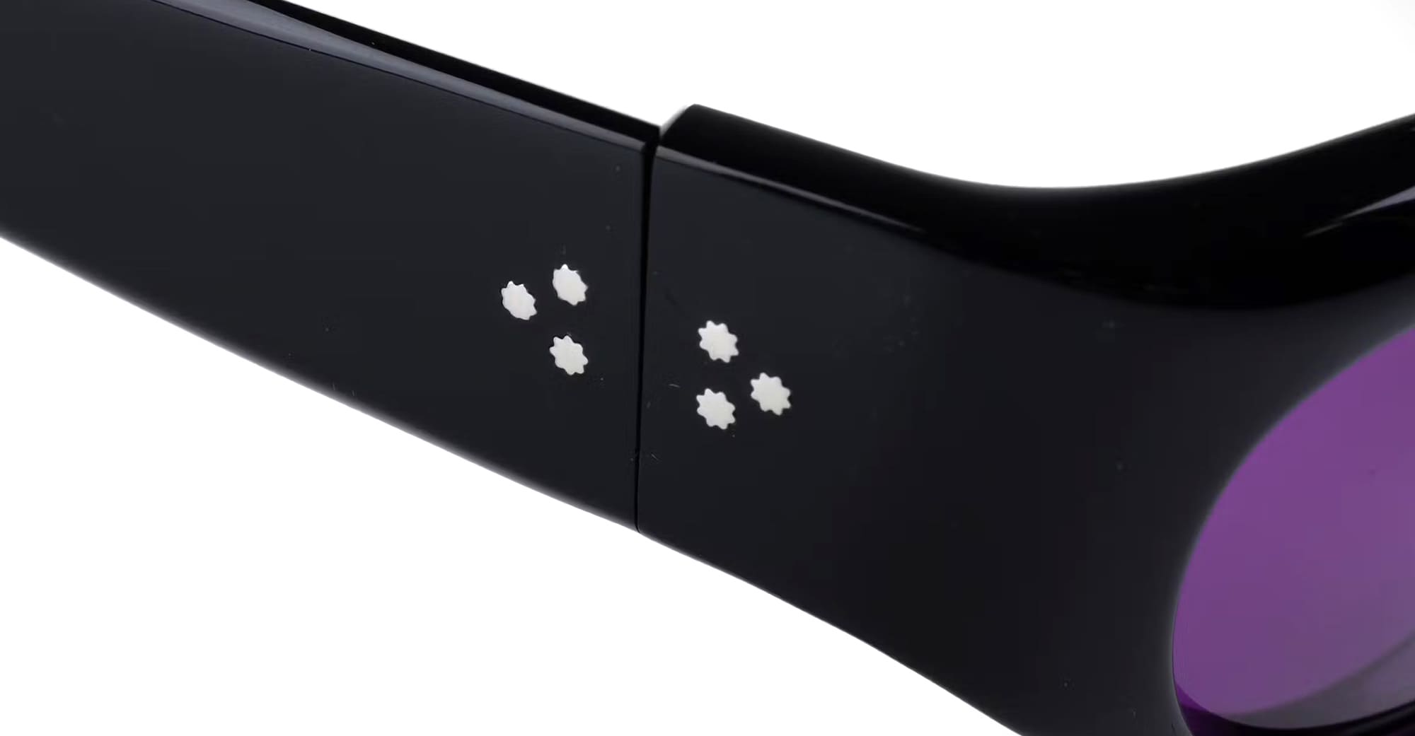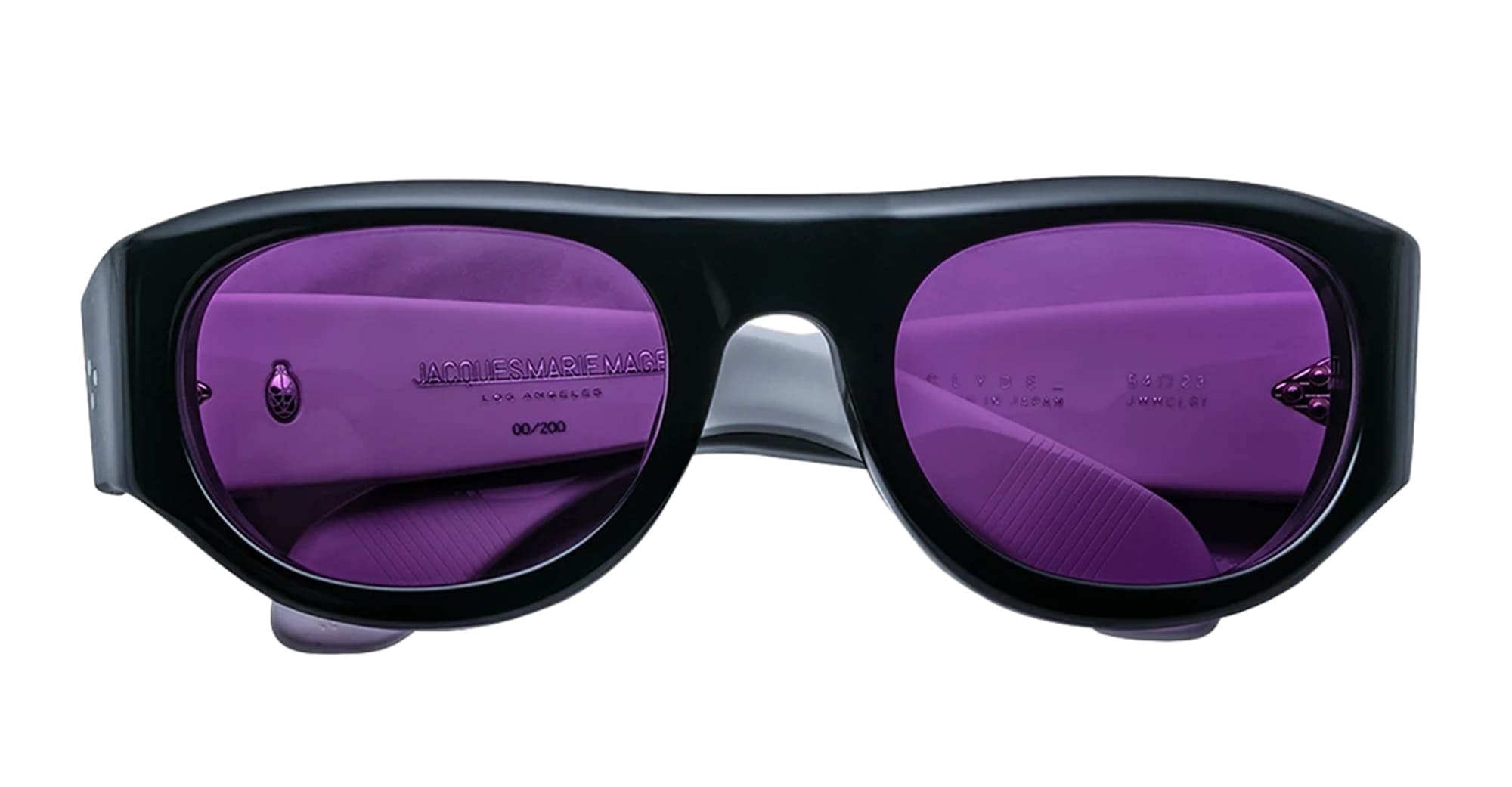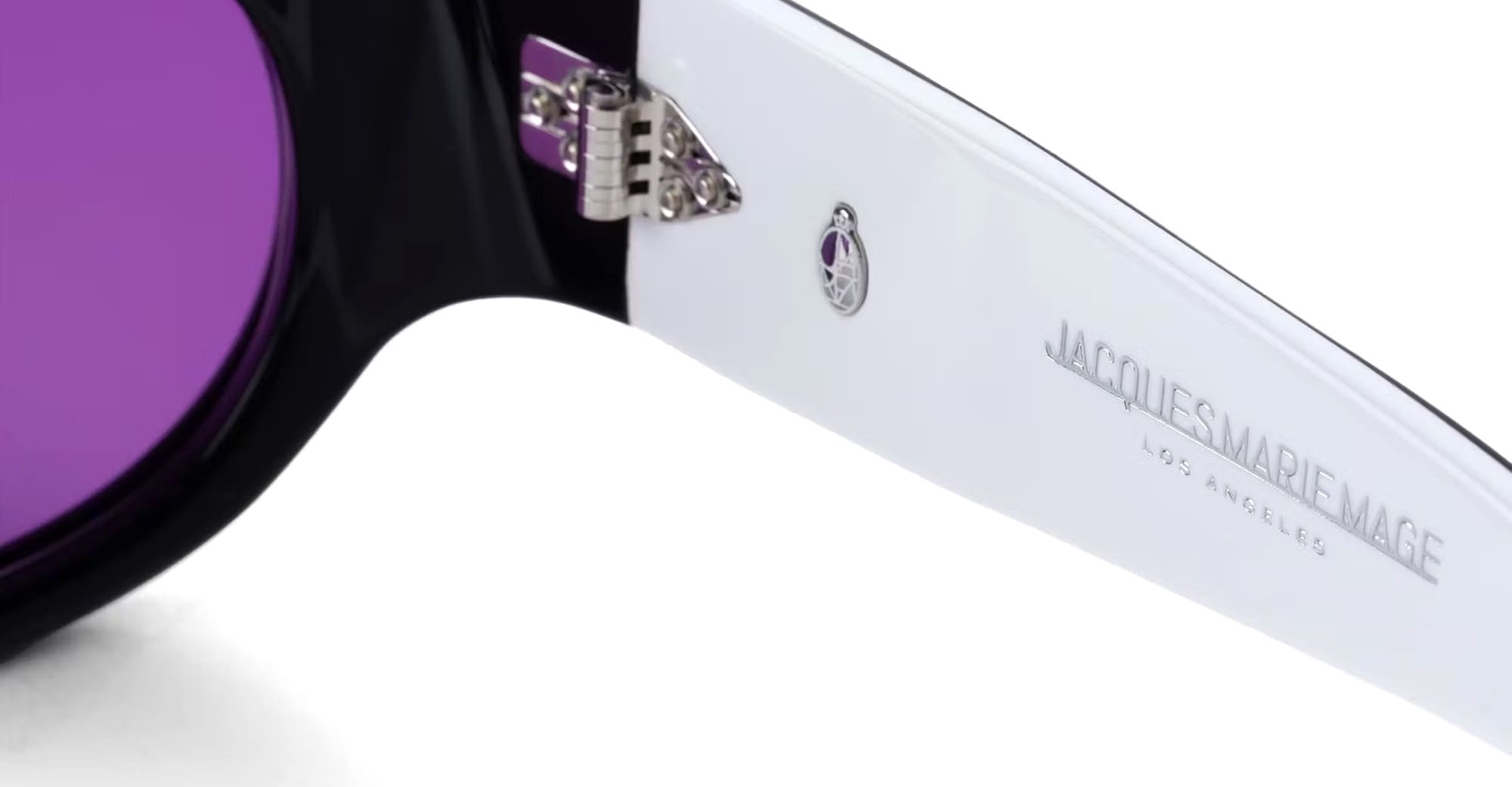 Jacques Marie Mage CLYDE - SKA (JMMCL-6T) sono audaci occhiali da sole ovali dal design avvolgente, realizzati in Giappone. Montatura in acetato di cellulosa polimerizzato nero, aste in acetato di cellulosa a doppia laminazione bianca e nera, anima a filo nascosta, cerniera personalizzata fissata a tensione dorata con rivetti a forma di sperone, lenti CR39 a 2 basi viola con trattamento antiriflesso posteriore e protezione UV al 100%.