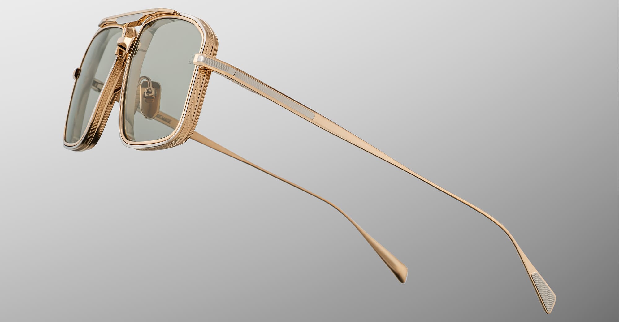 Jacques Marie Mage EARL - ALTAN (JMMER-54) are navigator sunglasses with a '70s-inspired sleek design. They feature dark gold 100% beta titanium frame, with unique silver 4mm eyerim titanium insert, tension-secured custom hidden hinge, custom nose pads, and mist 4 base CR39 lens with backside anti-reflective treatment and 100% UV protection.