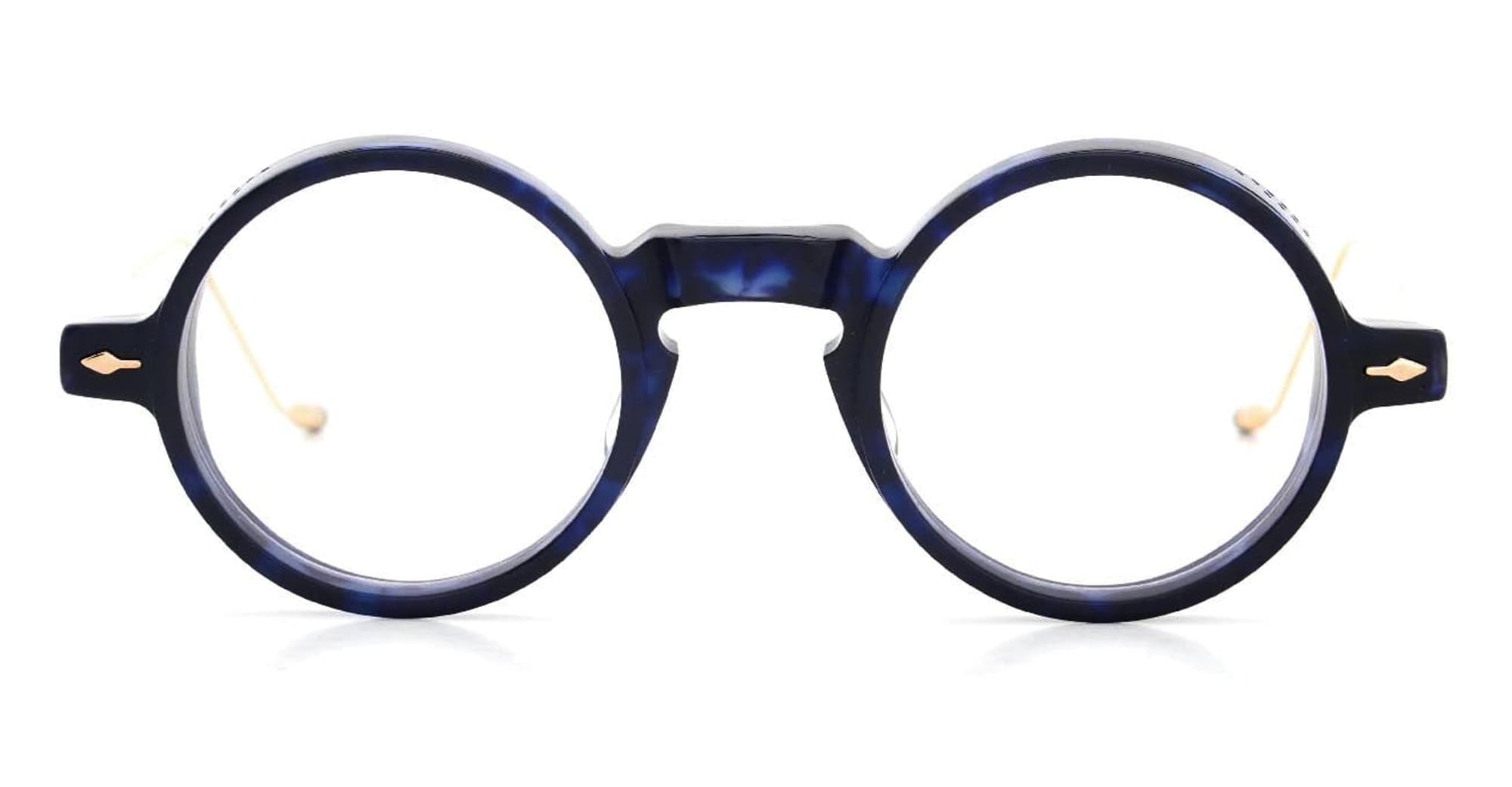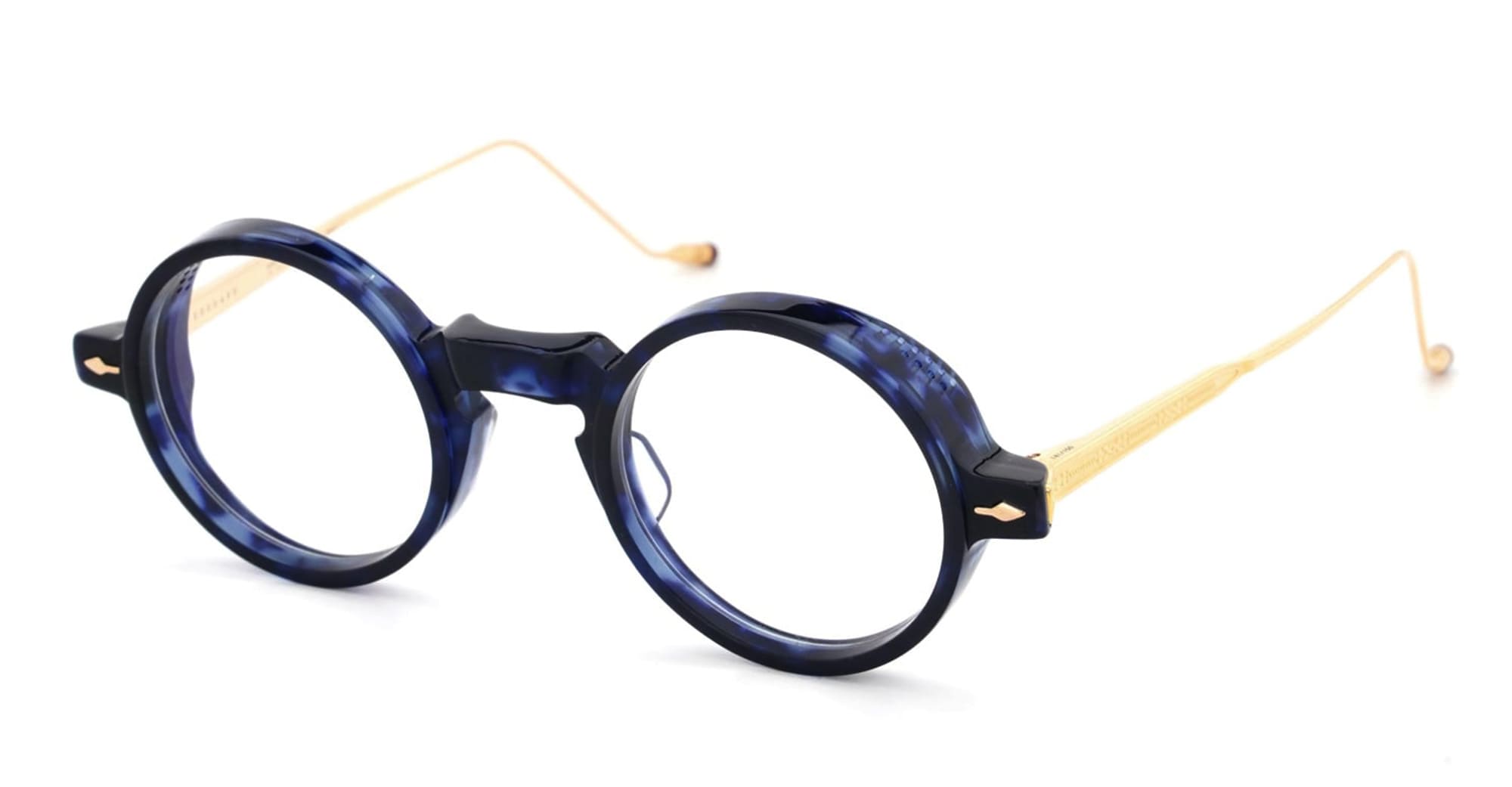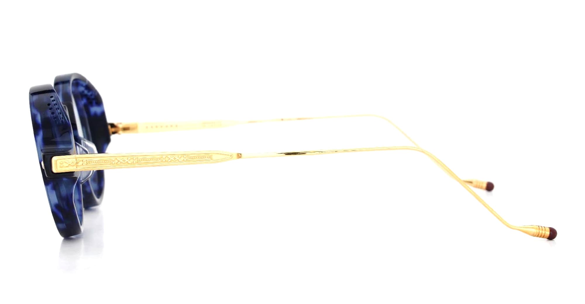 Jacques Marie Mage EDOUARD - MARINE RX (JMMDDRX-17) sono occhiali tondi ispirati all'architetto svizzero-francese Le Corbusier. Montatura in acetato di cellulosa polimerizzato blu da 10 mm con dettagli architettonici tagliati, ponte nasale con foro a chiave, aste in titanio dorato con punte delle aste in resina epossidica bordeaux.