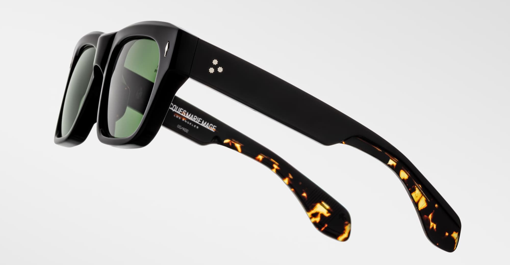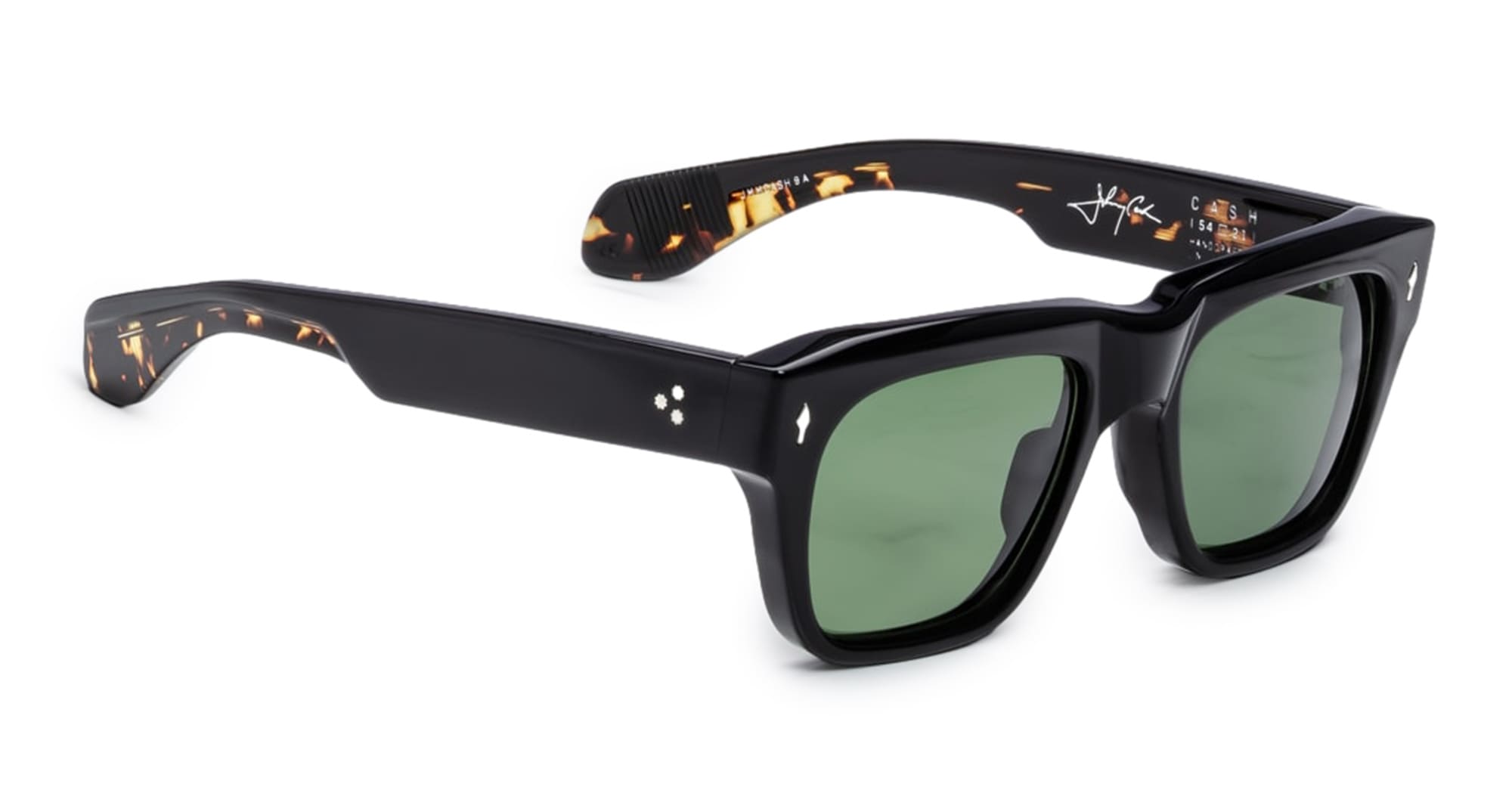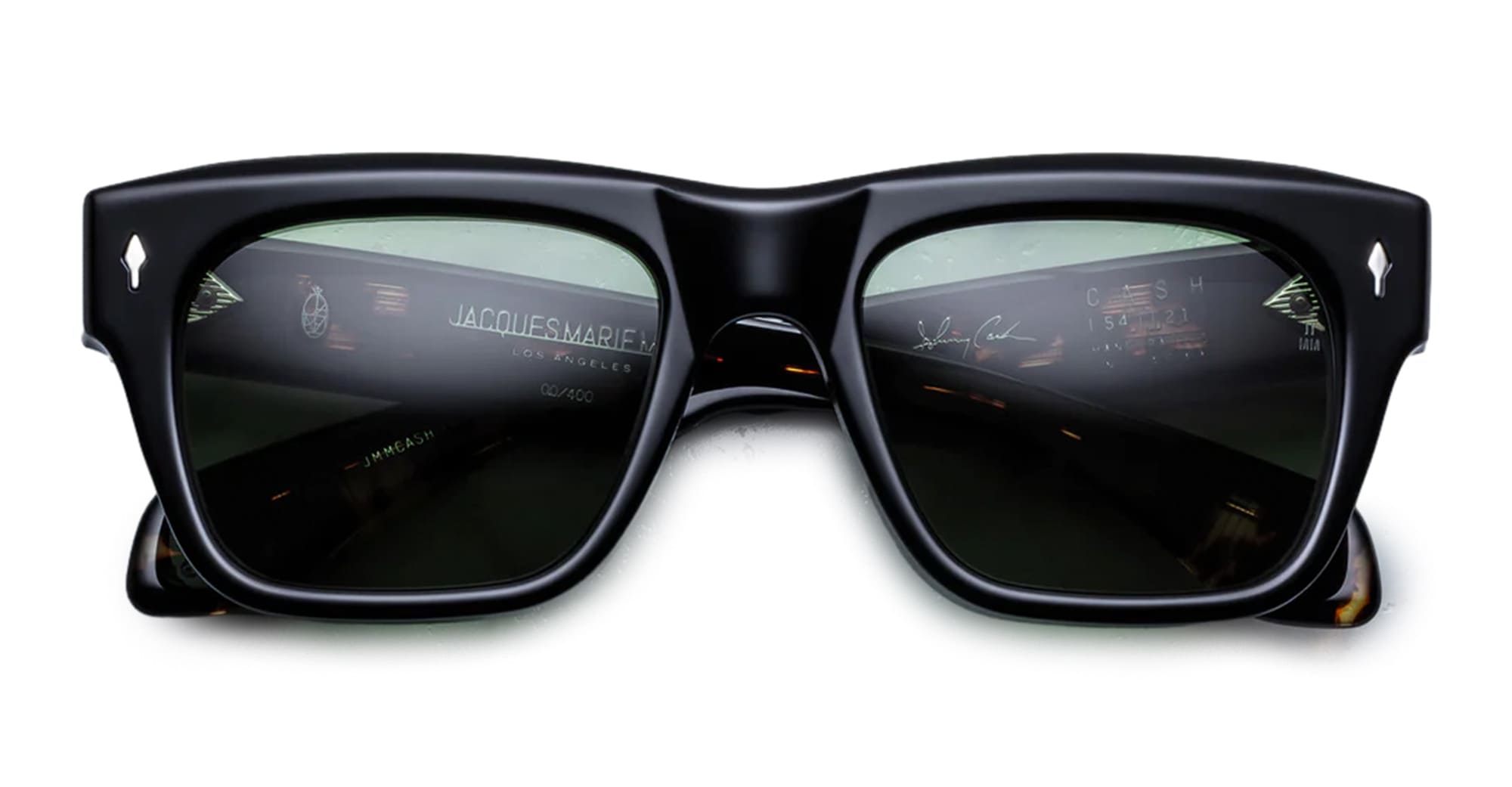 Jacques Marie Mage JOHNNY CASH BY JMM: CASH - NOIR 9 (JMMCASH-9A) are classic rectangular sunglasses part of the Johnny Cash Collection by JMM. Inspired by the actual eyewear worn by Mr. Cash during his arrest in El Paso, TX in 1965. They feature black 10mm cured cellulose acetate frame, double laminated temples, special 'Johnny Cash' signature foil marking on the inner temple, silver arrowhead front pin, exposed wirecore, tension-secured custom 9 barrel hinge, serpent armorlite 6 base lens with backside anti-reflective treatment and 100% UV protection.