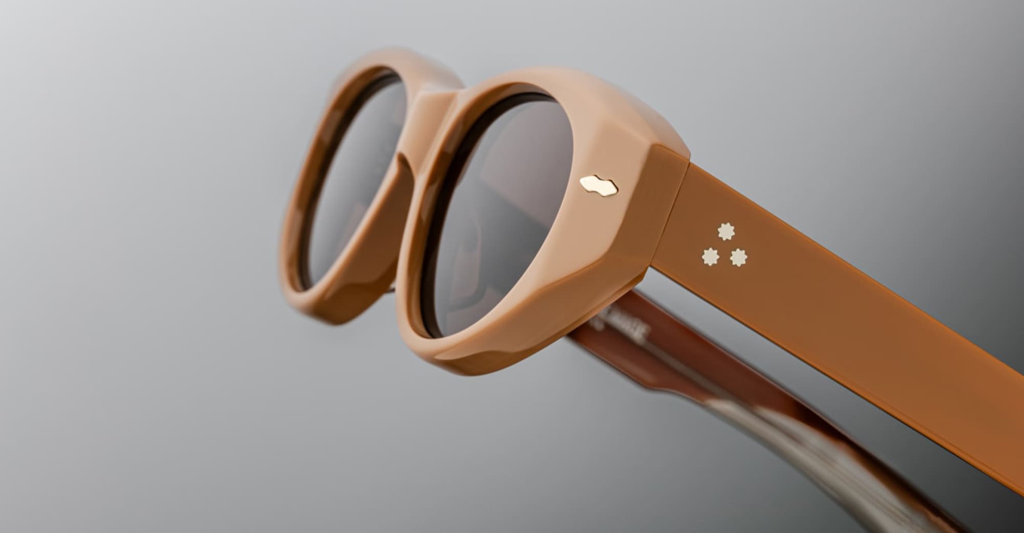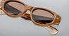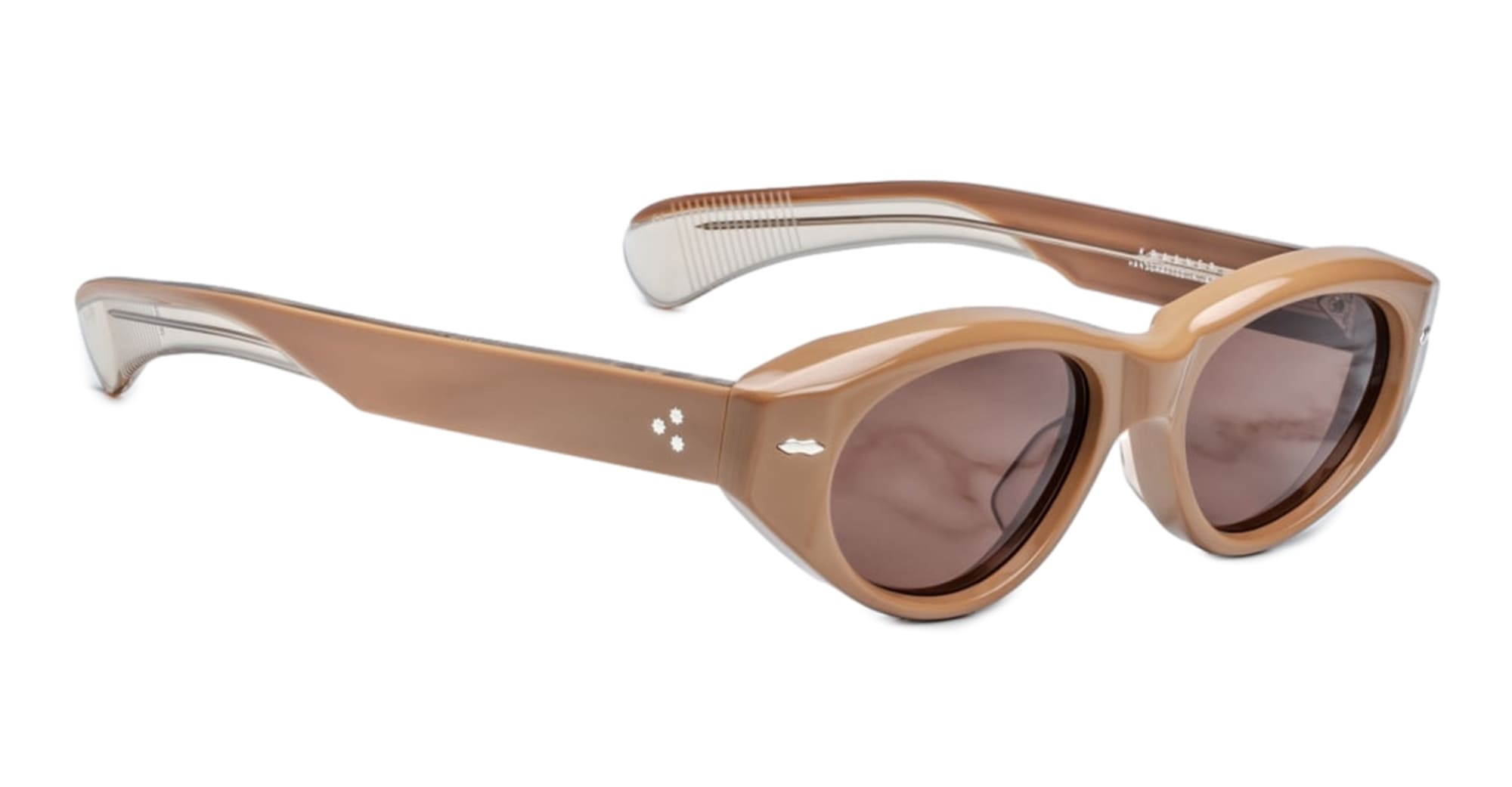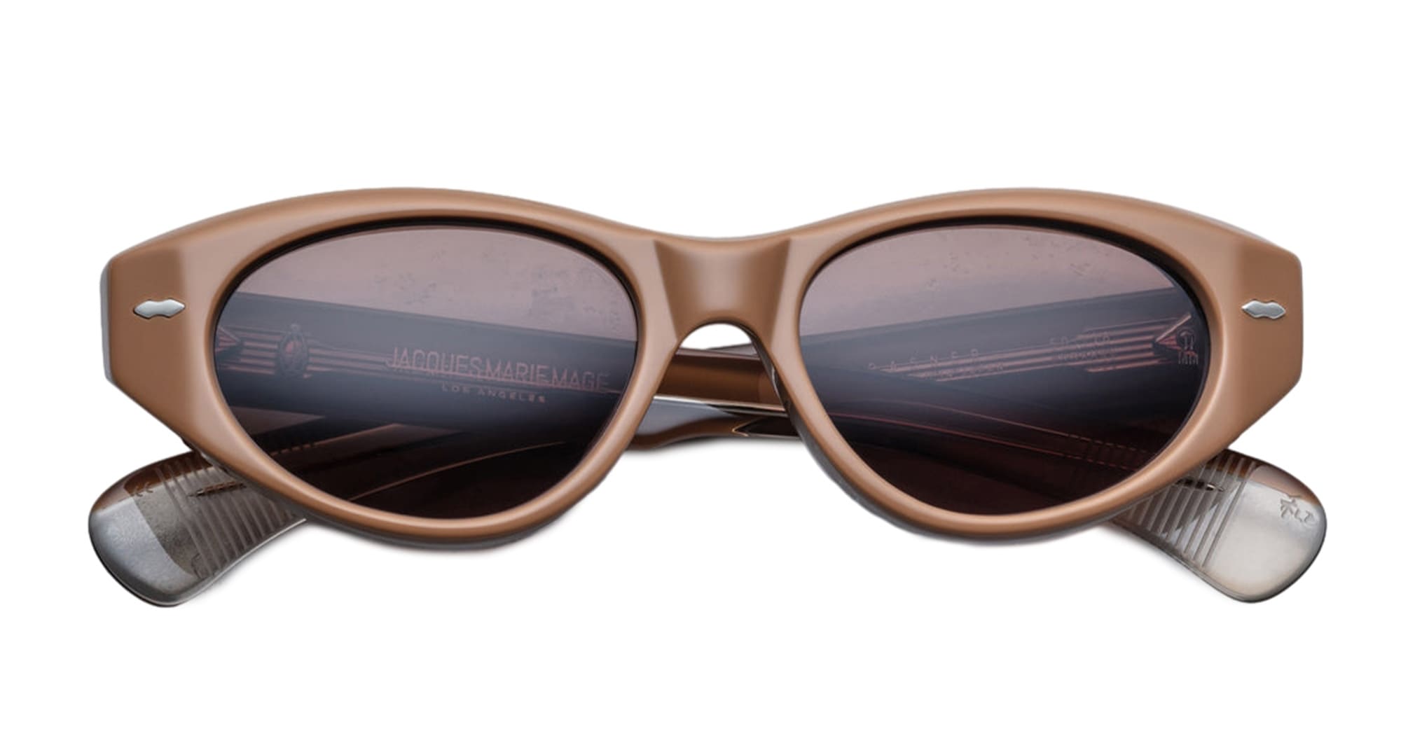 Gli occhiali da sole Jacques Marie Mage KRASNER - TOBACCO 2 (JMMKR-8O) sono morbidi cat-eye di media grandezza con lenti ovali. Montatura in acetato di cellulosa polimerizzato marrone da 10 mm, aste in acetato doppio laminato personalizzate con minuteria in metallo prezioso, perni frontali a doppia freccia in argento sterling, decorazione interna "Lever" con filo metallico, cerniera personalizzata a 7 barilotti fissata a tensione, lenti CR39 a 4 basi marroni con trattamento antiriflesso posteriore e protezione UV al 100%.