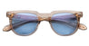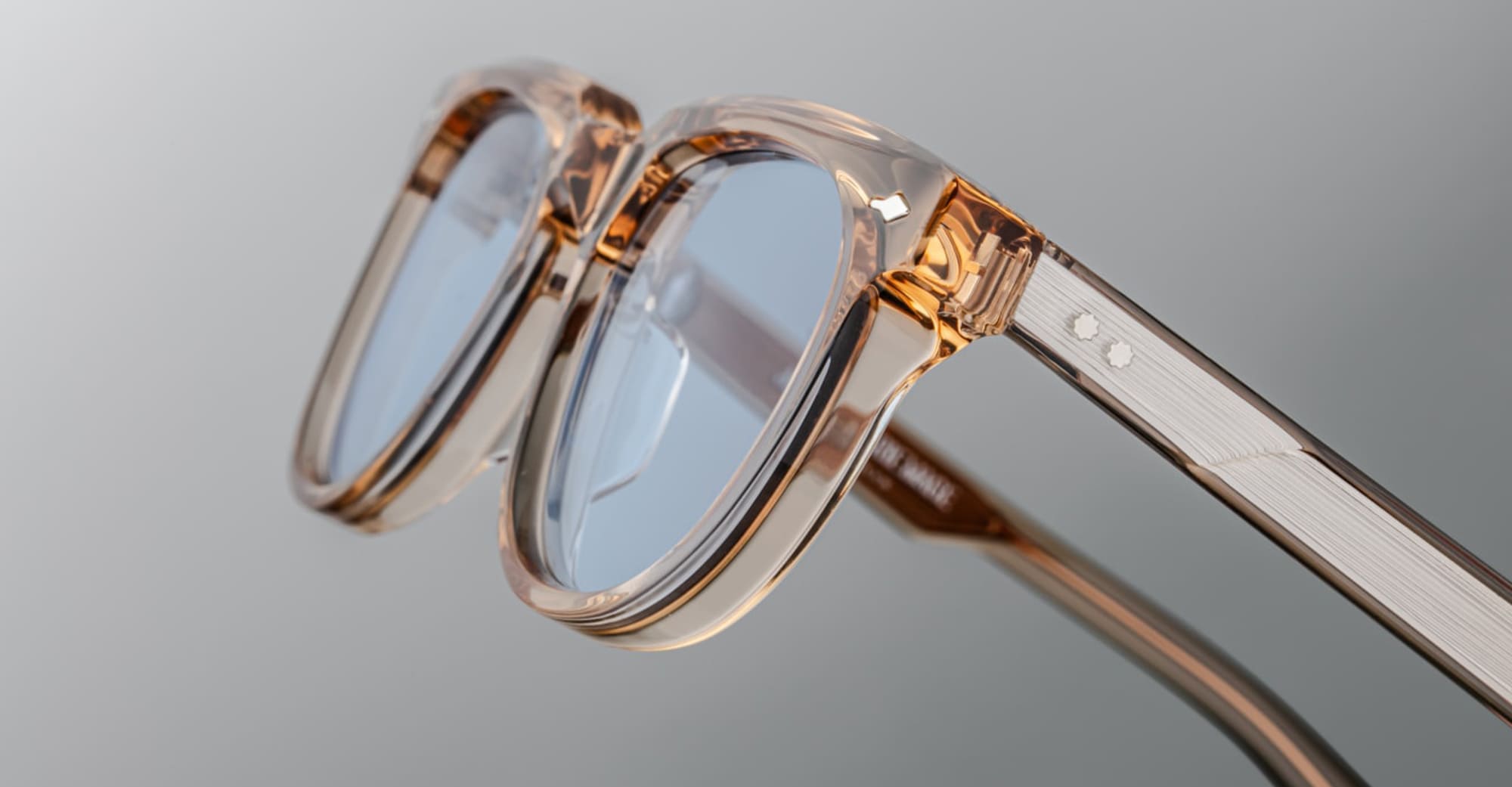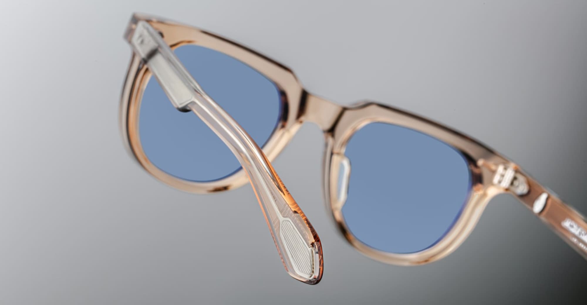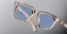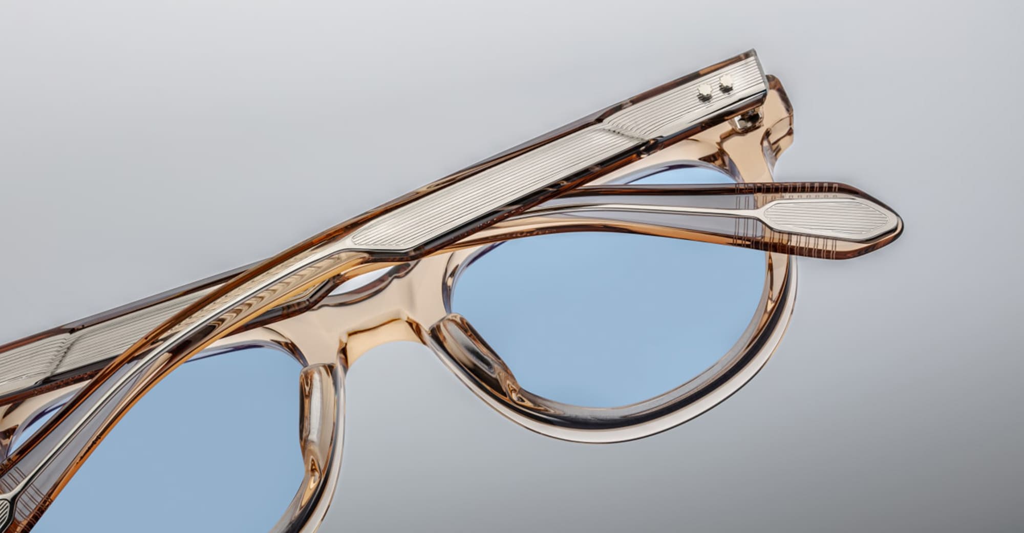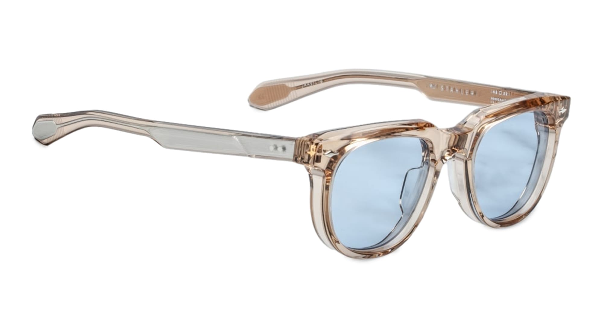 Jacques Marie Mage STAHLER - SAND (JMMSTL-76) sono occhiali da vista tondi di ispirazione anni '50 con tagli scultorei e decorazioni in filo metallico Art Déco. Montatura in acetato di cellulosa polimerizzato beige trasparente da 10 mm, aste in acetato doppio laminato su misura, perni frontali a punta di freccia in argento, anima in filo metallico a vista, cerniera a 5 barrette fissata a tensione, lenti CR39 a 4 basi blu uccello con trattamento antiriflesso e protezione UV al 100%.