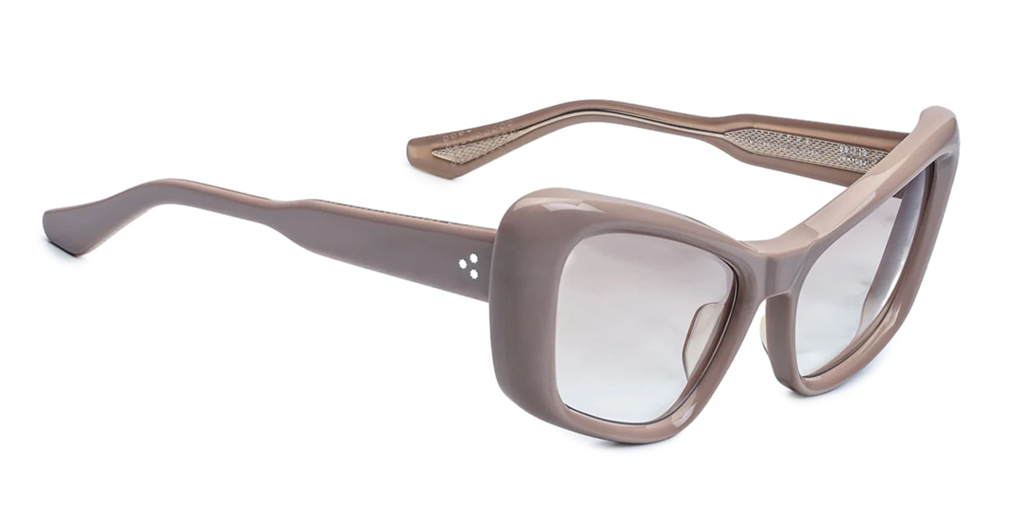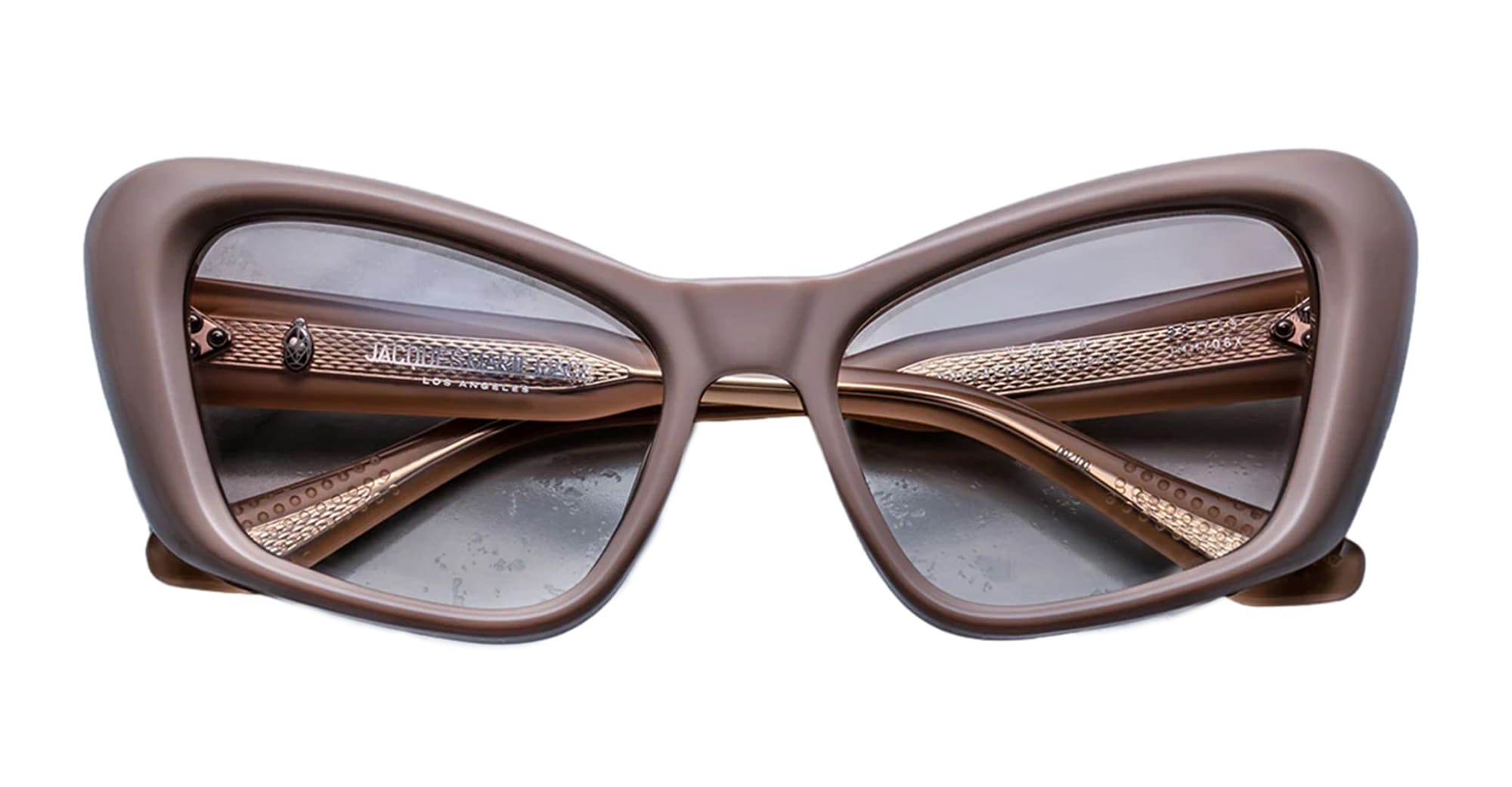 Jacques Marie Mage YORK - PORTER (JMMYO-6X) sono occhiali da sole di ispirazione anni '90 con lenti oblunghe distorte e montatura avvolgente. Montatura in acetato di cellulosa polimerizzato color nudo da 10 mm, aste in acetato di cellulosa a doppia laminazione personalizzate, anima interna in filo metallico personalizzata, cerniera personalizzata con rivetti a forma di sperone, logo cammeo 3D in metallo a cupola argentata, lenti CR39 a base 8 marrone chiaro sfumato con trattamento antiriflesso sul retro e protezione UV al 100%.
