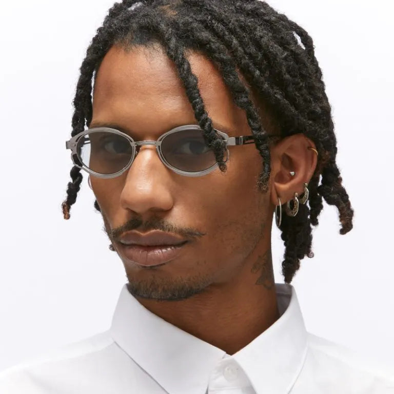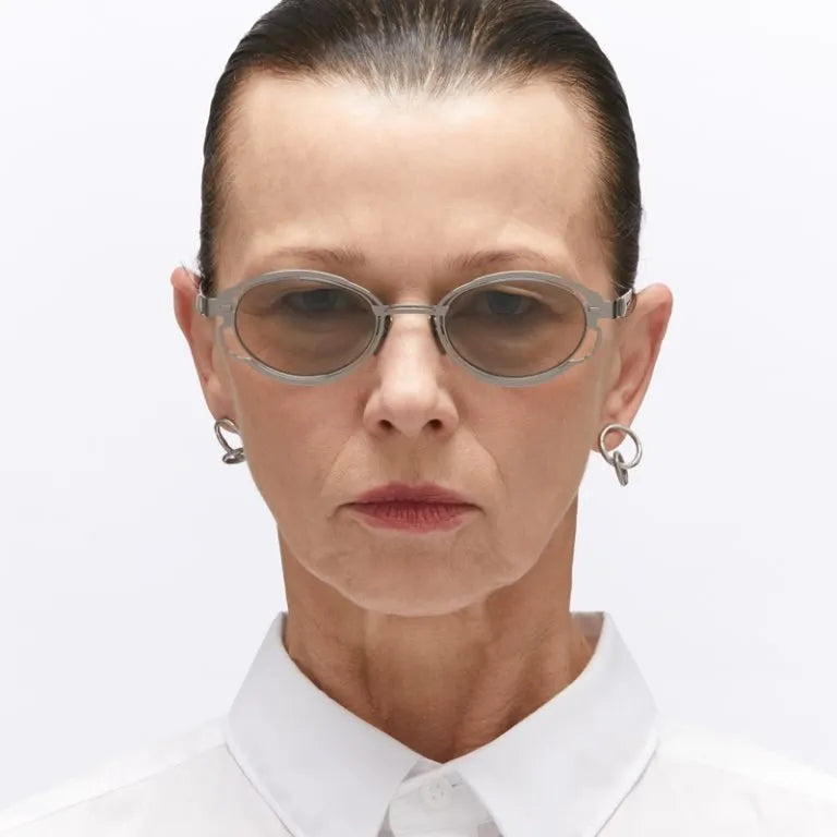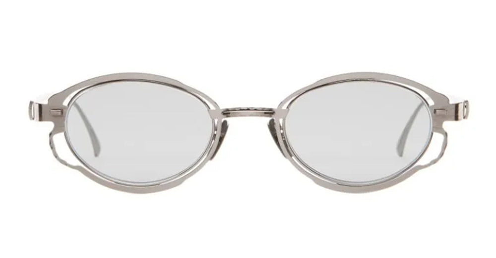 Kuboraum MASK H01 - SILVER (KRSH01SV0000002F) sono occhiali da sole ovali prodotti in Italia. Presentano un'iconica montatura in metallo argento, aste in metallo e lenti grigio chiaro con protezione UV al 100%.