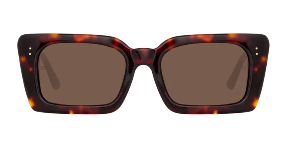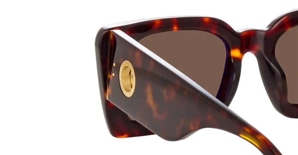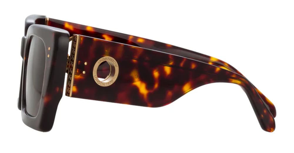 LINDA FARROW NIEVE DARK T-SHELL / YELLOW GOLD (LFL1297C2SUN) sono occhiali da sole squadrati, chic ed eleganti, dalla forma leggermente cat-eye. Sono caratterizzati da una montatura in acetato marrone scolpito tartarugato con naselli incorporati, aste larghe in acetato con punte arrotondate per il massimo comfort, logo circolare dorato Linda Farrow sui lati e lenti Zeiss marroni con protezione UV al 100%.