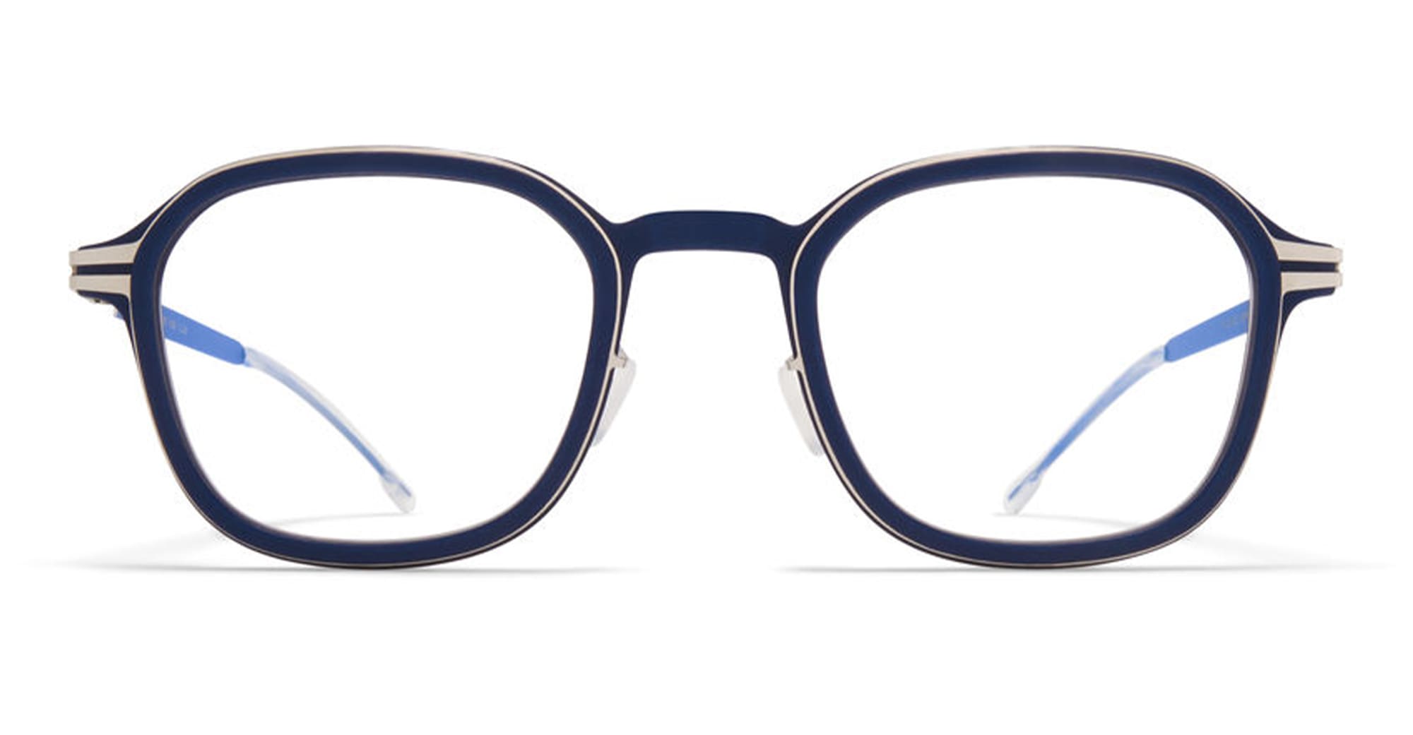 Mykita FIR MHL3 - NAVY / SHINY SILVER RX (10084944) are lightweight elegant squared eyeglasses made in Germany, part of the Mykita Mylon Colletion. They feature blue Mylon front fitted inside a silver steel structure, patented spiral hinge, silicone temple tips and nose pads.
