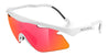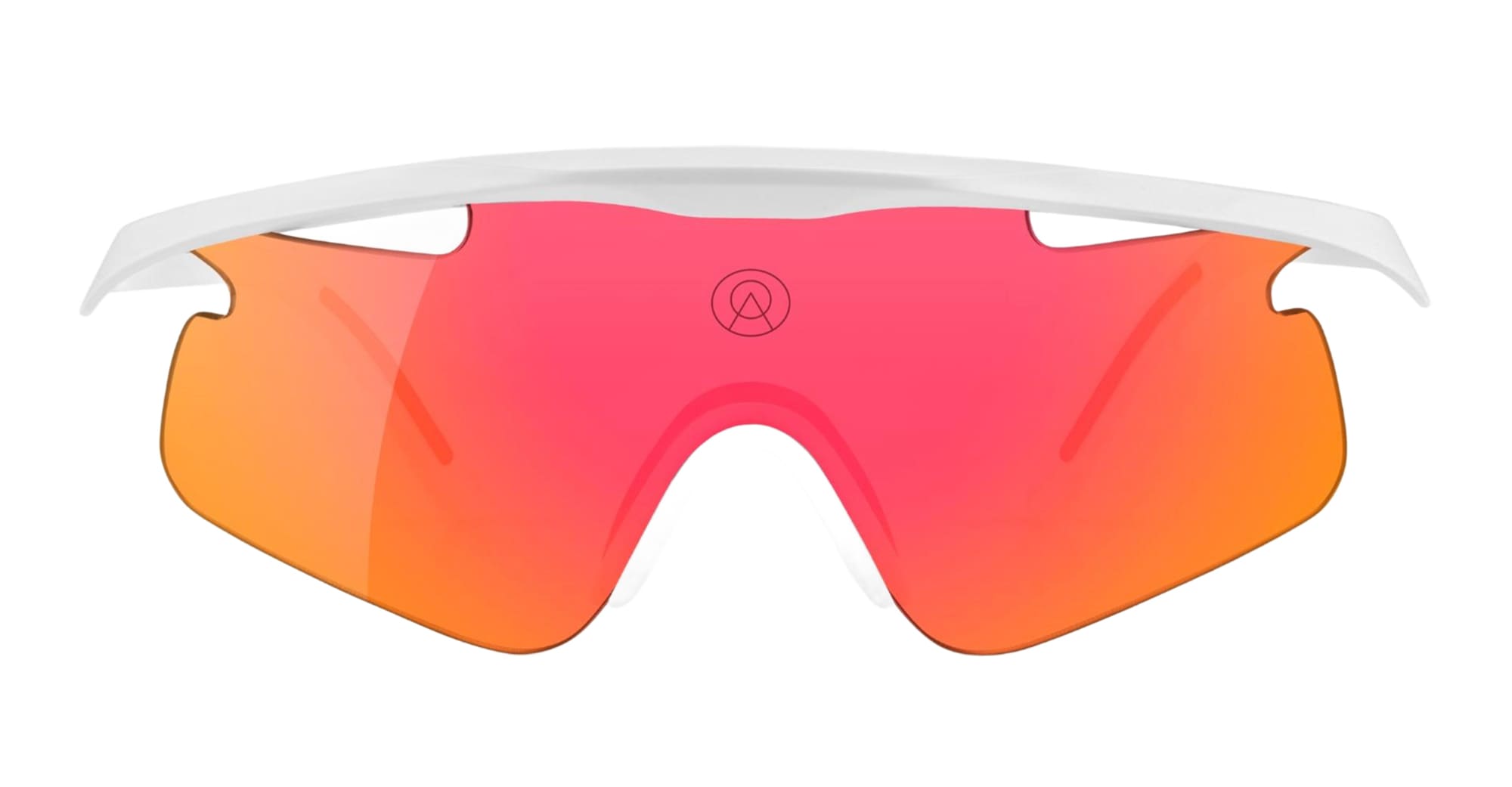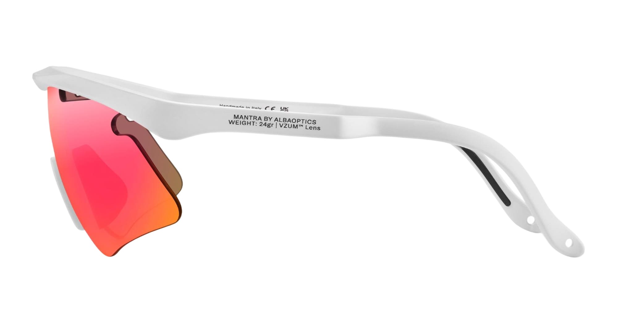 Alba Optics MANTRA - WHT / VZUM LAVA (8050054514291) are mask sunglasses made in Italy. They feature a lightweight Tr90 single-piece frame of 24g, interchangeable lens, ergonomic temple tips, and mirrored VZUM lens with shield coating and 100% UV protection. They can be placed on the helmet, upon the head or hung around the neck.