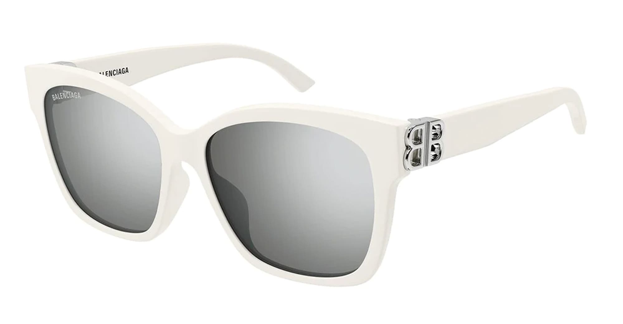 Balenciaga BB0102SA-016 - WHITE (BB0102SA-016) are butterfly sunglasses made in Italy. They feature white acetate frame, hidden hinges within the silver BB logo, lasered logo on right lens, and grey CR39 lens with 100% UV protection.