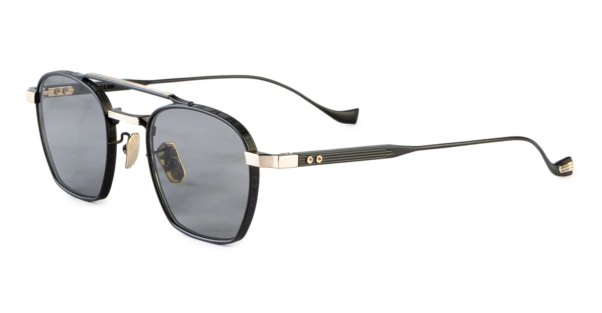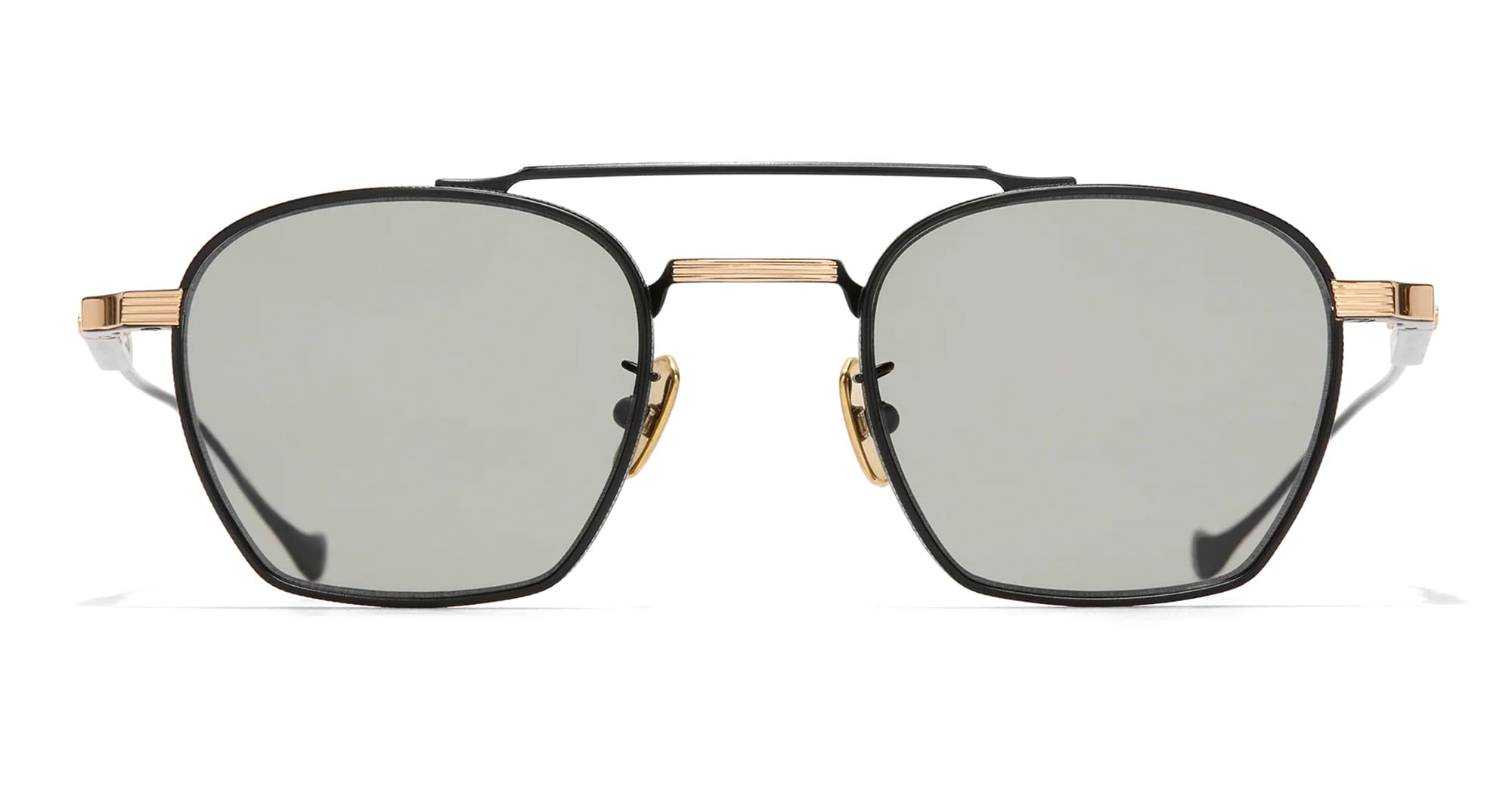 Cutler and Gross CRANLEY 1425 - BLACK / GOLD (CGST-1425-48-01) are elegant sunglasses, an interpretation of the classic navigator - part of the The Knightsbridge Green collection. They feature dual-tone black and gold titanium structure, linear Oyster pin brow bar and nose bridge, custom inner hinges, lasered logo inside temples, grey Zeiss lens with 100% UV protection. Handcrafted in Sabae, Japan by expert craftspeople.