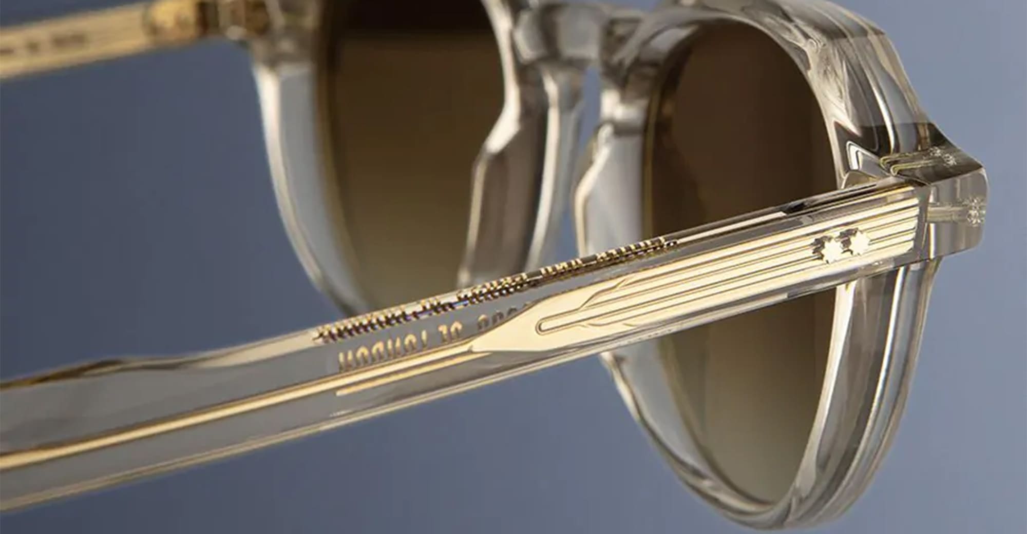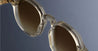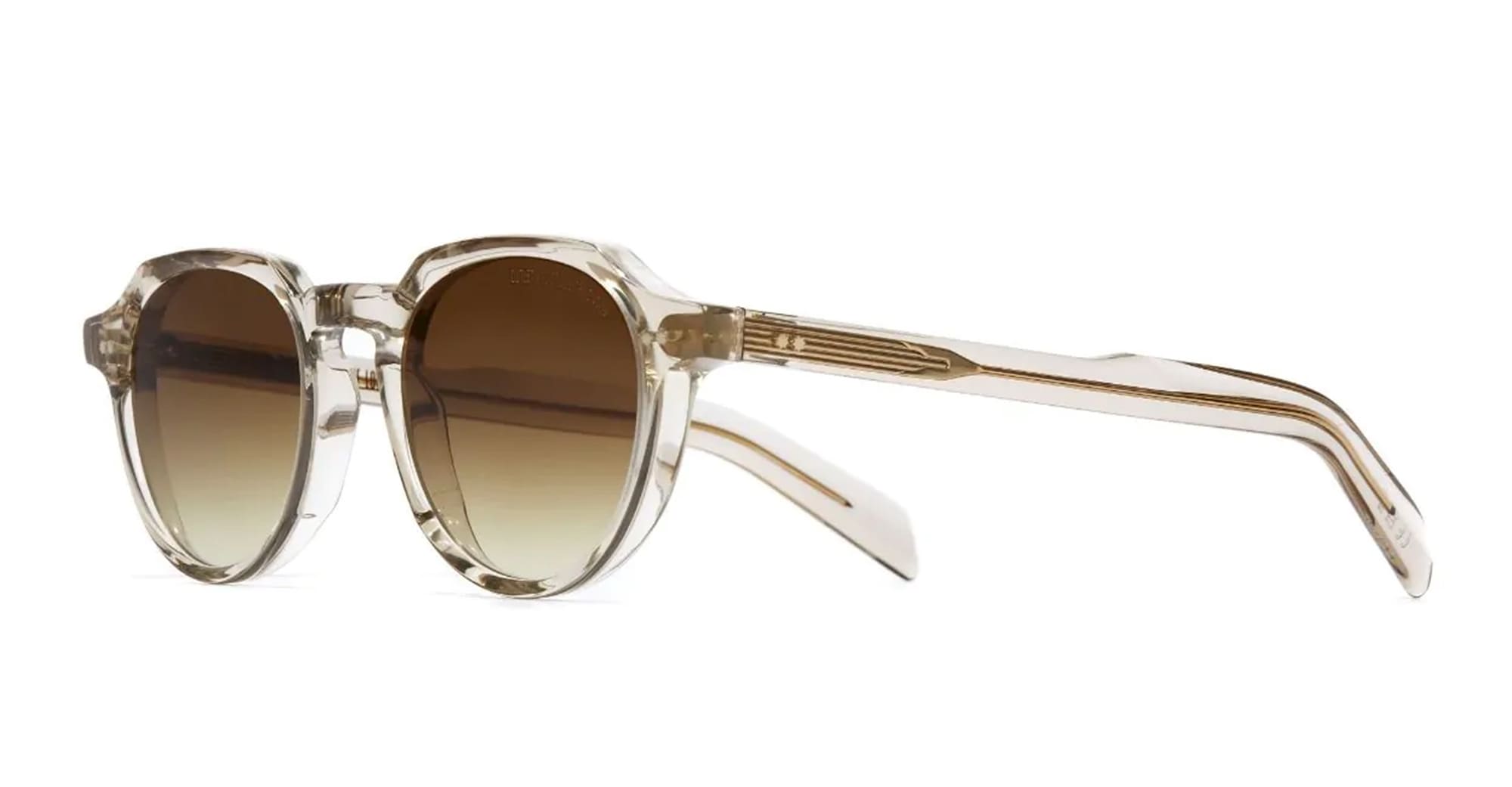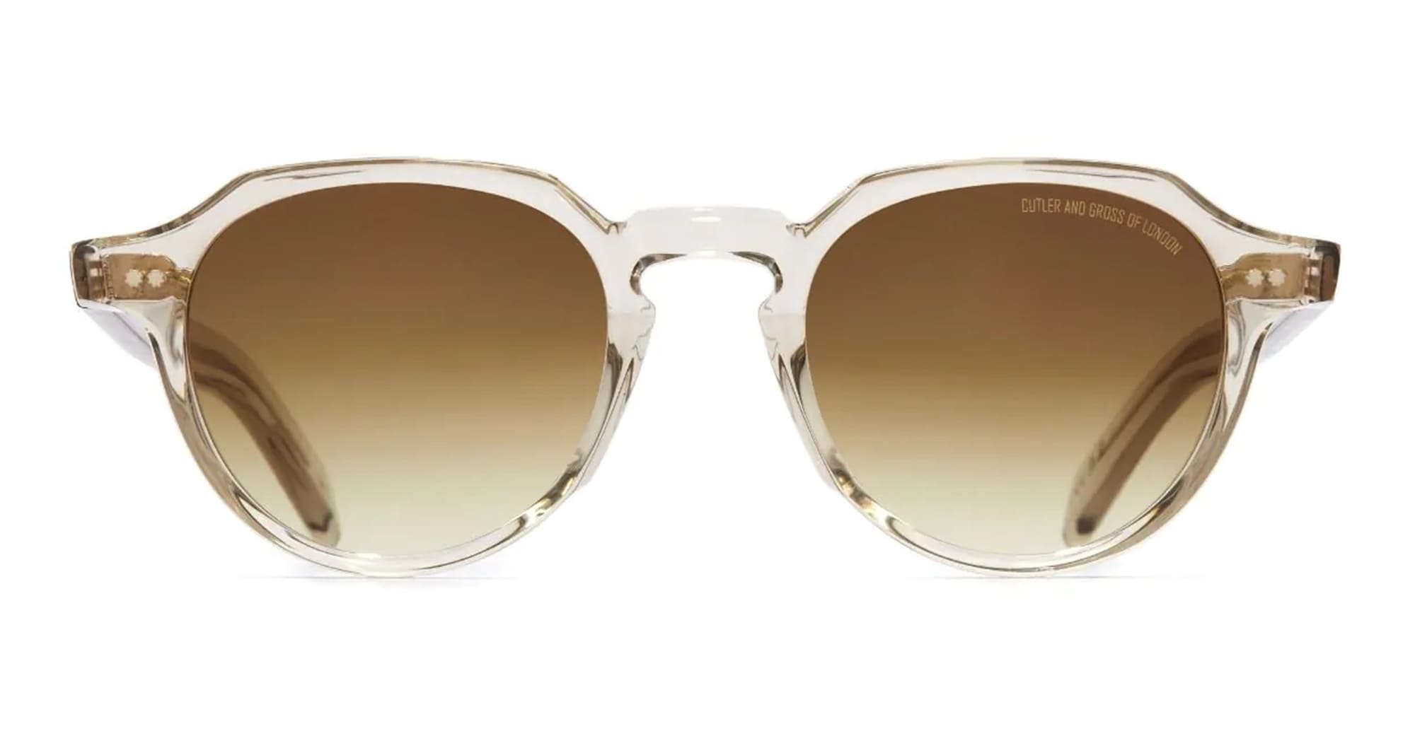 Cutler and Gross GR06 / SAND CRYSTAL (CGSN-GR06-48-03) are rounded pantos sunglasses, inspired by the visual artistry of Andy Warhol in the '60s and '70s. They feature transparent beige acetate frame with sculptural milling, jeyhole bridge, integrated nosepads, 5-barrel hinge, Compass Star front and temple pins, custom Art Deco wirecore design, gold-foil logo, Fender temple tips, and gradient brown lens with 100% UV protection. Handcrafted in Italy by expert craftspeople.