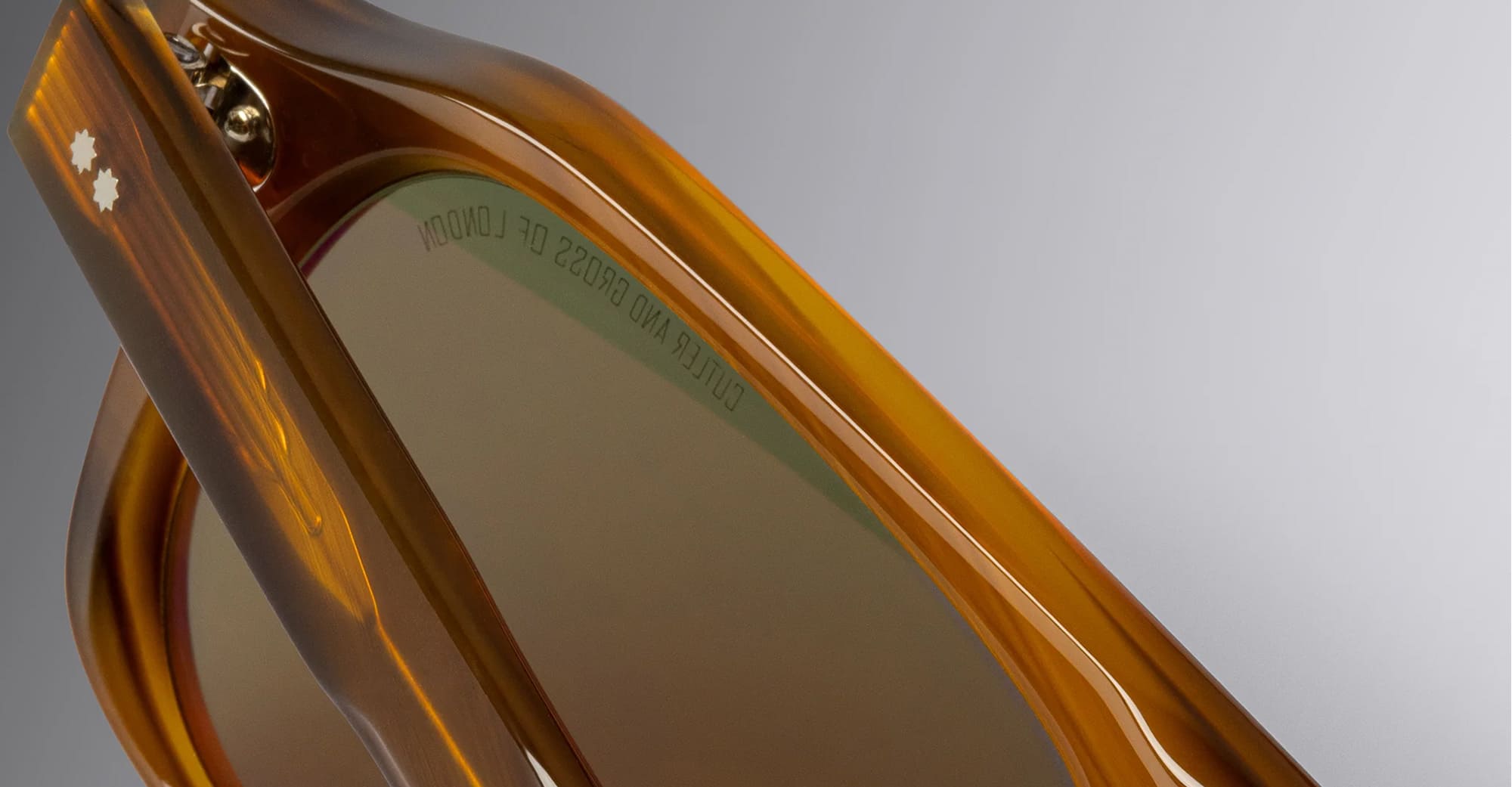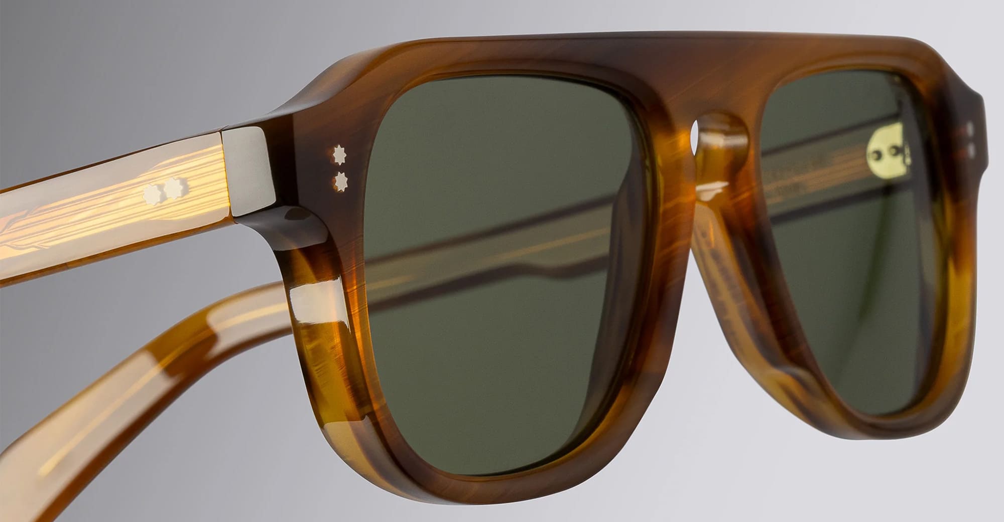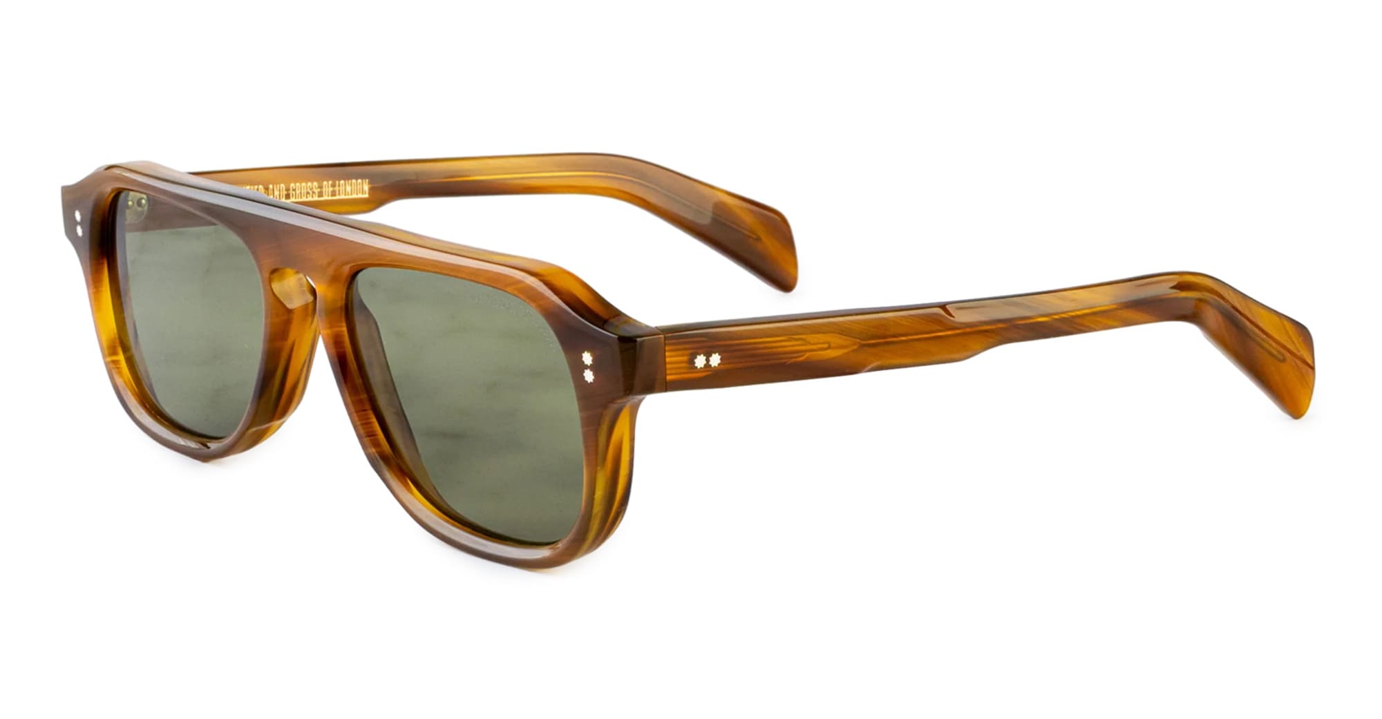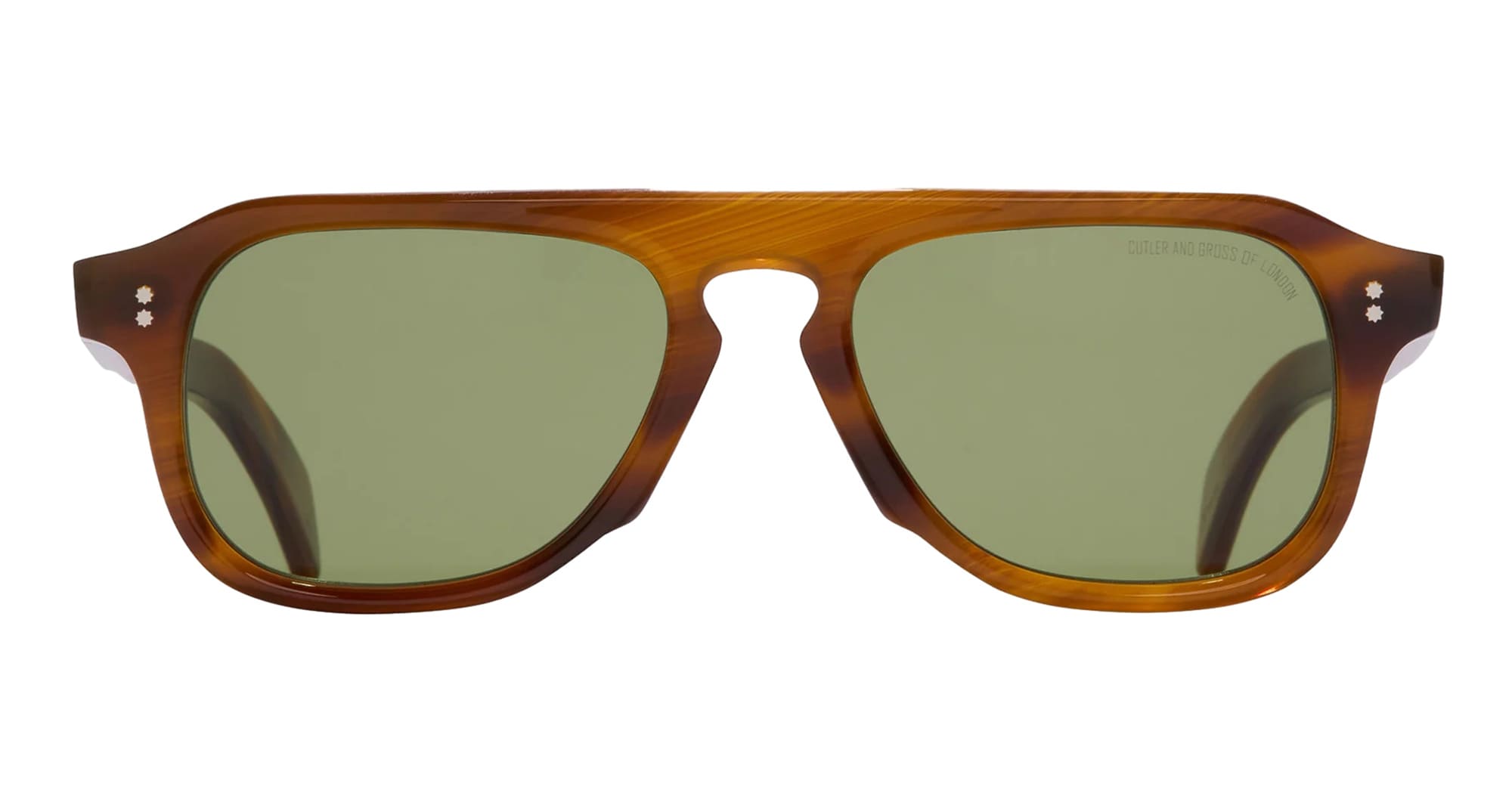 Cutler and Gross GR14 - MUSTARD HORN (CGSN-GR14-54-02) are elegant pilot sunglasses, part of the Graham Cutler s collection. They feature brown 8mm acetate frame with key hole nose bridge, acetate temples with Compass star pins, and green lens with 100% UV protection. Handcrafted in Italy by expert craftspeople.