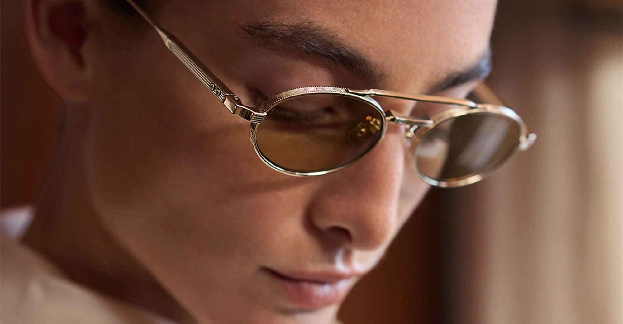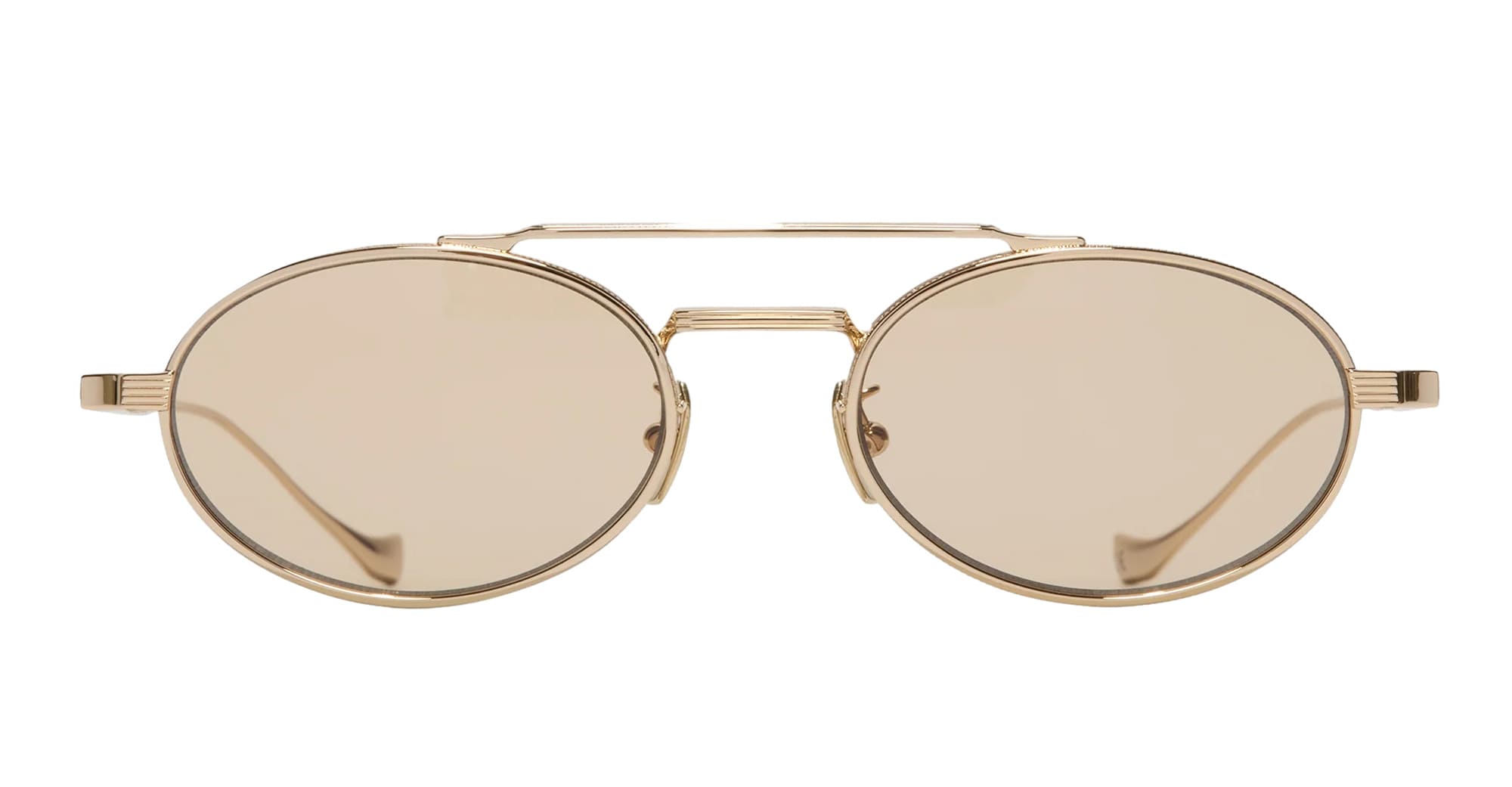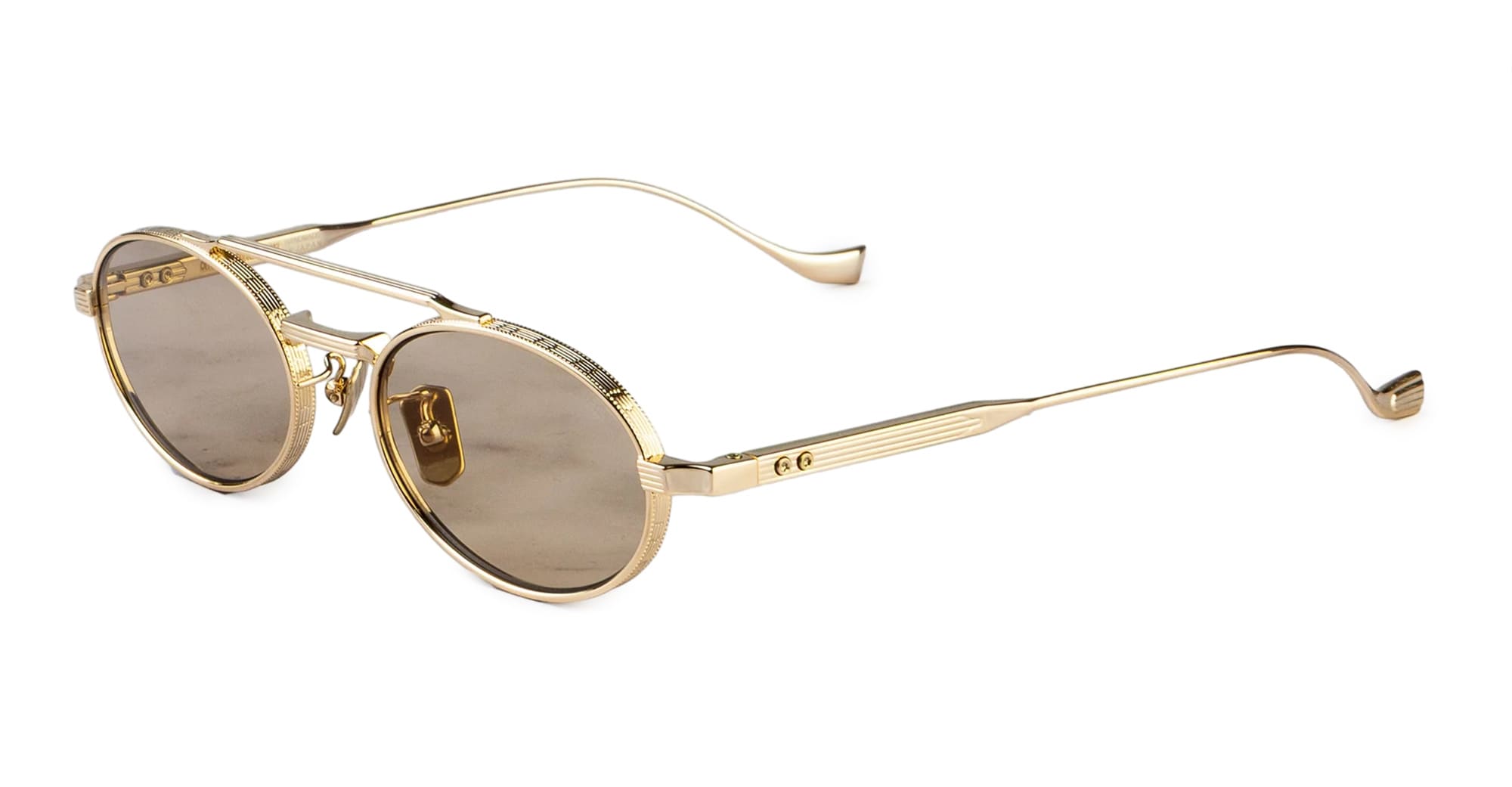 Cutler and Gross LADBROKE 1427 - GOLD (CGST-1427-51-02) are elegant oval sunglasses, inspired by legacy British supercars of the 60s and 70s - part of the The Knightsbridge Green collection. They feature gold titanium structure, linear Oyster pin brow bar and nose bridge, custom inner hinges, lasered logo inside temples, light brown Zeiss lens with 100% UV protection. Handcrafted in Sabae, Japan by expert craftspeople.
