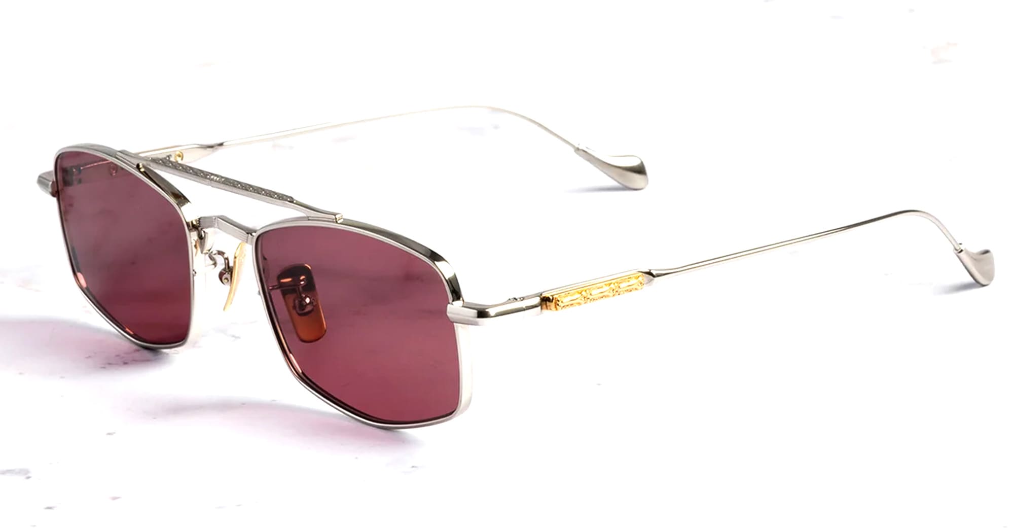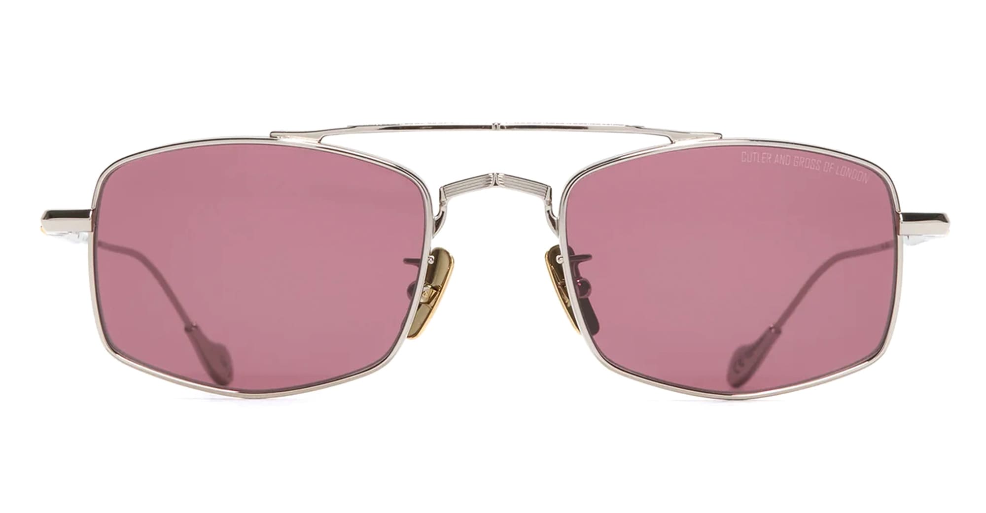 Cutler and Gross THE GREAT FROG - BOWIE / SILVER (GFSN-016-51-01) are lightweight rectangular navigator sunglasses, part of the The Great Frog Collaboration Collection. They feature silver titanium frame, double nose bridge with intricate stripe detail, The Great Frog's Bones Link emblem on the temples, burgundy lens with 100% UV protection. Handcrafted in Italy by expert craftspeople.