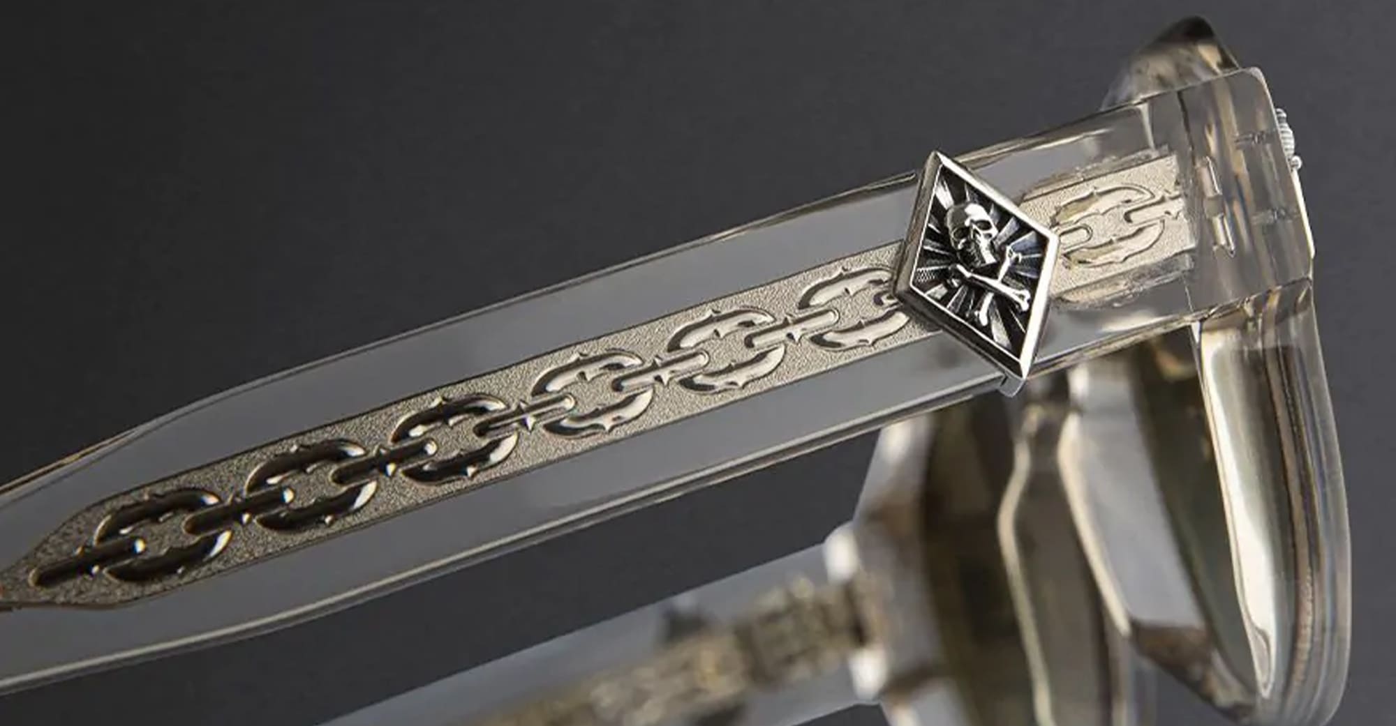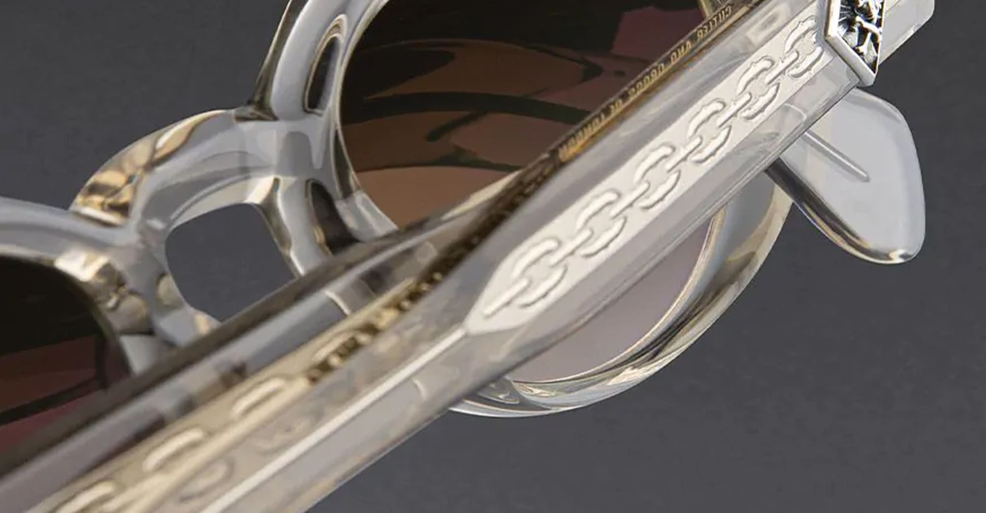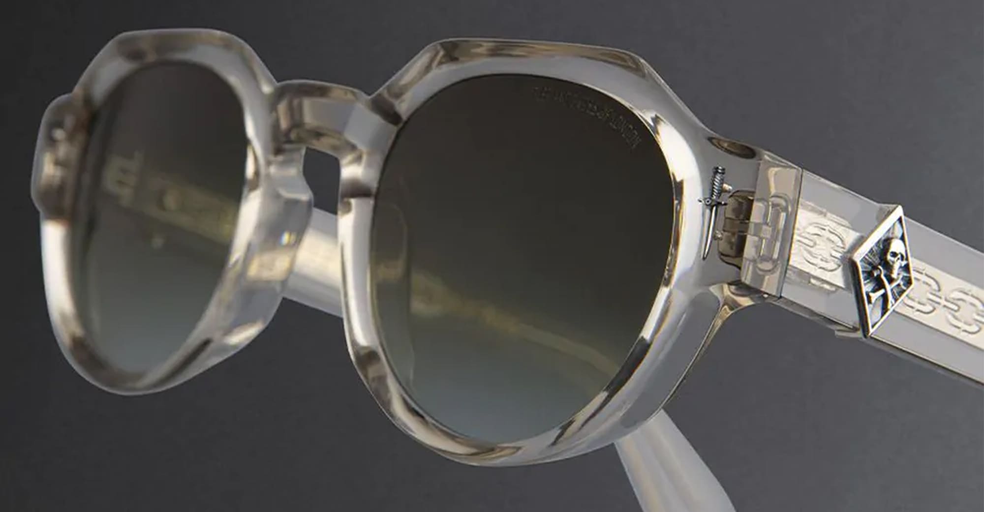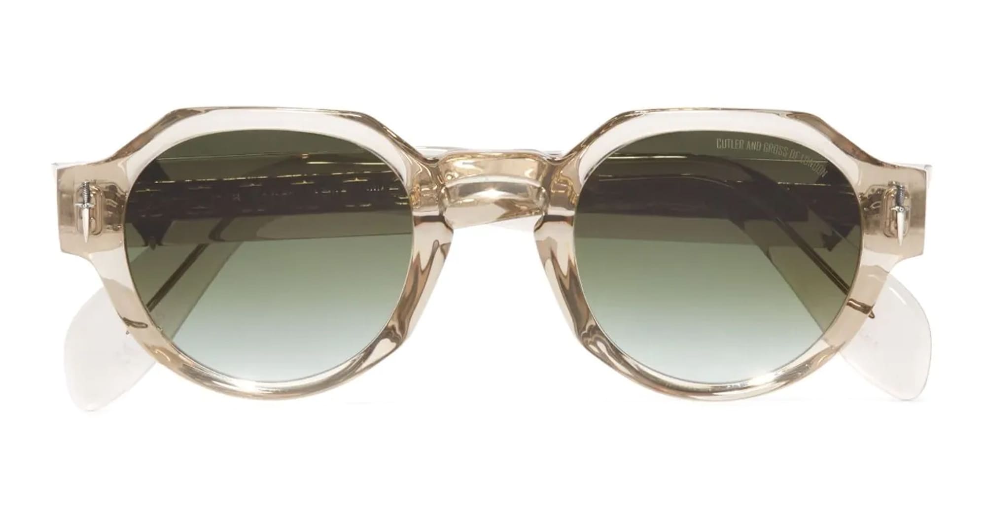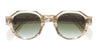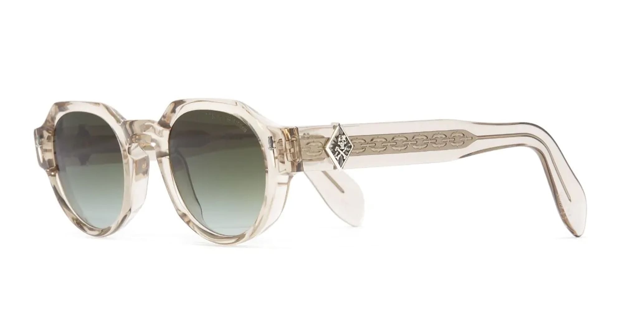 Cutler and Gross THE GREAT FROG - LUCKY DIAMOND I - SAND CRYSTAL (GFSN-006-48-05) are gothic-inspired round sunglasses with a flat-top design, part of the The Great Frog Collaboration Collection. They feature transparent sand beige acetate frame, hand-cast sterling silver Dagger front pins, 7-barrel hinge with rivets, hand-cast sterling silver Skull and Crossbones temple emblem, exposed custom Lock Down chain wirecore design, gold-foiled logo inside temple, plectrum temple tips, and gradient green lens with 100% UV protection. Handcrafted in Italy by expert craftspeople.