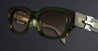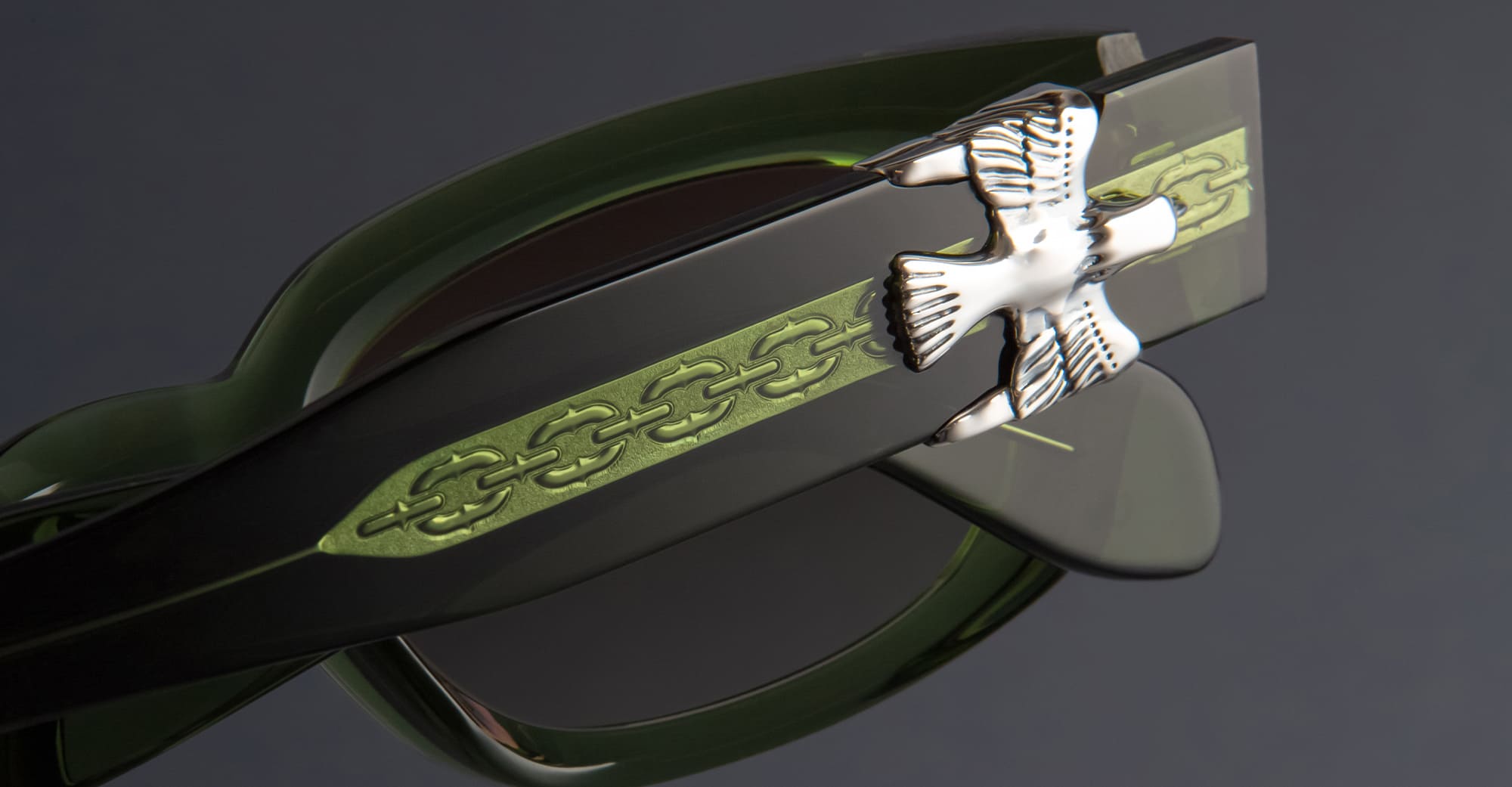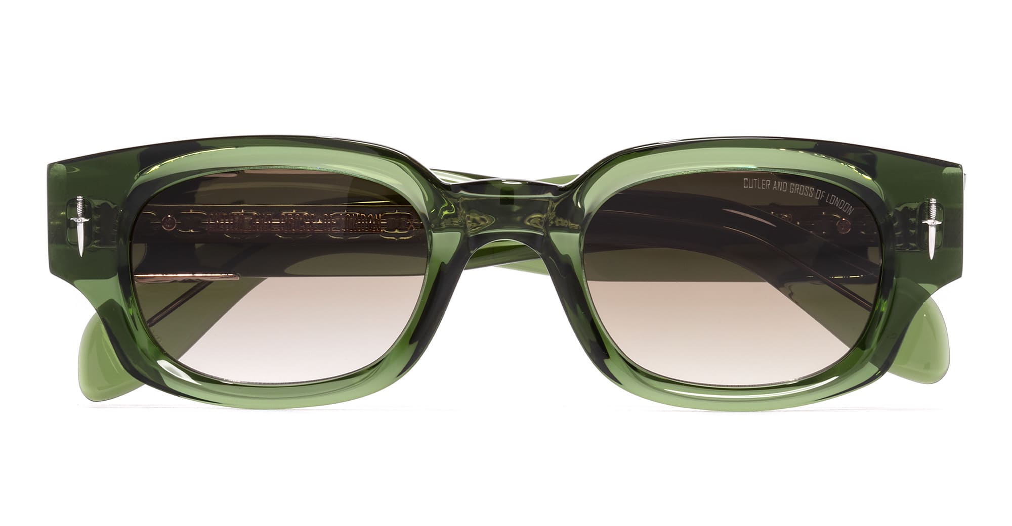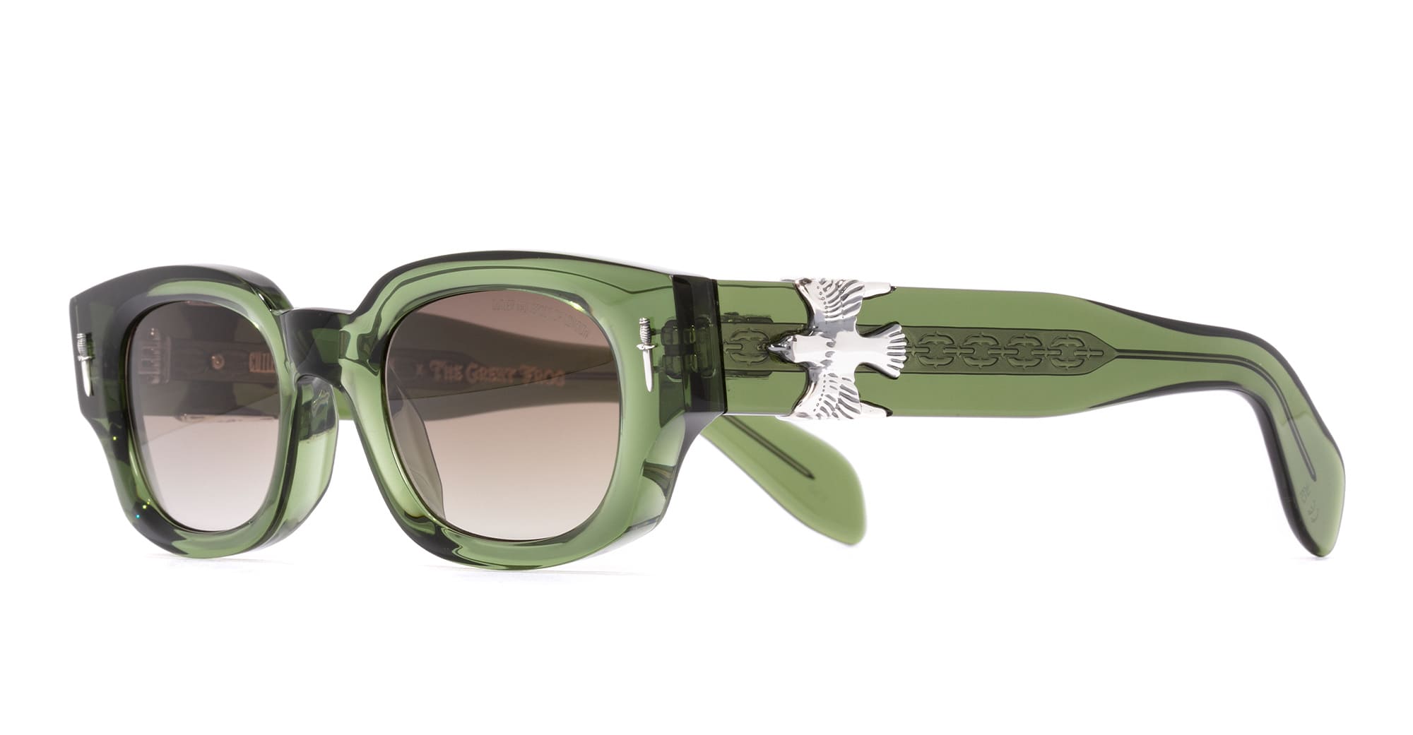 Cutler and Gross THE GREAT FROG - SOARING EAGLE / LEAF GREEN (GFSN-004-50-03) are old-school biker-inspired rectangular sunglasses, part of the The Great Frog Collaboration Collection. They feature leaf green acetate frame, hand-cast sterling silver Dagger front pins, 7-barrel hinge with rivets, hand-cast sterling silver Soaring Eagle temple emblem, exposed custom Lock Down chain wirecore design, gold-foiled logo inside temple, plectrum temple tips, and gradient brown lens with 100% UV protection. Handcrafted in Italy by expert craftspeople.