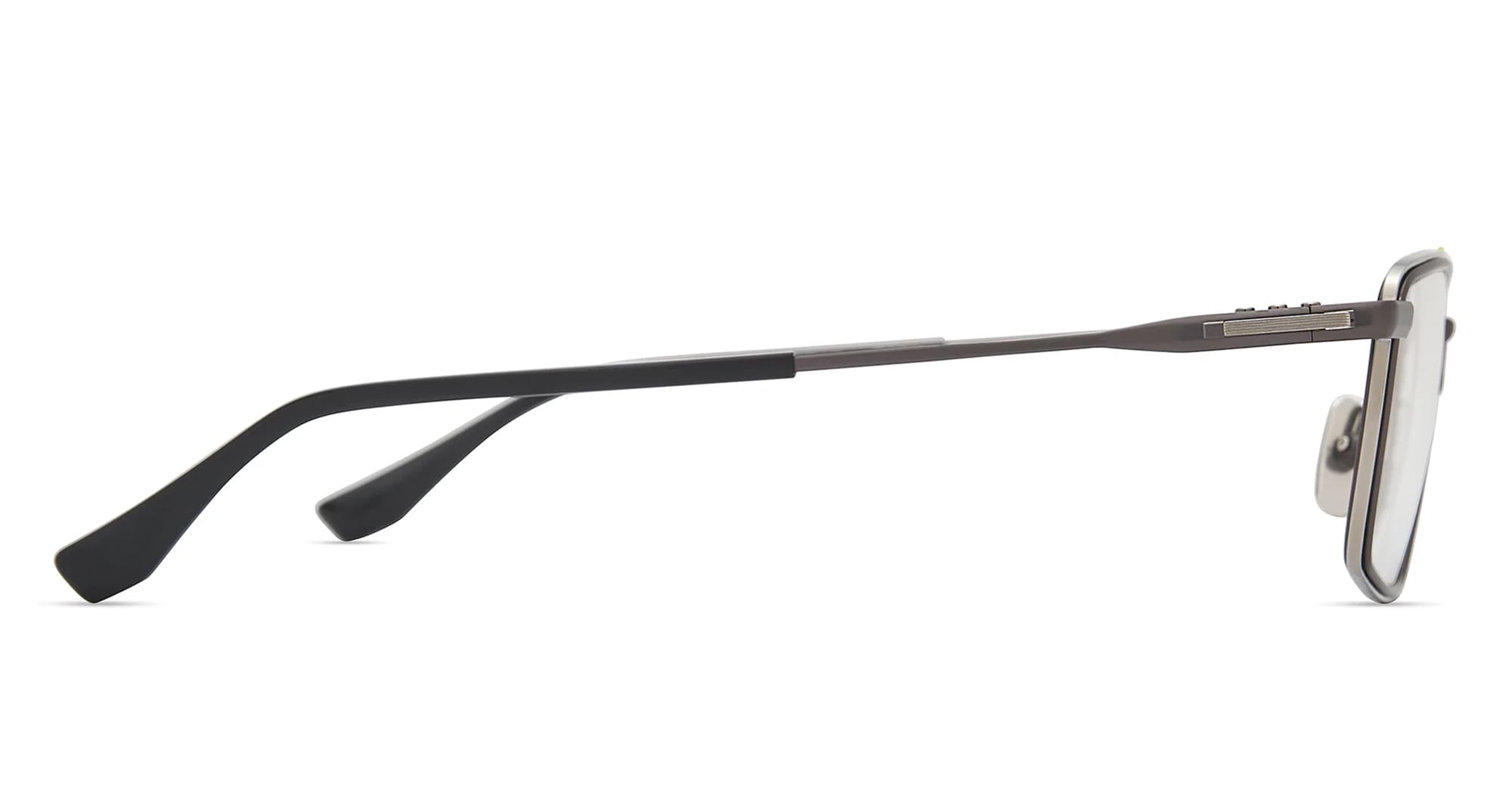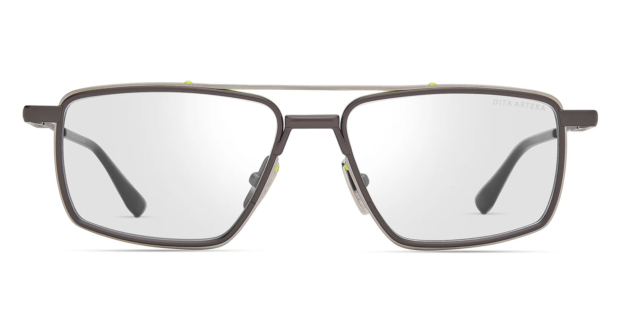 DITA ARTEKA - BLACK PALLADIUM / BLACK IRON RX (DTX199-A-01) are modern navigator eyeglasses, part of the exclusive Dita Collection.They feature continuous titanium frame with two-tone coloration, sculpted lens rims, architectural refined double bridge, multi-piece titanium temples with Japanese acetate temple tips, pressed line detailing, custom titanium nose pads.