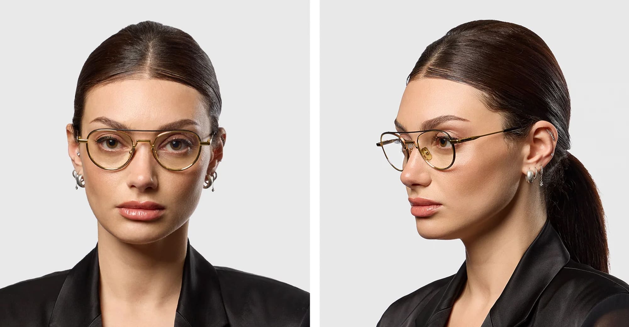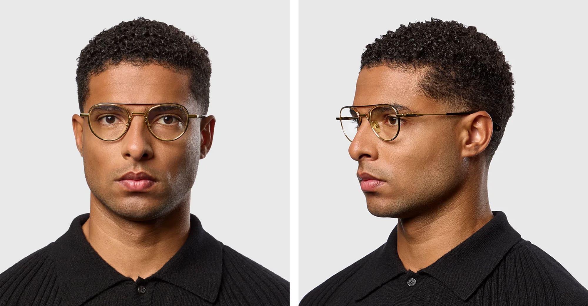 DITA ETHYX- BLACK IRON / YELLOW GOLD RX (DTX189-A-01) are vintage-inspired navigator sunglasses, part of the Dita eyewear collection. They feature a continuous one-piece titanium frame, flat top brow bar, sculpted titanium lens rim and bridge for contrast and dimensionality, multi-piece titanium temples adorned with pressed line detailing and Japanese acetate tips, custom diamond-pressed titanium nose pads.