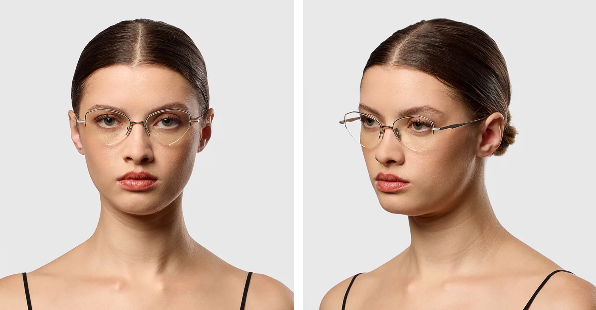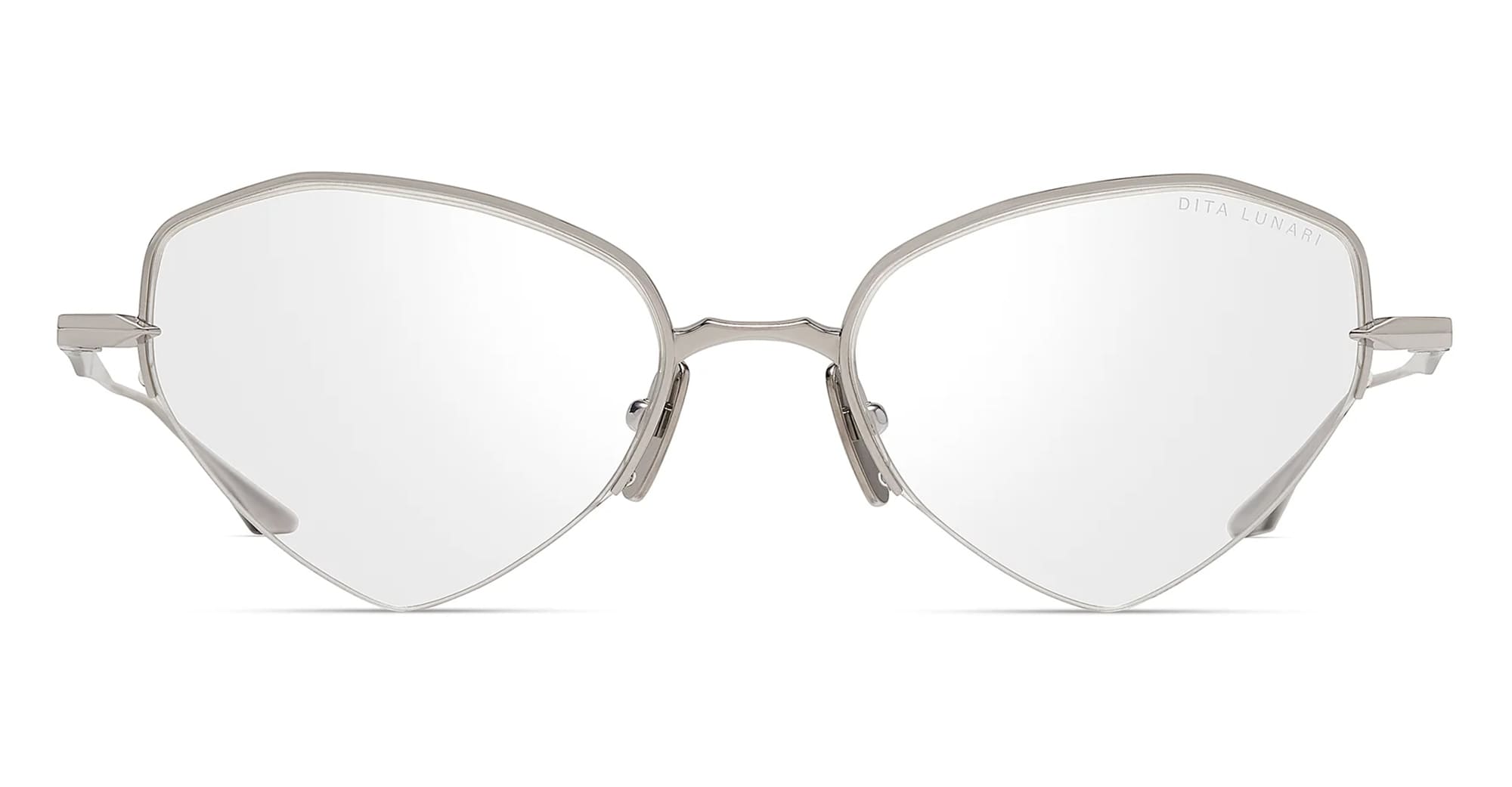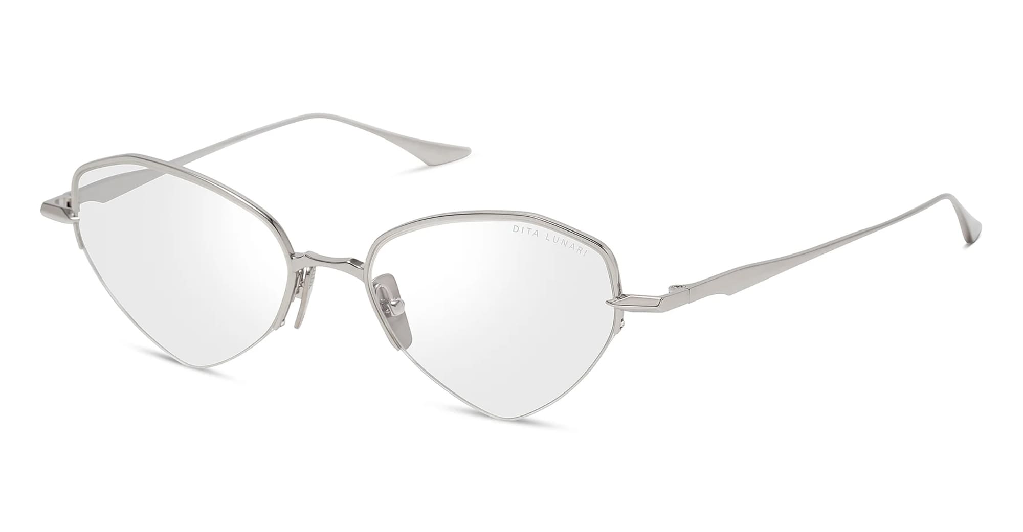 DITA LUNARI - SILVER RX (DTX193-A-03) are cat-eye eyeglasses made in Japan, part of the Dita eyewear collection.They feature unique half-rim silver titanium structure, titanium nose bridge with pressed line details, custom titanium nose pads, and sculpted titianium temples.