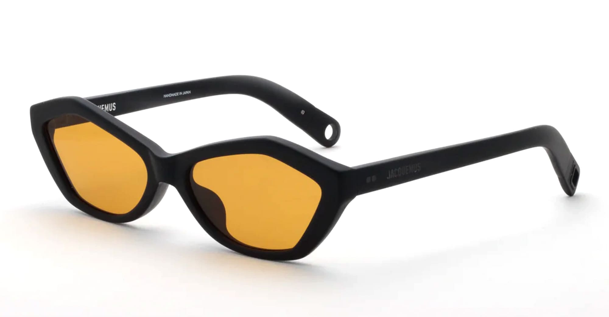 Jacquemus BAMBINO - MATT BLACK / AMBER LENS (JAC42C6SUN) are diamond shaped sunglasses with cat-eye silhouette, part of the Jacquemus x Linda Farrow collaboration. They feature matte black acetate frame, gold-plated logo on temple, black stainless steel circle and square temple tips, and amber lens with 100% UV protection.