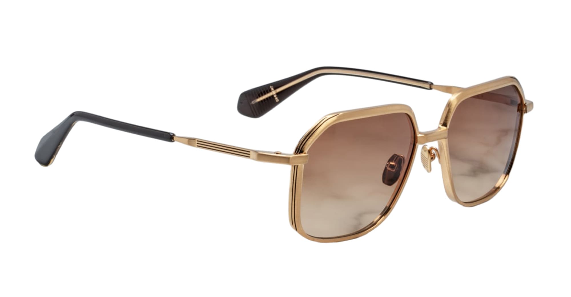 Jacques Marie Mage AIDA - GOLD (JMMID-40) are rectangular sunglasses made in Japan, part of the JMM Titanium Series. They feature a late- 70s-inspired 100% beta titanium frame with sculpted volumes and soft angles, walnut cellulose acetate temple tips, new V-shaped profile, dark gold custom hidden hinge, 4 base lens with backside anti-reflective treatment and 100% UV protection.