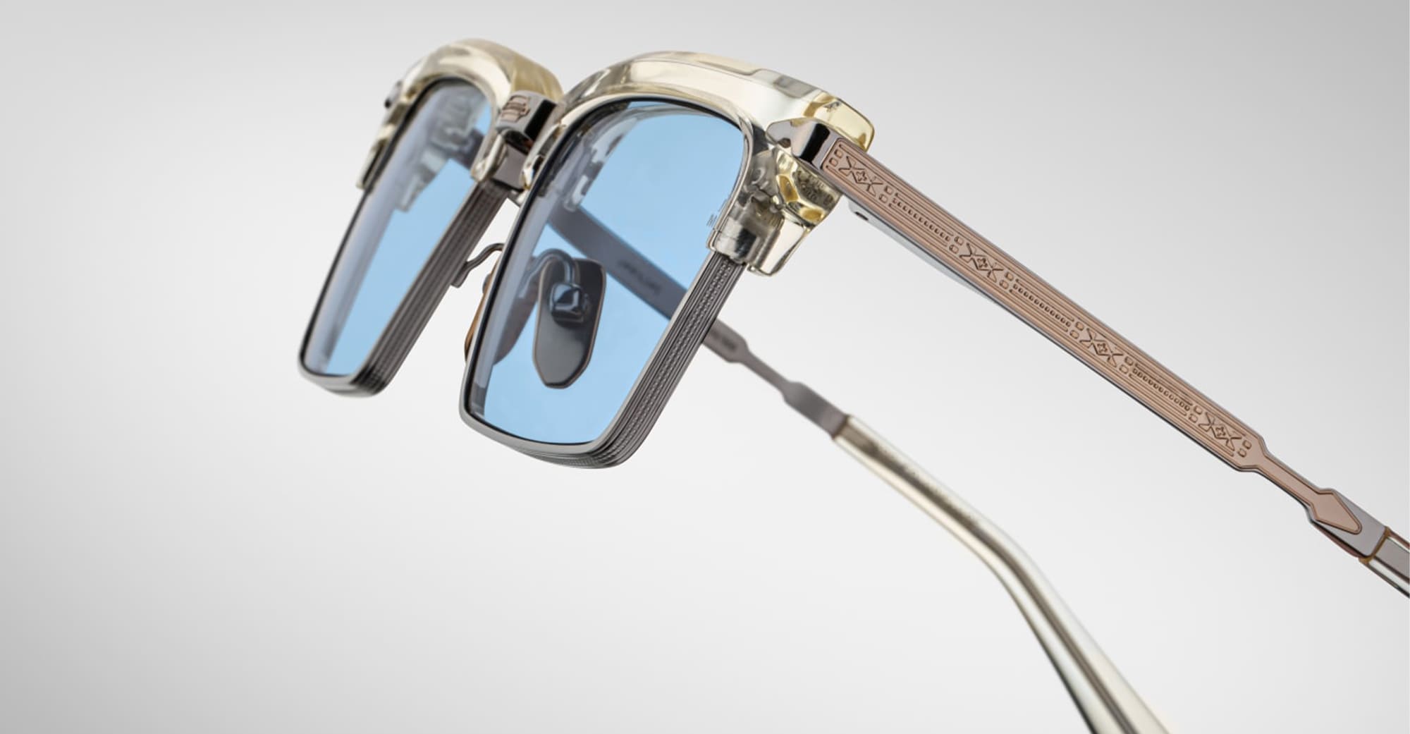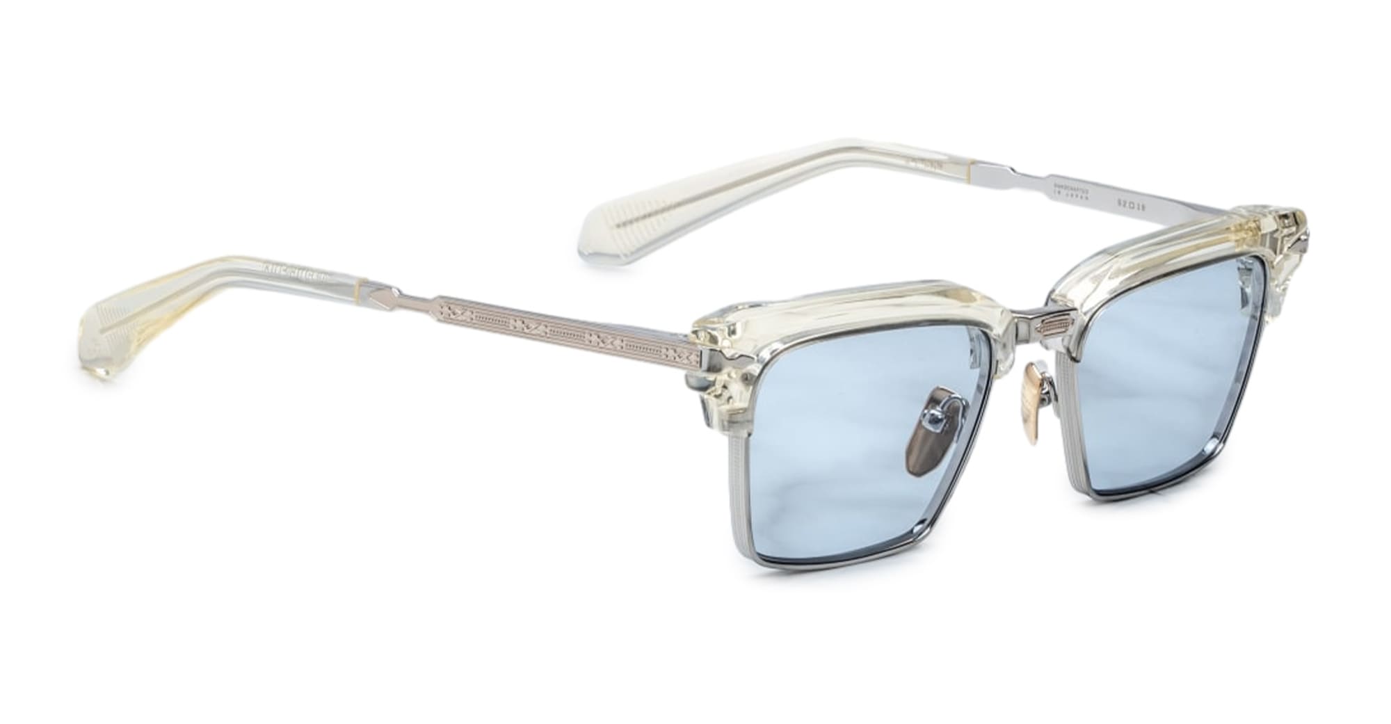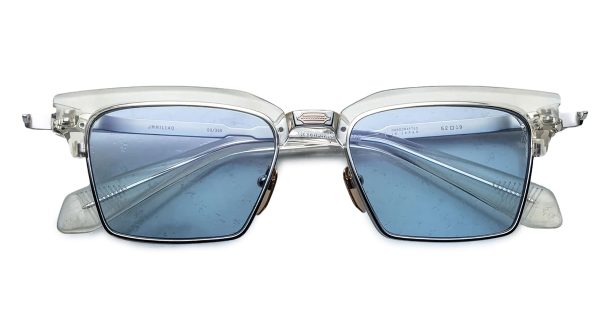 Jacques Marie Mage ALIN - BRUT (JMMIL-14Q) are '50s-inspired combo spectacles with prominent acetate brow, square titanium lens shape. They feature silver 100% beta titanium frame with light gold accents, champagne cured cellulose acetate brows, light gold engraved titanium temples with acetate tips, tension-secured custom arrowhead monoblock hinge, custom titanium nose pads, blue bird 4 base CR39 lens with backside anti-reflective treatment and 100% UV protection.