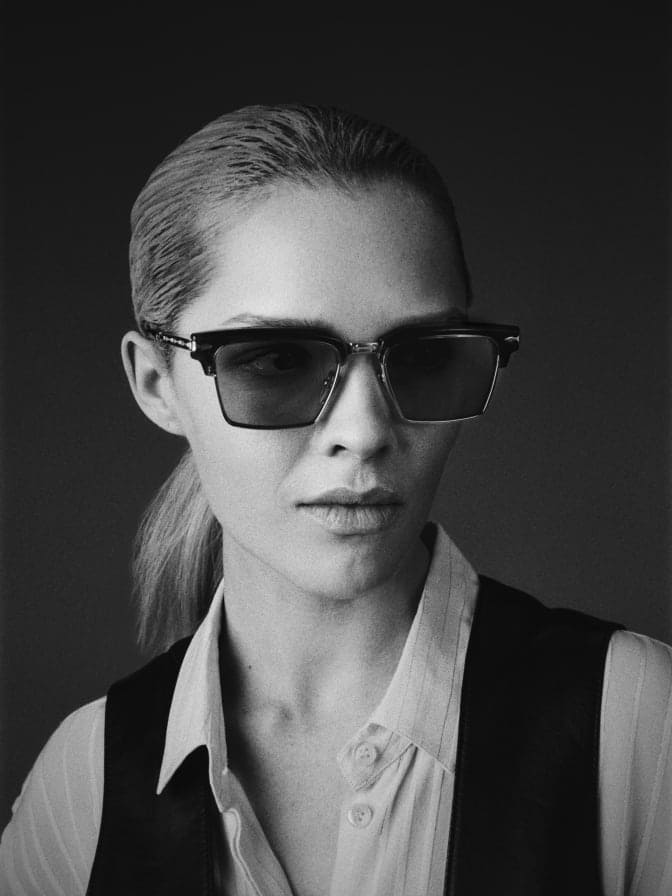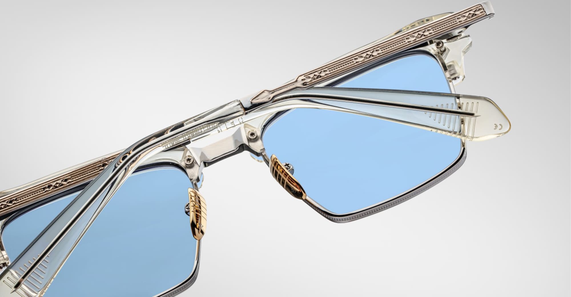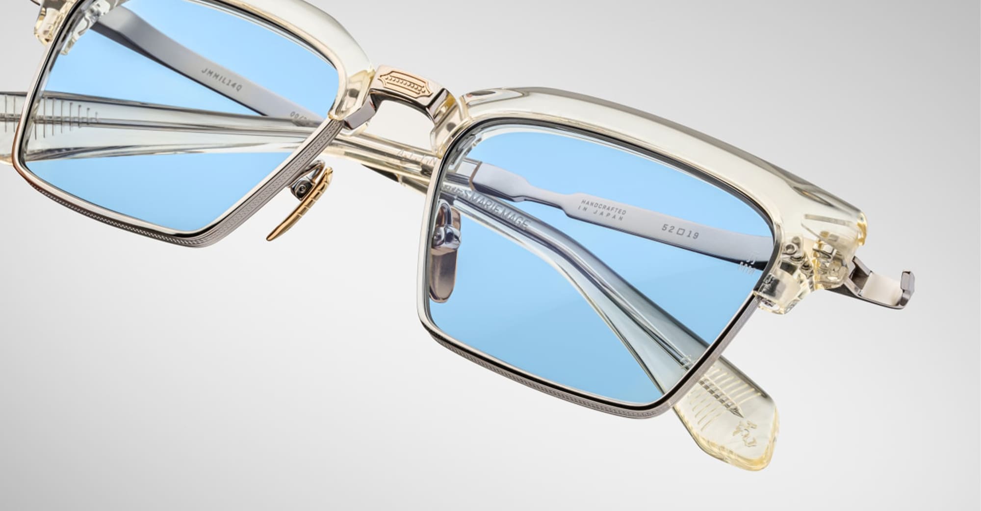 Jacques Marie Mage ALIN - BRUT (JMMIL-14Q) are '50s-inspired combo spectacles with prominent acetate brow, square titanium lens shape. They feature silver 100% beta titanium frame with light gold accents, champagne cured cellulose acetate brows, light gold engraved titanium temples with acetate tips, tension-secured custom arrowhead monoblock hinge, custom titanium nose pads, blue bird 4 base CR39 lens with backside anti-reflective treatment and 100% UV protection.