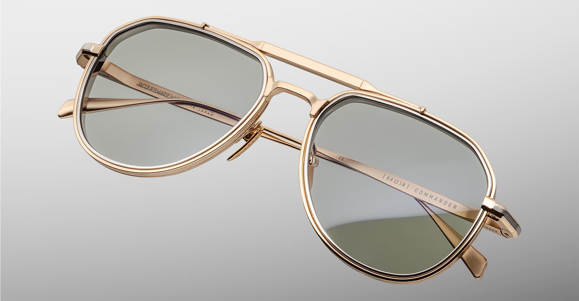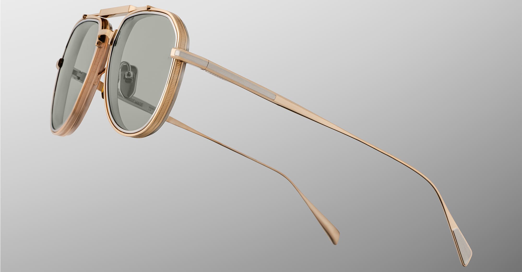 Jacques Marie Mage COMMANDER - ALTAN (JMMMD-54) are prestigious '70s-inspired pilot sunglasses with dual-tone bridge. They feature light gold 100% beta titanium frame with unique 6mm silver titanium eyerim inserts, double nose bridge, tension-secured custom hidden hinge, custom nose pads, titanium temples with wing decorated, mist green 4 base CR39 lens with backside anti-reflective treatment and 100% UV protection.