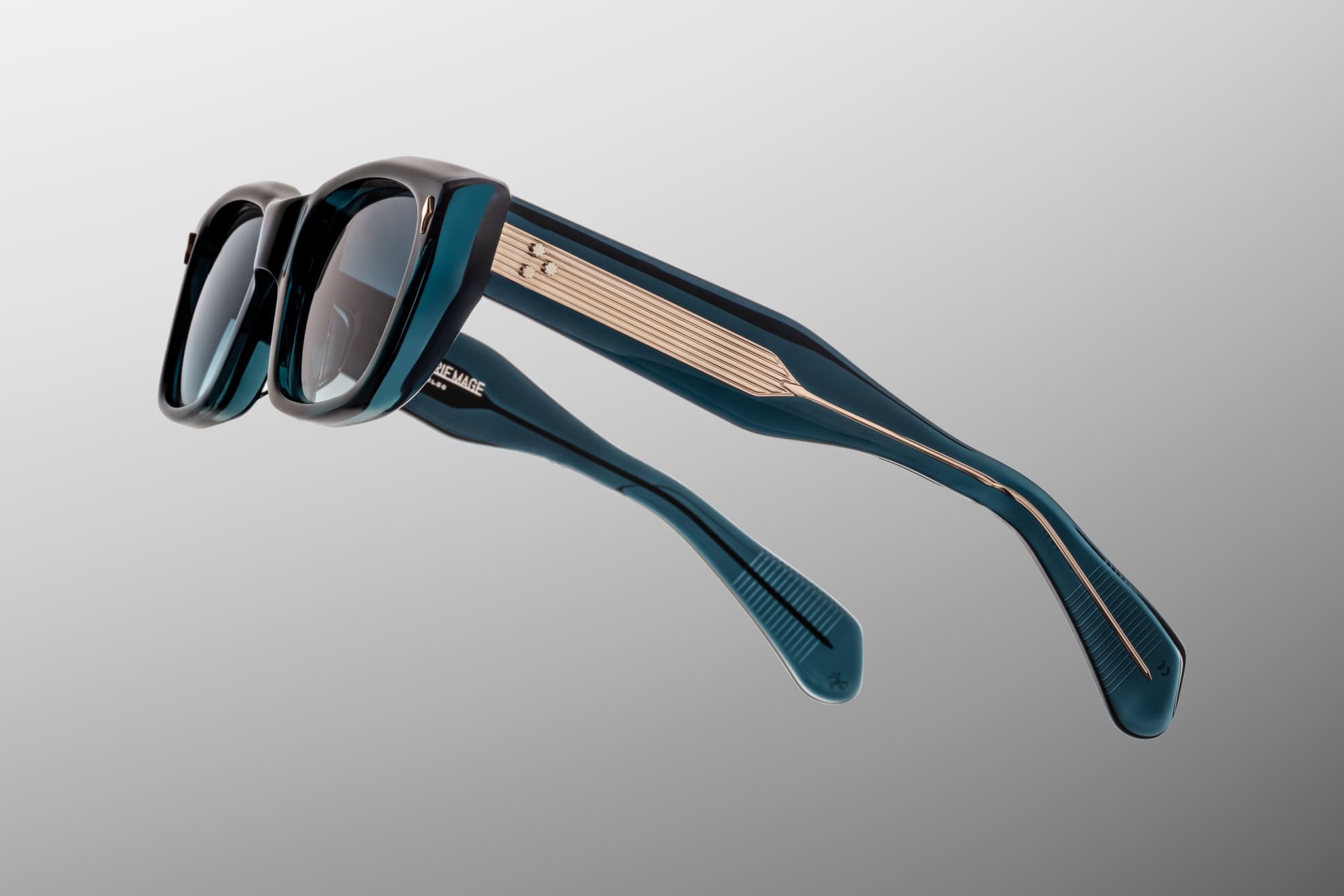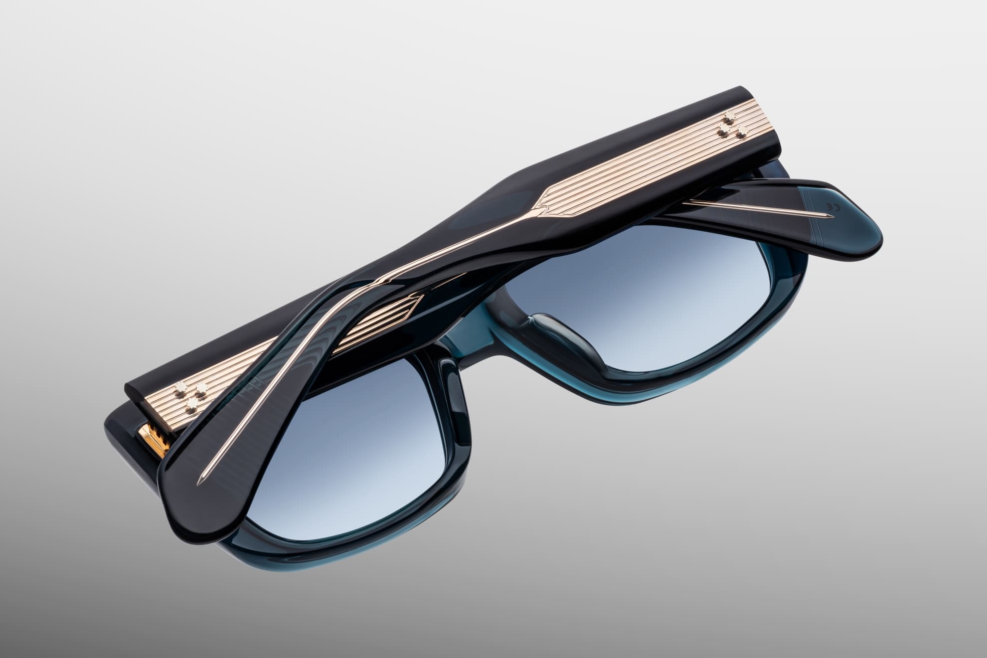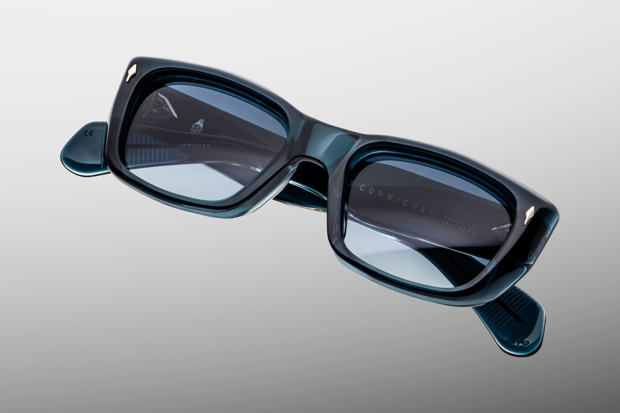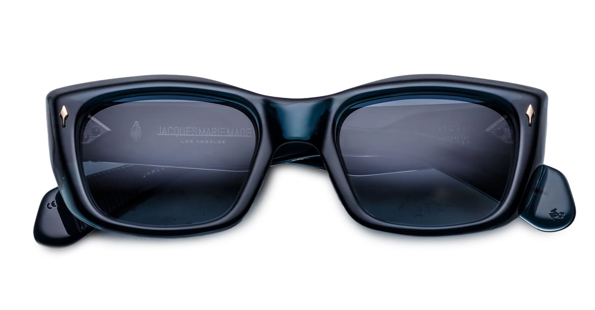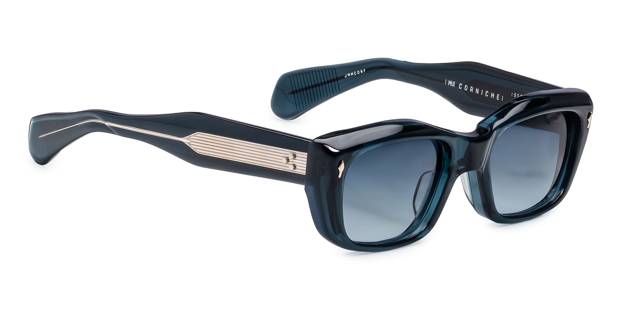 Jacques Marie Mage CORNICHE - INDIGO (JMMCO-9F) are sculptural rectangular late '60s-inspired sunglasses with a elongated shape, inspired by the French Riviera. They feature 10mm blue cellulose acetate frame with arched brow line, custom double laminated acetate temples with hand-painted burgundy epoxy inlays, gold arrowhead front pins, exposed 'classic' wirecore, tension-secured custom 9 barrel hinge, gradient blue 4 base CR39 lens with backside anti-reflective treatment and 100% UV protection.
