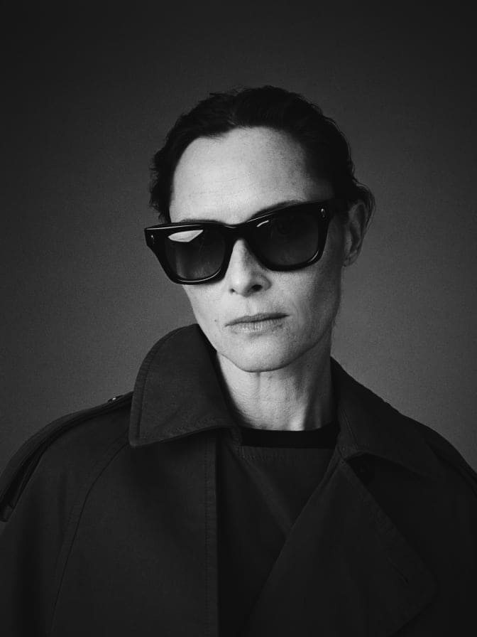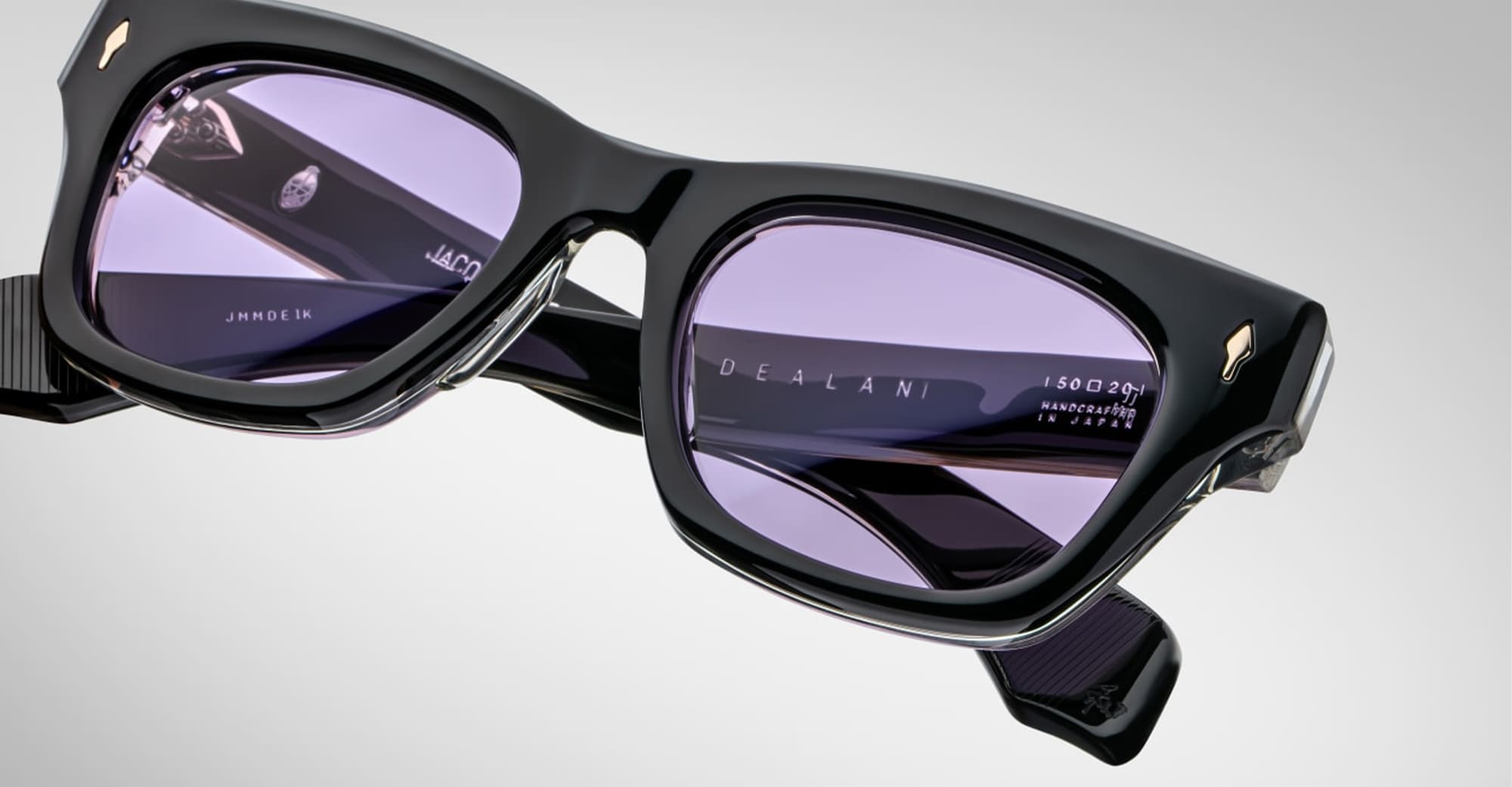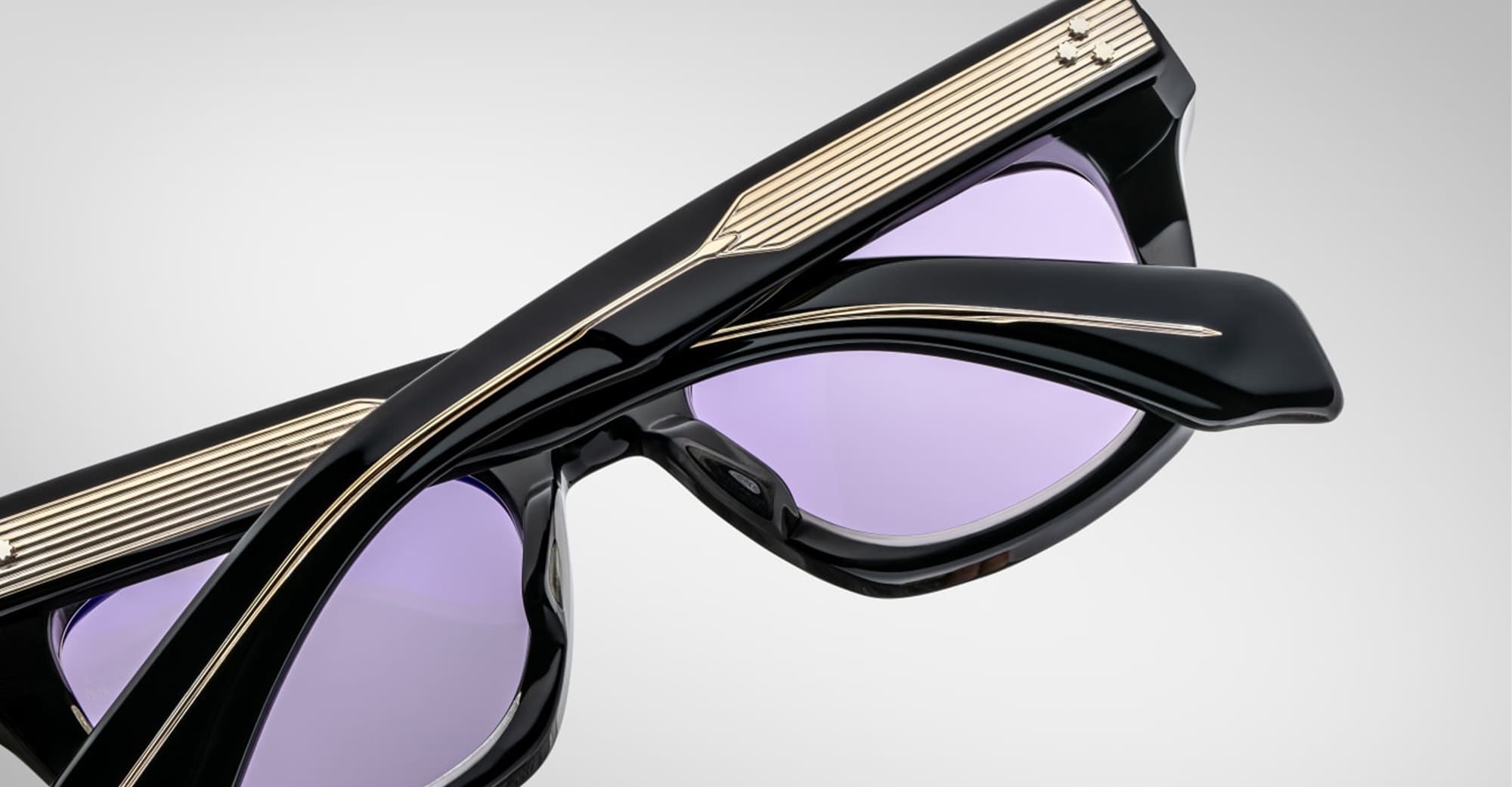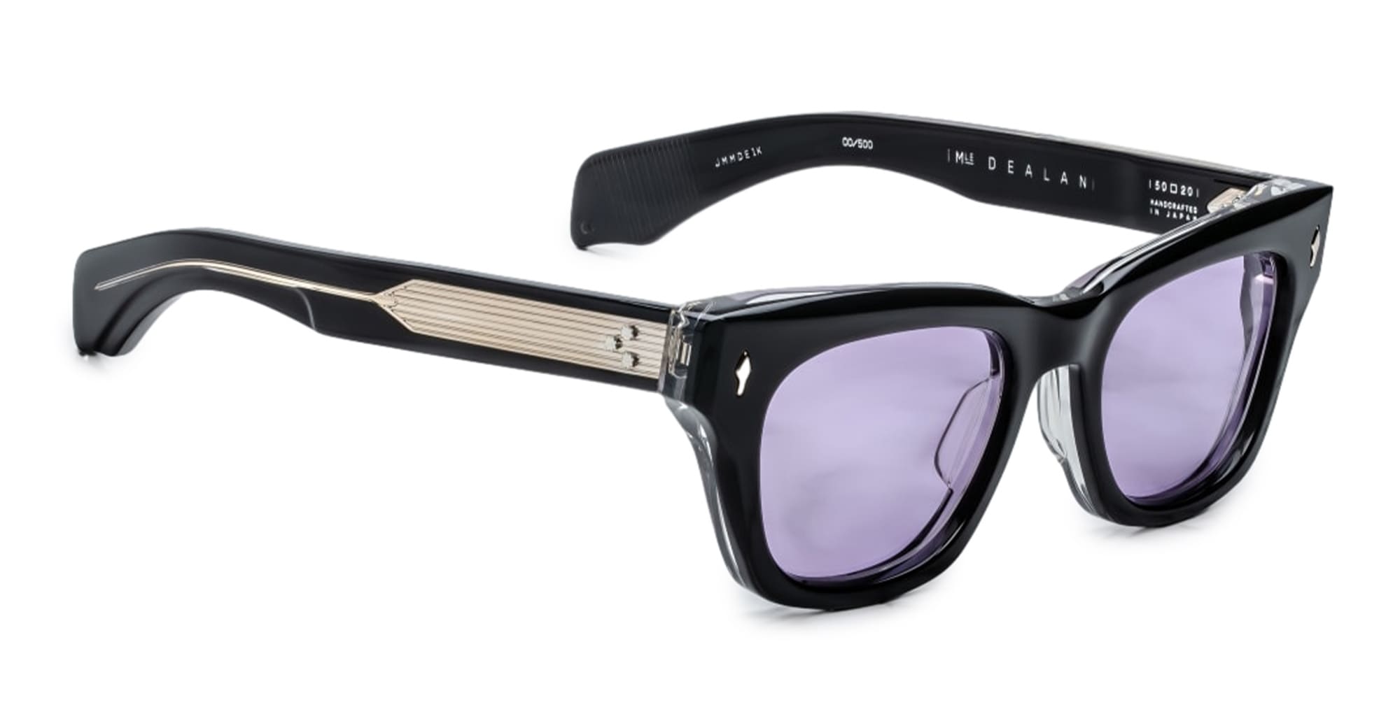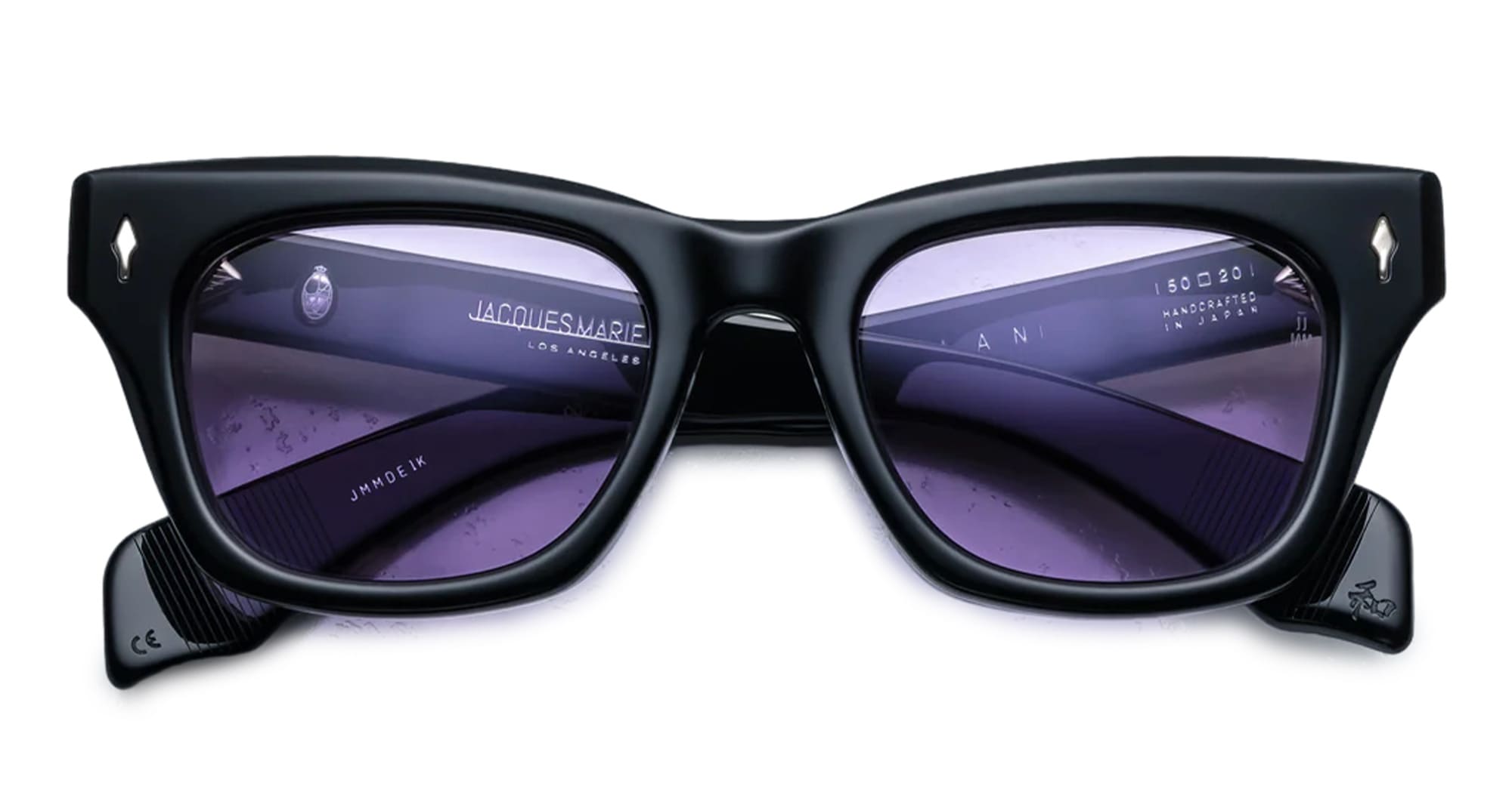 Jacques Marie Mage DEALAN - MAVERICK (JMMDE-1K) are squared sunglasses with subtle cat-eye shape, one of the JMM icon, homage to the relationship between Bob Dylan and his spectacles during the '60. They feature black tortoise cellulose acetate frame, custom double laminated acetate temples, light gold signature arrowhead front pins, exposed wirecore, tension-secured custom 7 barrel hinge, iris 6 base CR39 lens with backside anti-reflective treatment and 100% UV protection.