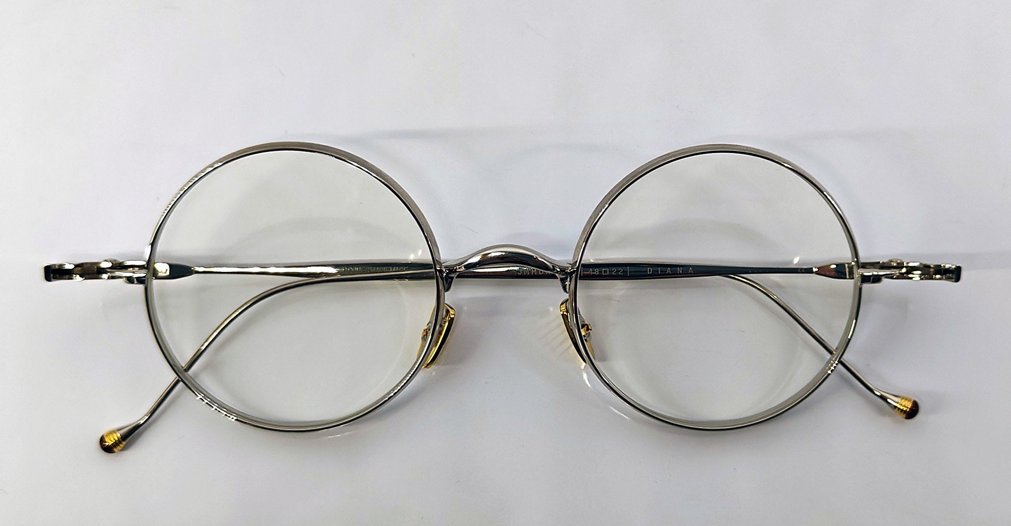 Jacques Marie Mage DIANA - SILVER RX (JMMDNRX-41) are minimal, lightweight round eyeglasses made in Japan. Inspired by Diana Ross, silver 100% beta titanium frame, hidden hinge with burgundy epoxy temple tips, custom nose pad with logo and hairline engraving.