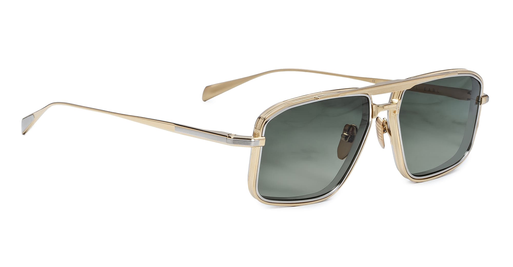 Jacques Marie Mage EARL - MUSKET (JMMER-12M) are navigator sunglasses with a '70s-inspired sleek design. They feature dark gold 100% beta titanium frame, with unique silver 4mm eyerim titanium insert, tension-secured custom hidden hinge, custom nose pads, and moss green 4 base CR39 lens with backside anti-reflective treatment and 100% UV protection.