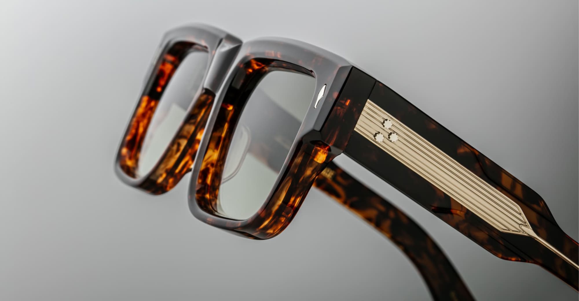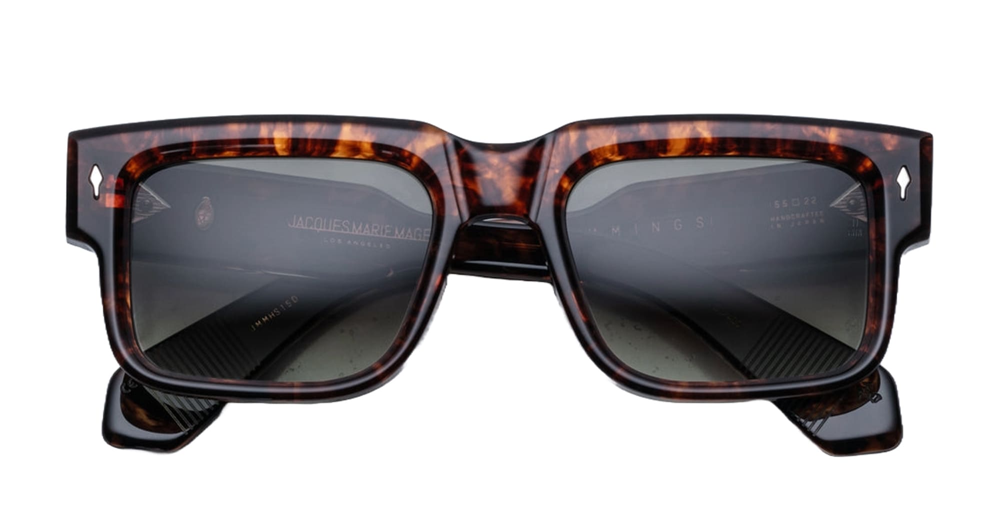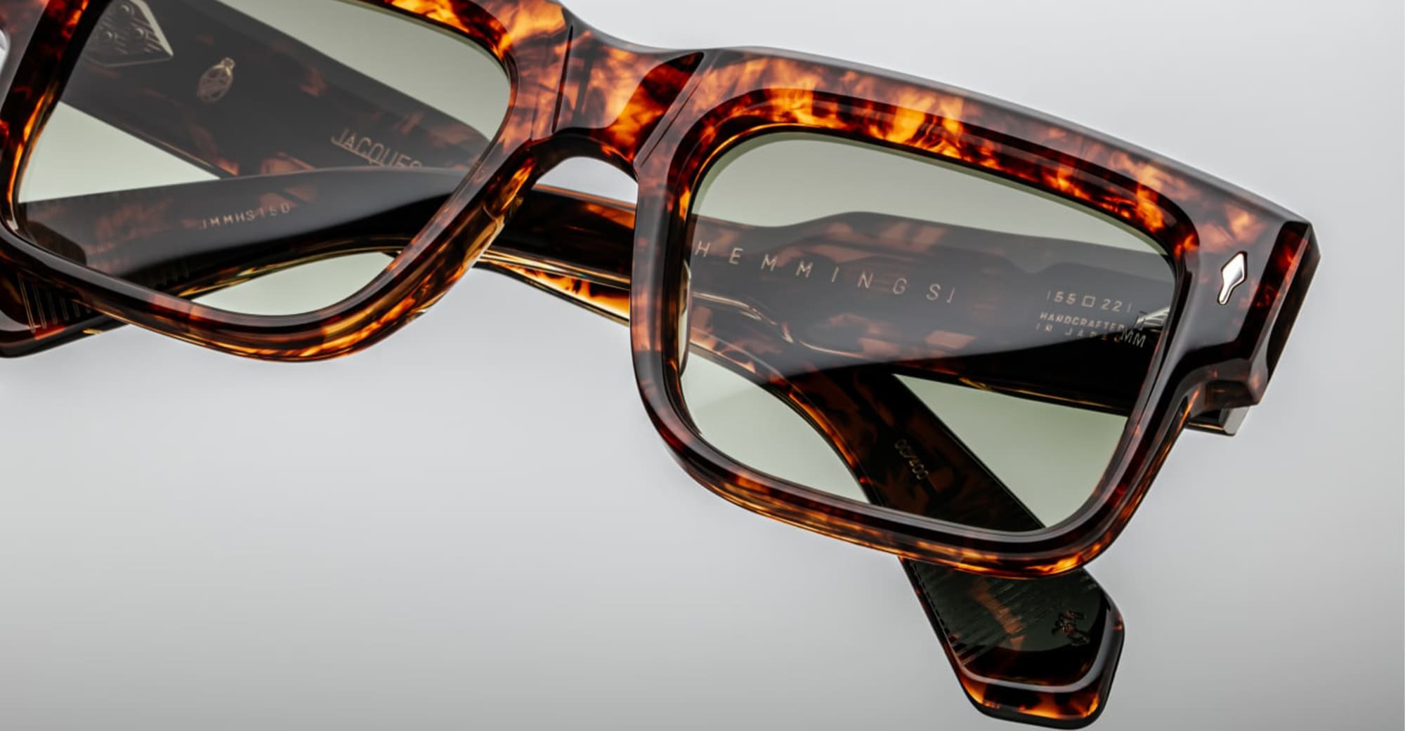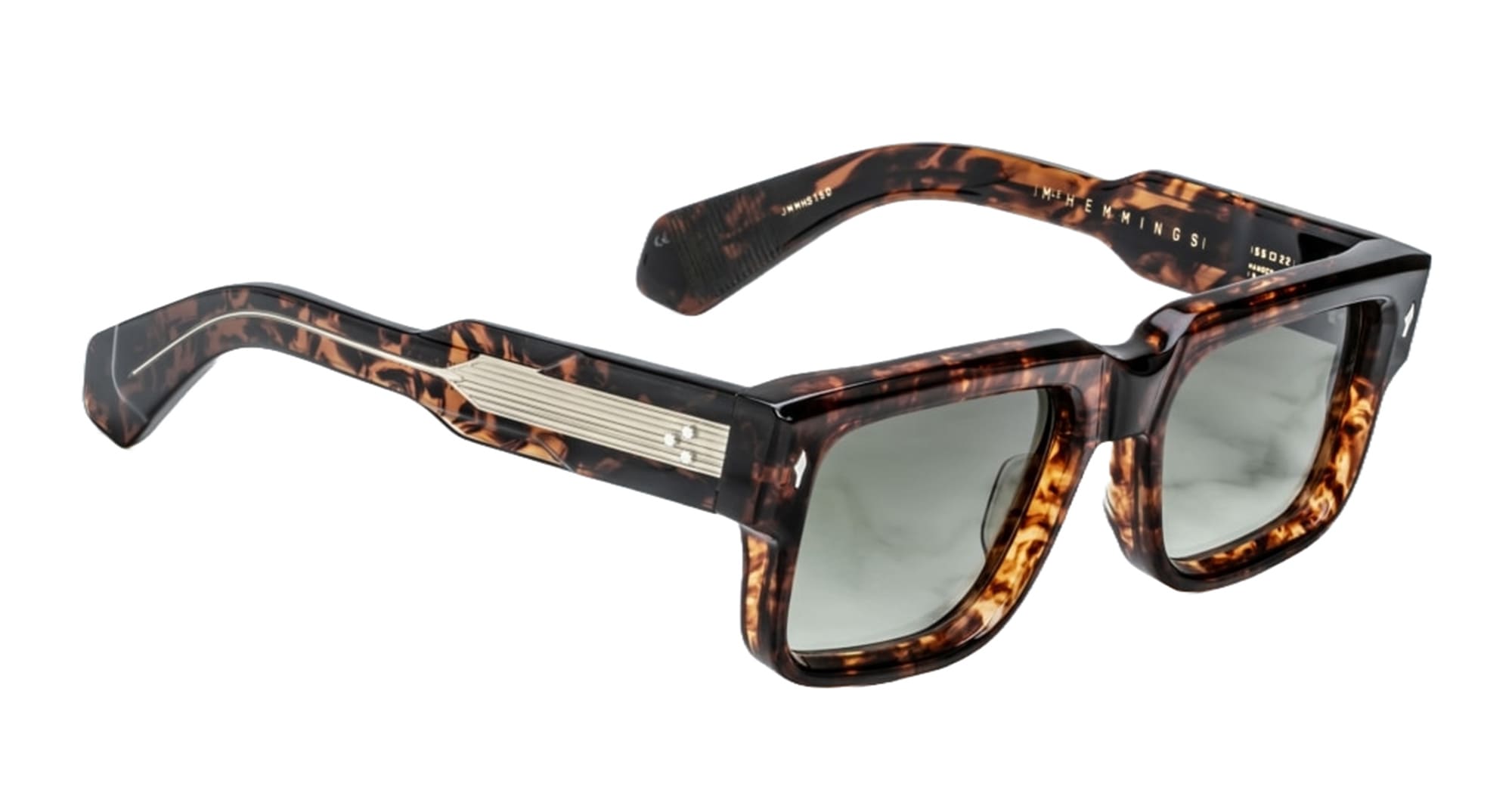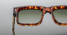 Jacques Marie Mage HEMMINGS - SAMOA (JMMHS-15D) are bold rectangular 60s-inspired sunglasses that embraces a charming combination of strength and swagger, inspired by English actor David Hemmings. They feature brown 10mm cured cellulose acetate frame with custom double laminated acetate temples, exposed dark gold wirecore engraved design, tension-secured custom 9 barrel hinge, light bottle green gradient 6 base CR39 lenses with backside anti-reflective treatment and 100% UV protection.