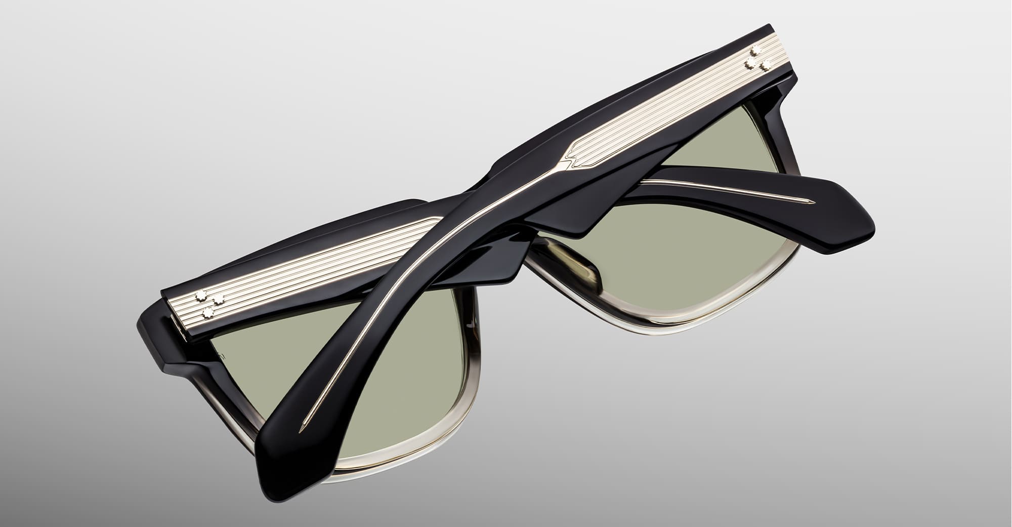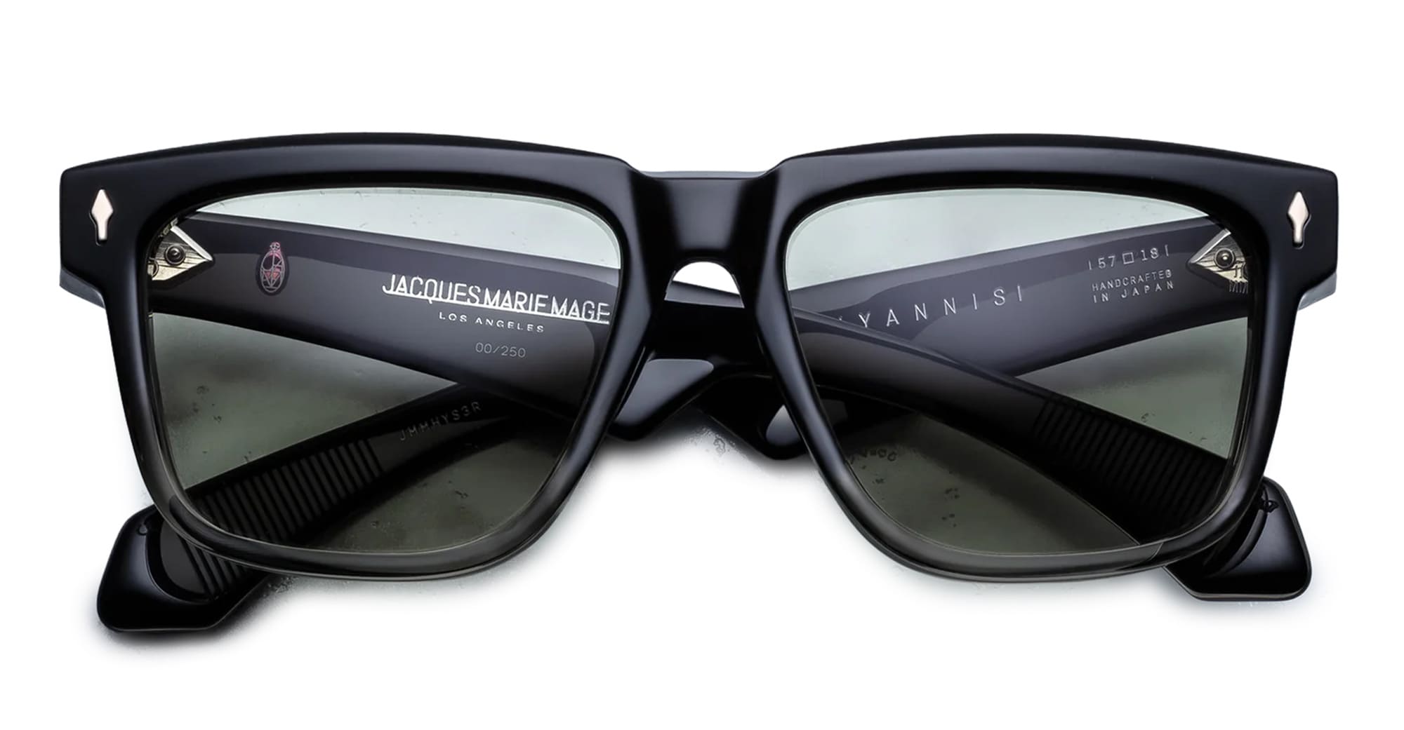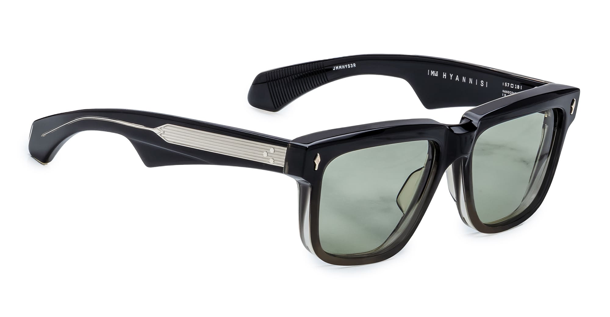 Jacques Marie Mage HYANNIS - BLACK FADE (JMMHYS-3R) are generous early-'60s rectangular sunglasses, inspired by the classic Saratoga sunglasses worn by John F. Kennedy. They feature 10mm black fade cellulose acetate frame, custom double laminated acetate temples, sterling silver arrowhead front pins, exposed classic wirecore, tension-secured custom 7 barrel hinge, light bottle green 6 base CR39 lens with backside anti-reflective treatment and 100% UV protection.