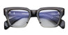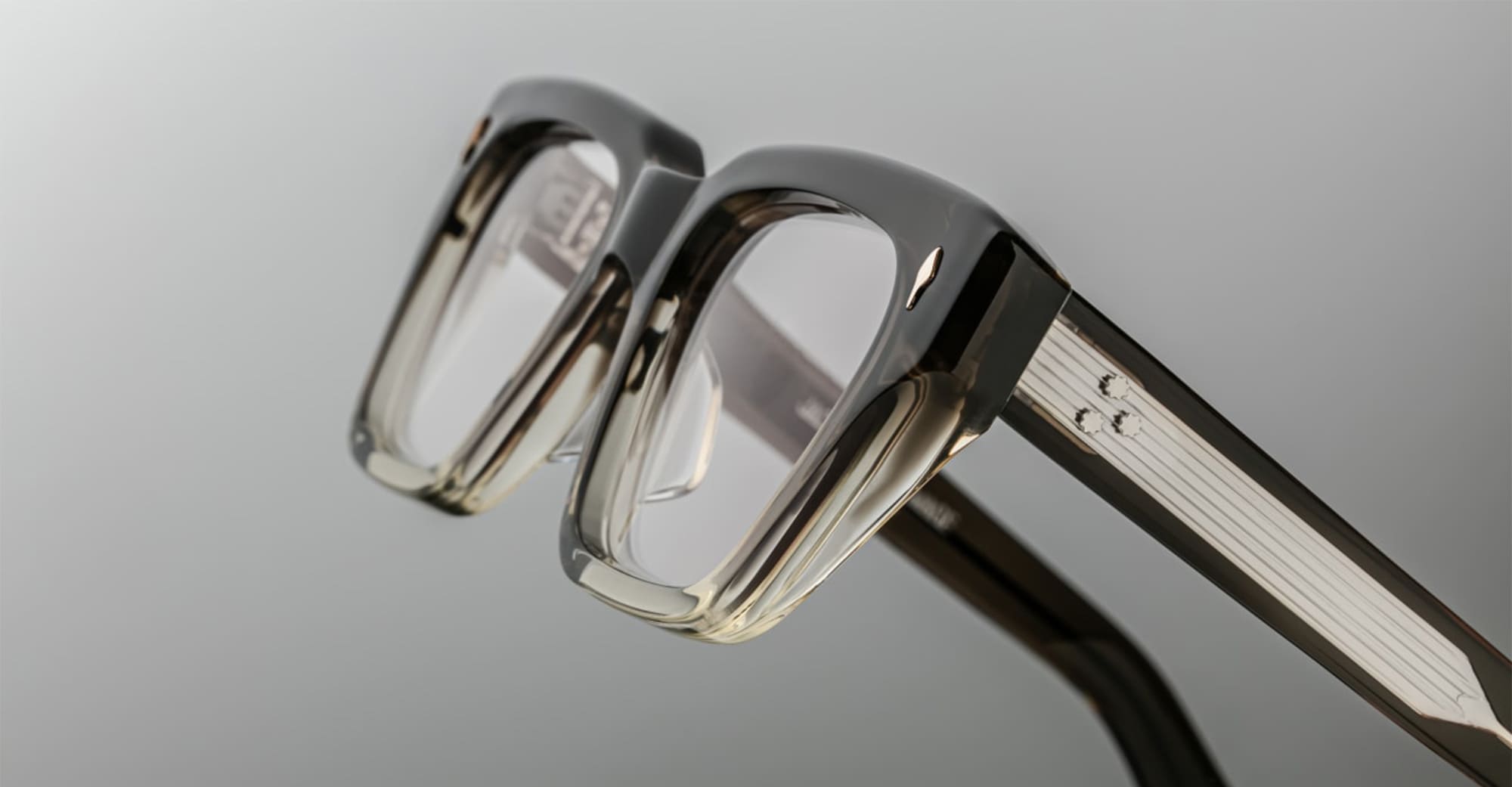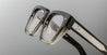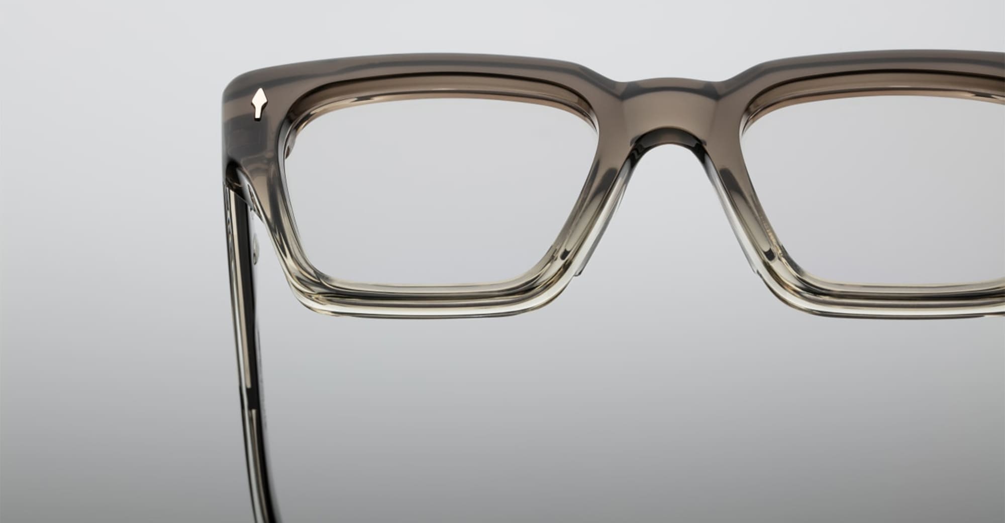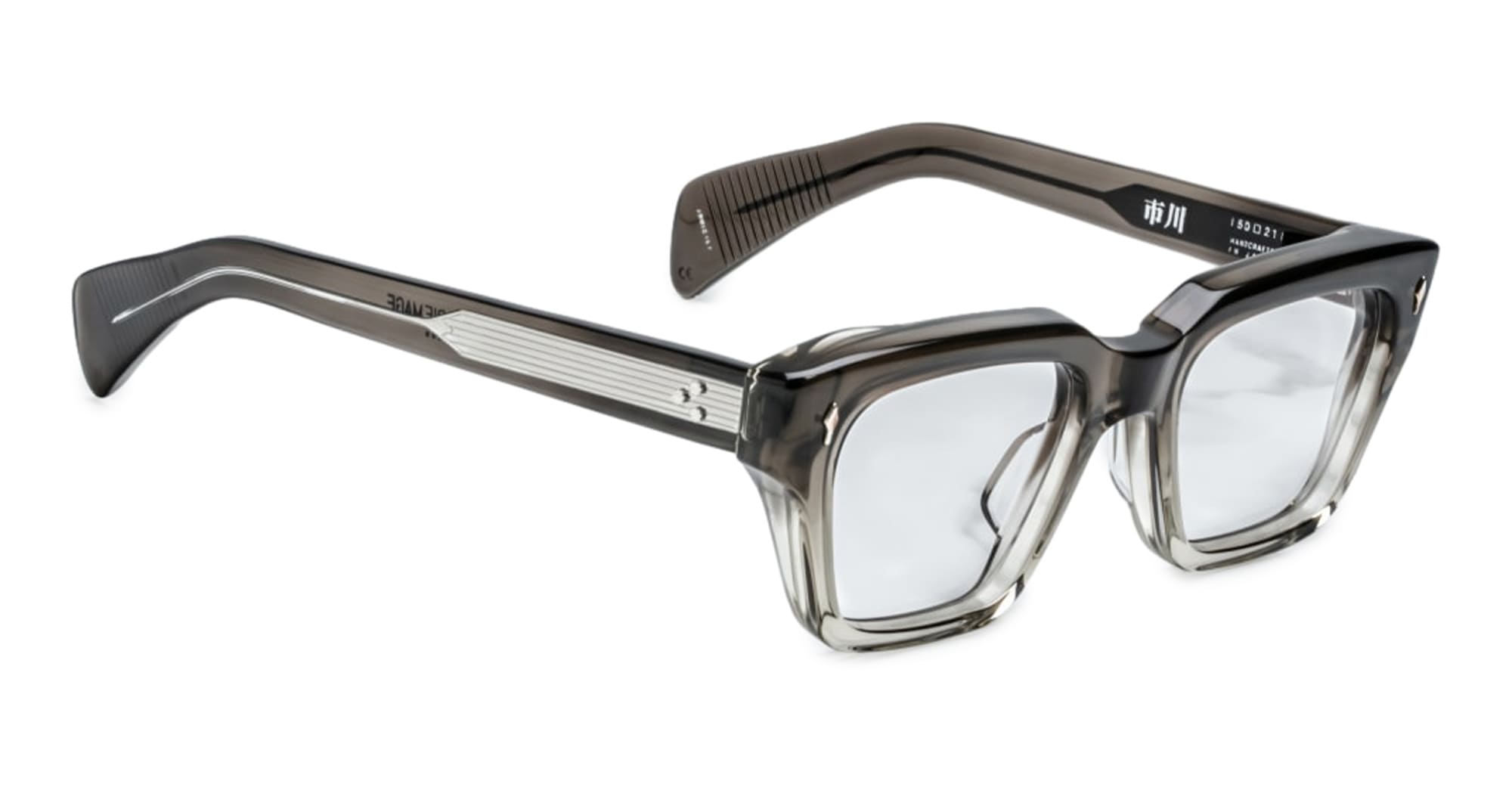 Jacques Marie Mage ICHIKAWA - SMOKE FADE RX (JMMICRX-15Y) are modern trapeze shape eyeglasses with energetic midcentury feel, inspired by the actual glasses worn by Japanese film director Kon Ichikawa. They feature 10mm fade grey cured cellulose acetate frame, custom double laminated temples, silver signature arrowhead front pin, exposed wirecore, tension-secured custom 7 barrel hinge with spur-shaped rivets, domed 3D metal cameo logo.