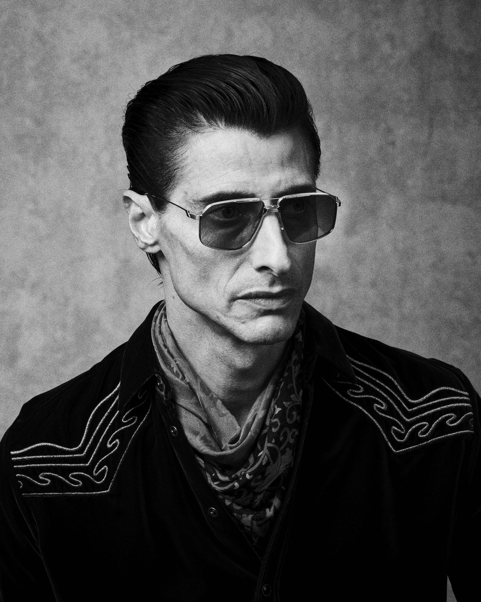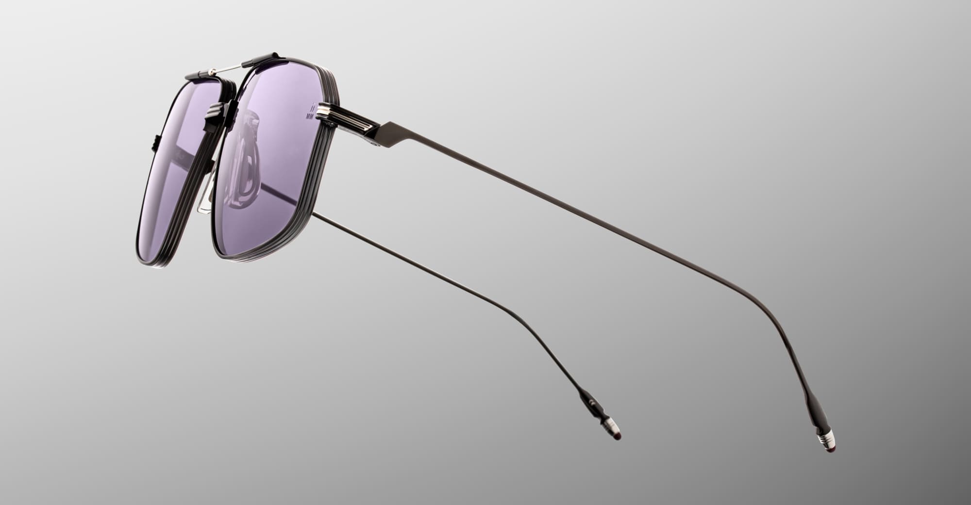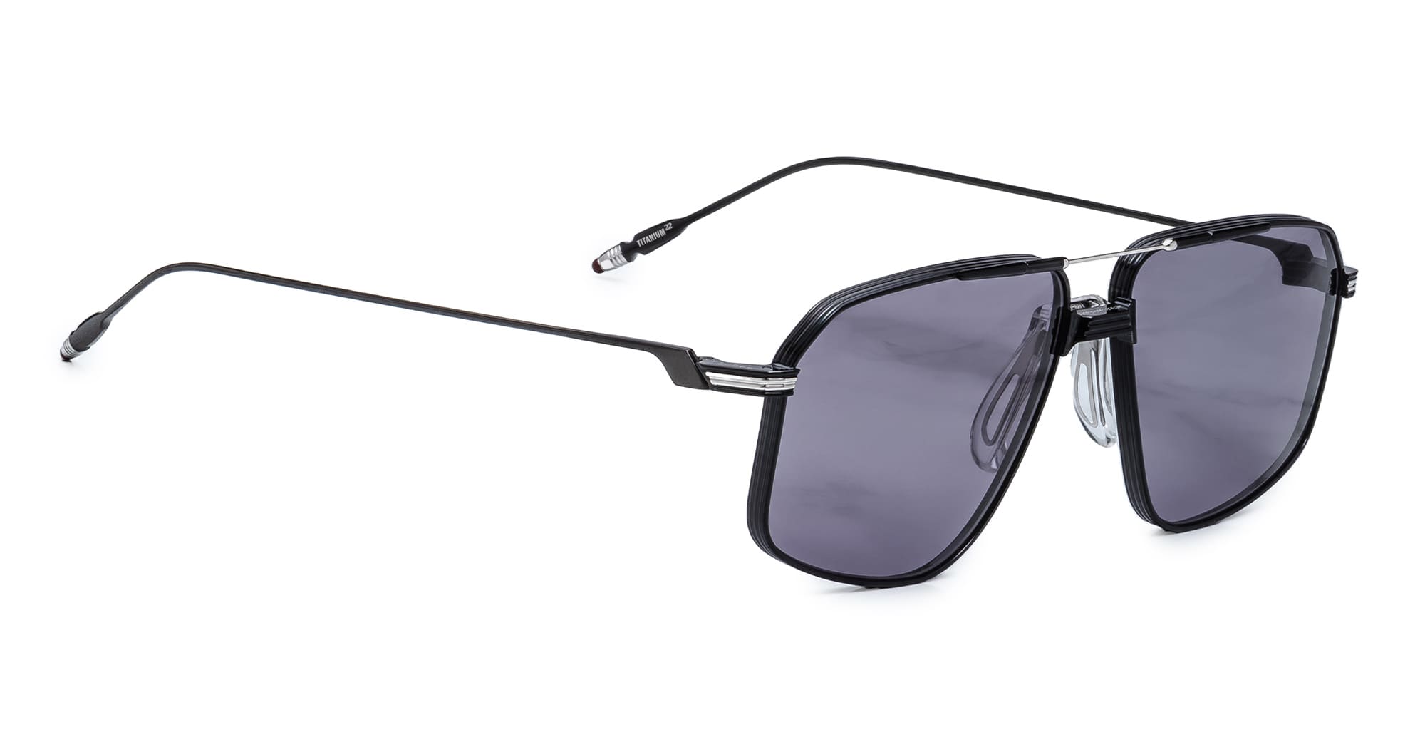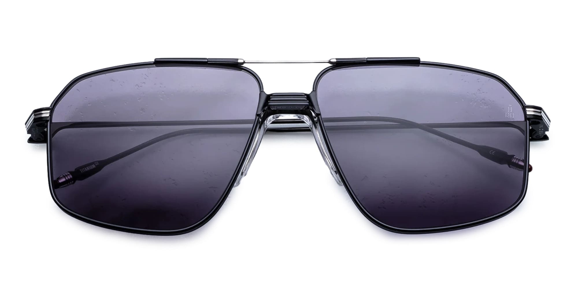 Jacques Marie Mage JAGGER - CORBAU (JMMJG-19J) are oversized late '70s-inspired aviator sunglasses with sculptural Art Deco-inspired double bridge. They feature matte black 100% beta titanium frame with silver accent, custom monoblock hinge construction, custom clear nose pads, silver and burgundy epoxy tailfin temple tips, nimbus 4 base CR39 lens with backside anti-reflective treatment and 100% UV protection.