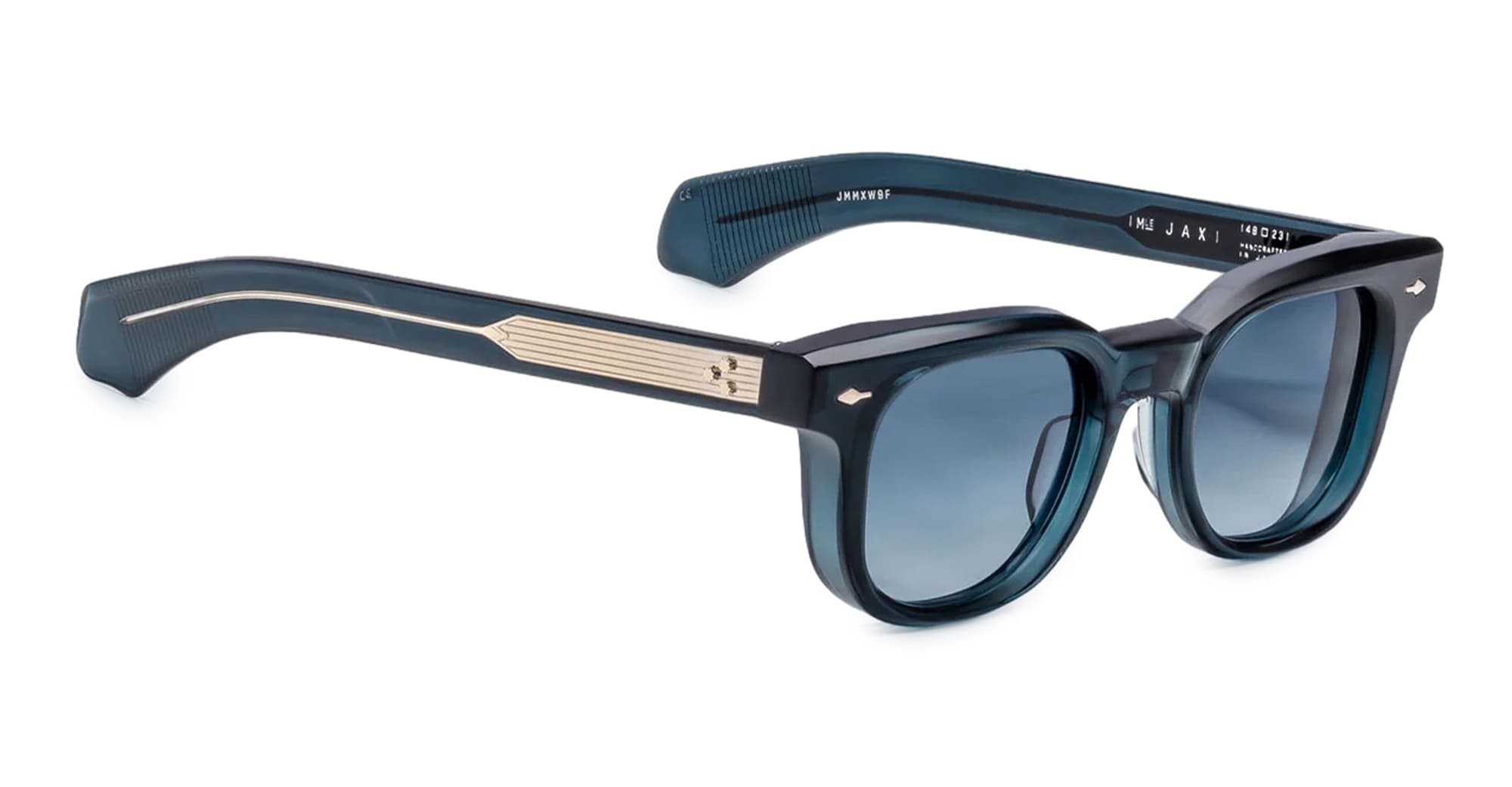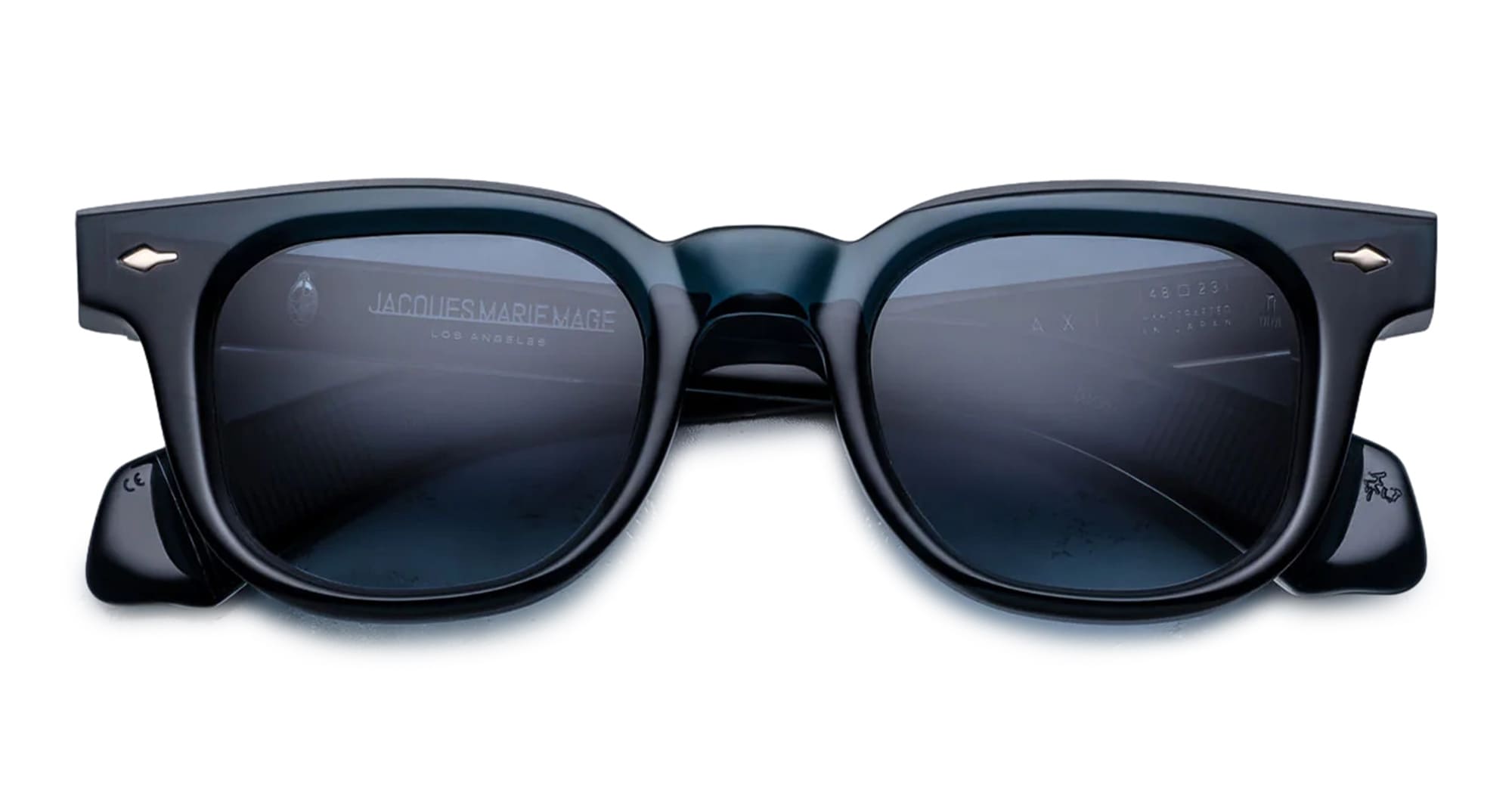 Jacques Marie Mage JAX 2 - INDIGO (JMMXW-9F) are elegant '50s-inspired classic sunglasses that pay homage to the mid-20th-century's art elite, a re-imagined version of the original Jax style from 2017.They feature 10mm indigo blue cured cellulose acetate frame, gold signature arrowhead front pin, exposed classic wirecore, tension-secured custom 7 barrel hinge with spur-shaped rivets, blue 4 base armorlite lens with backside anti-reflective treatment, 100% UV protection.