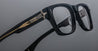 Last Frontier III Dayton Noir eyeglasses feature a 60s-inspired Wellington lens shape with distinctive beveling, classic Last Frontier adornments: silver arrowhead with brass at the temple, silver and dark gold thunderbird emblem ft. real turquoise, Chimayo textile-inspired filigree engraved wire core design, silver and dark gold tension-secured custom hinge ft. silver and dark gold brass arrow, burgundy Domed 3d metal cameo logo.