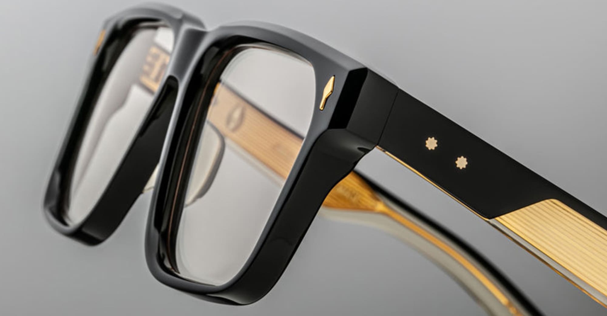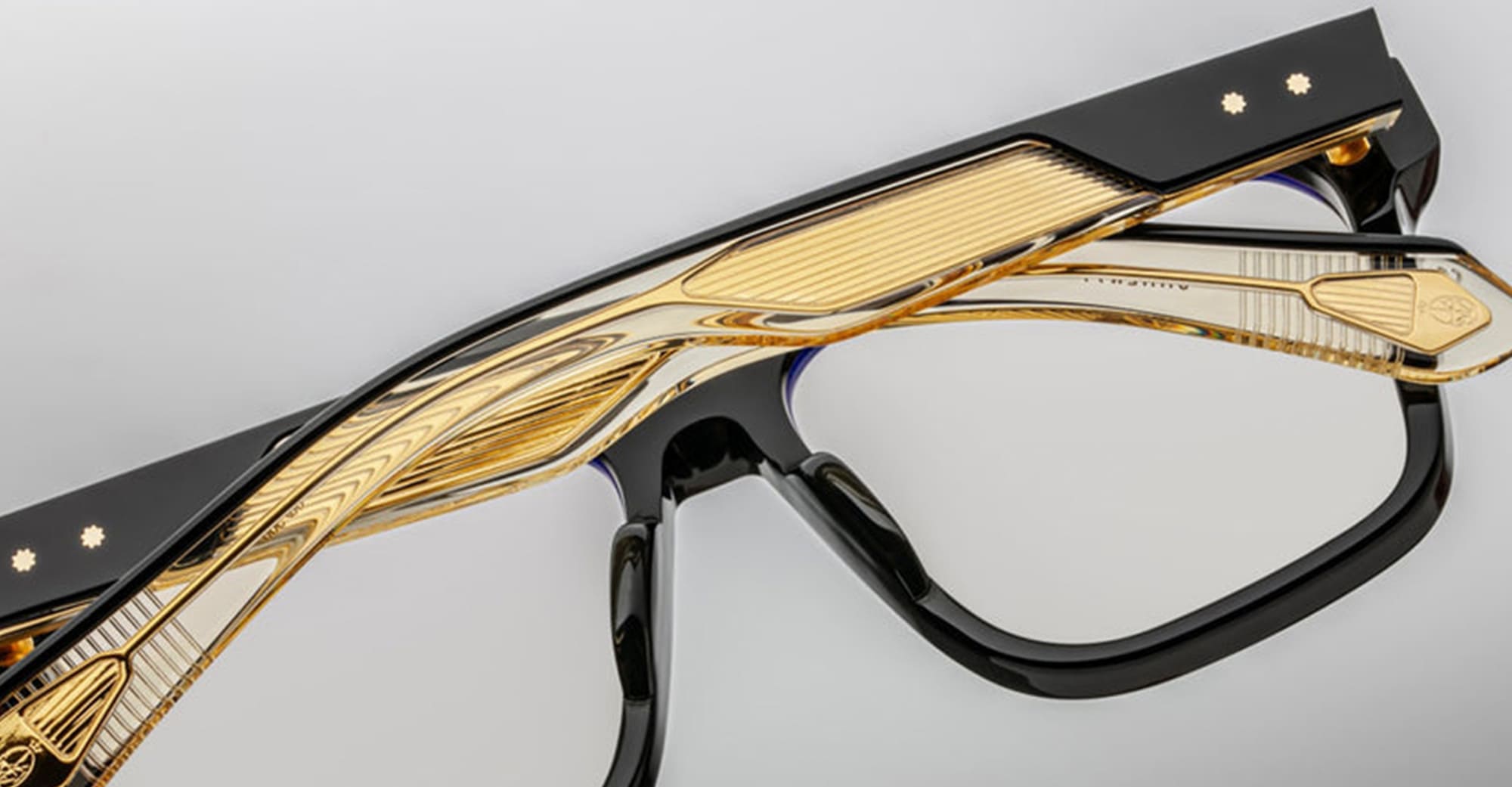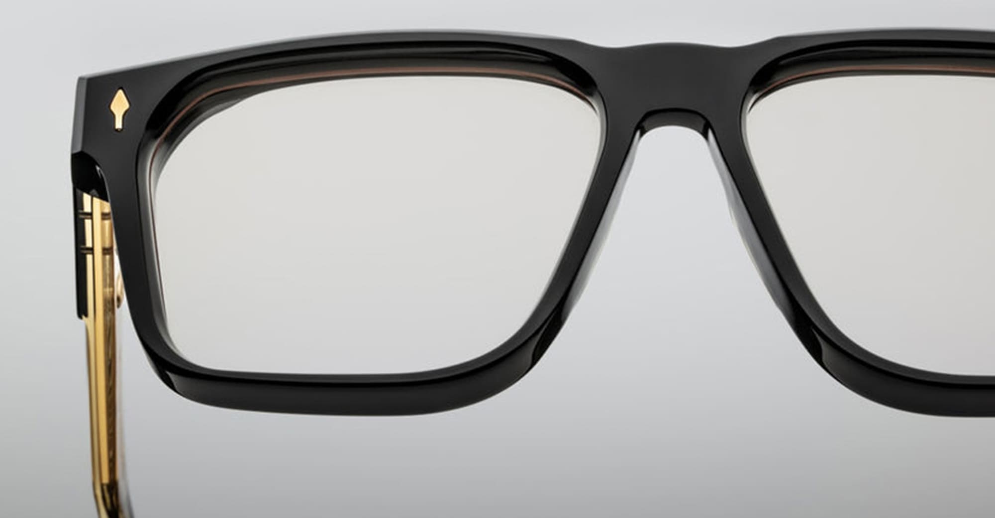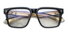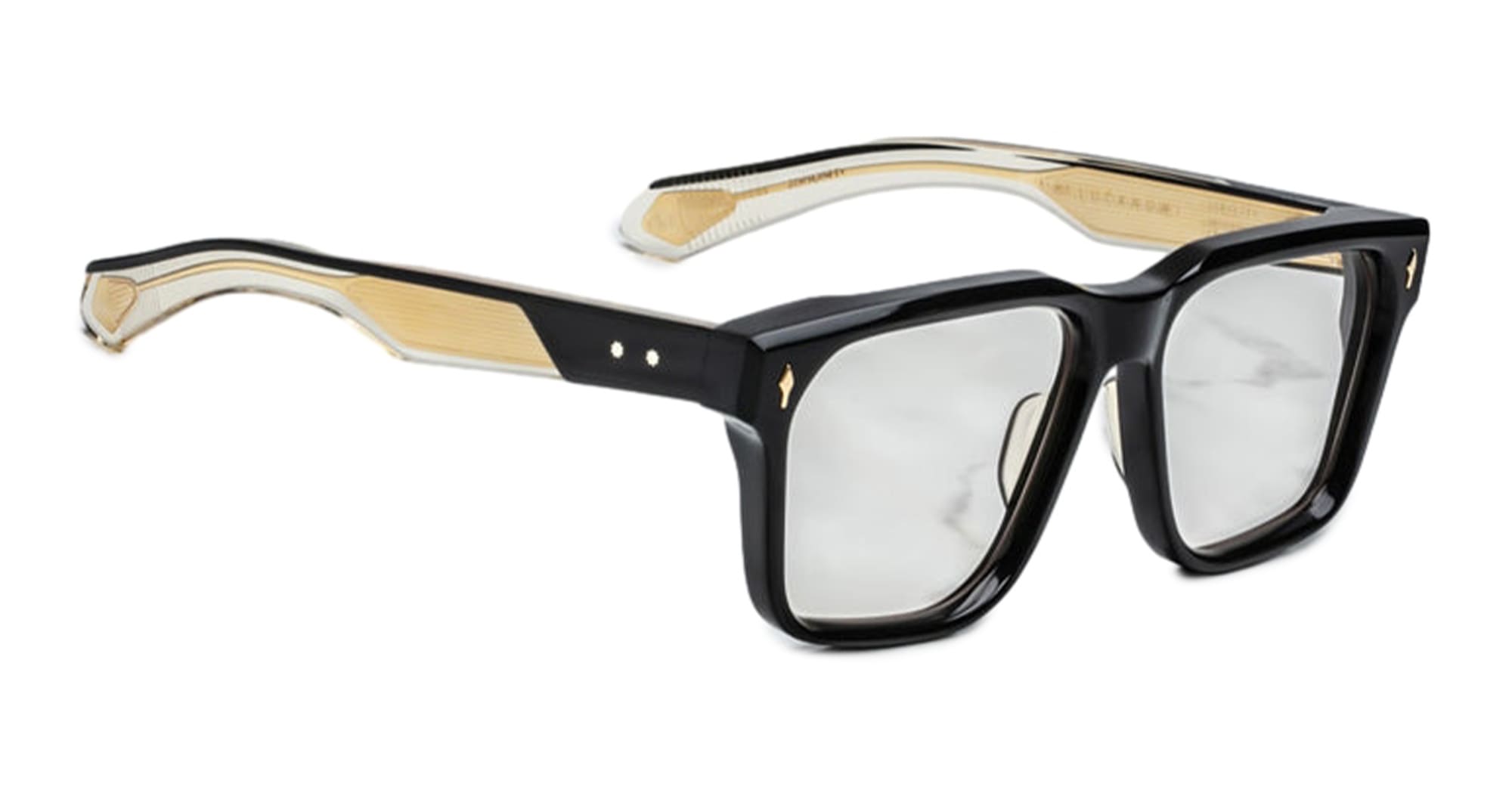 Jacques Marie Mage LUCKNOW - BELUGA RX (JMMLWRX-7T) are limited edition squared eyeglasses, made in Japan. They feature black 10mm cured cellulose acetate frame with sculptural volume cuts, double laminated acetate temples with precious metal hardware, exposed dark gold Art Deco-inspired wirecore, dark gold arrowhead front pins, custom tension-secured custom 5 barrel hinge.